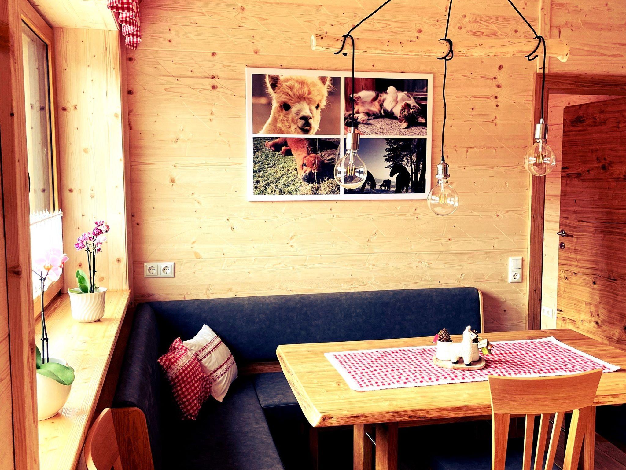 Gemütlich eingerichtete Ferienwohnung im Obergeschoss, aus heimischen Hölzern, mit Wachhund Charly und 40 Alpakas. Die Wohnung hat ca. 65m², aufgeteilt in einen großen Wohn-Essbereich mit voll ausgestatteter Küche. Zwei getrennte Schlafzimmer, ausgestattet mit einem Doppelbett, einem französischen Bett und einem Einzelbett. Ein Badezimmer mit großer Dusche, Waschtisch und viel Ablagefläche. Eigenes WC. Vorraum mit Garderobe und viel Verstaufläche. Ideal für 2 Erwachsene und/oder 2 - 3 Kinder.