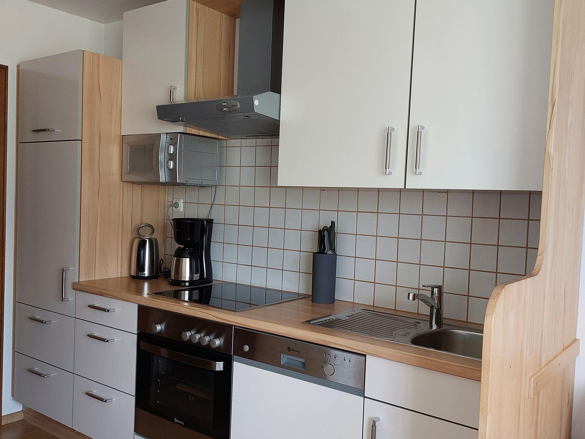 • Küche mit E-Herd, Backrohr, Kühlschrank, Mikrowelle, Wasserkocher, Geschirrspüler und allem wichtigen Geschirr.