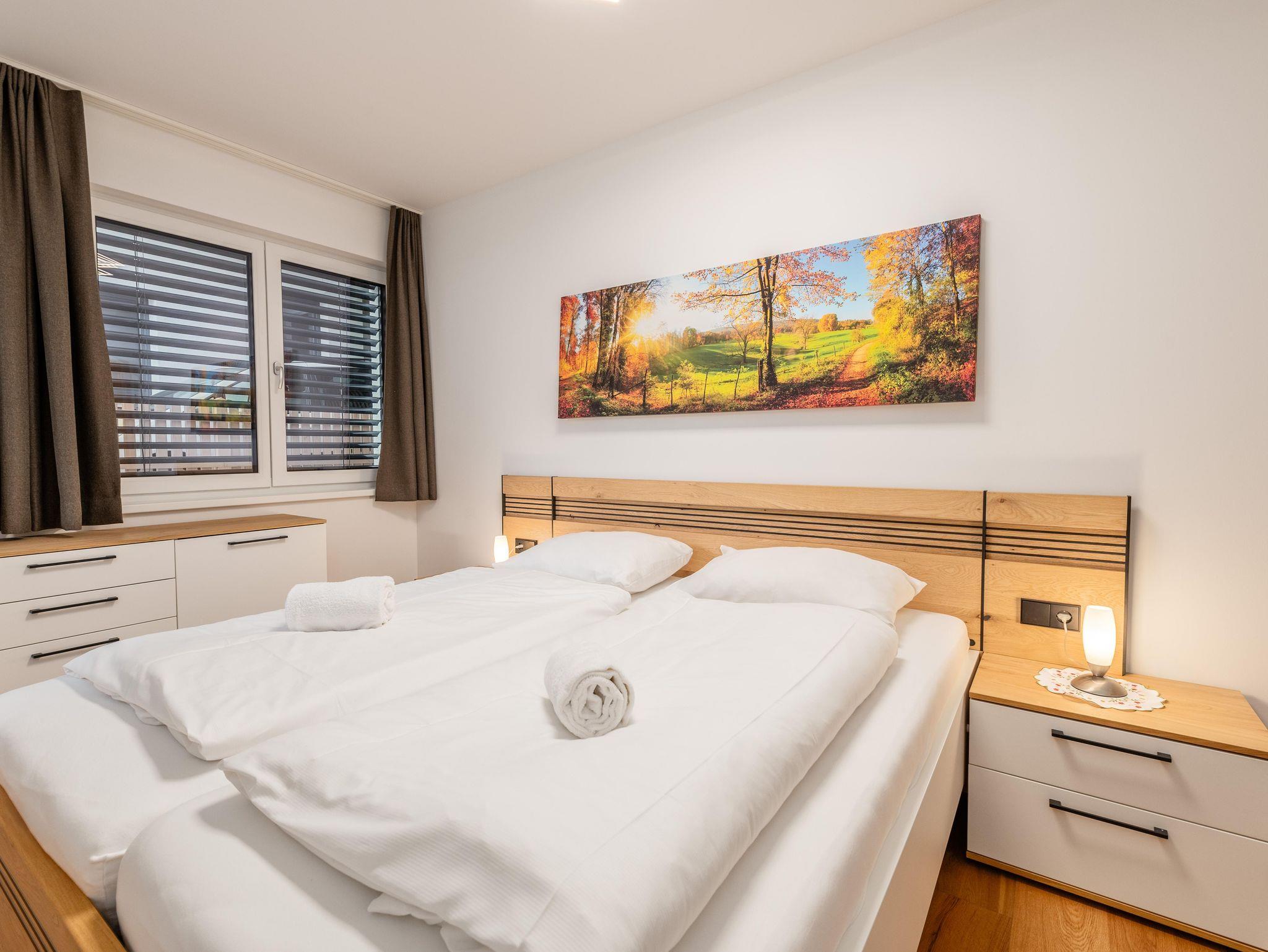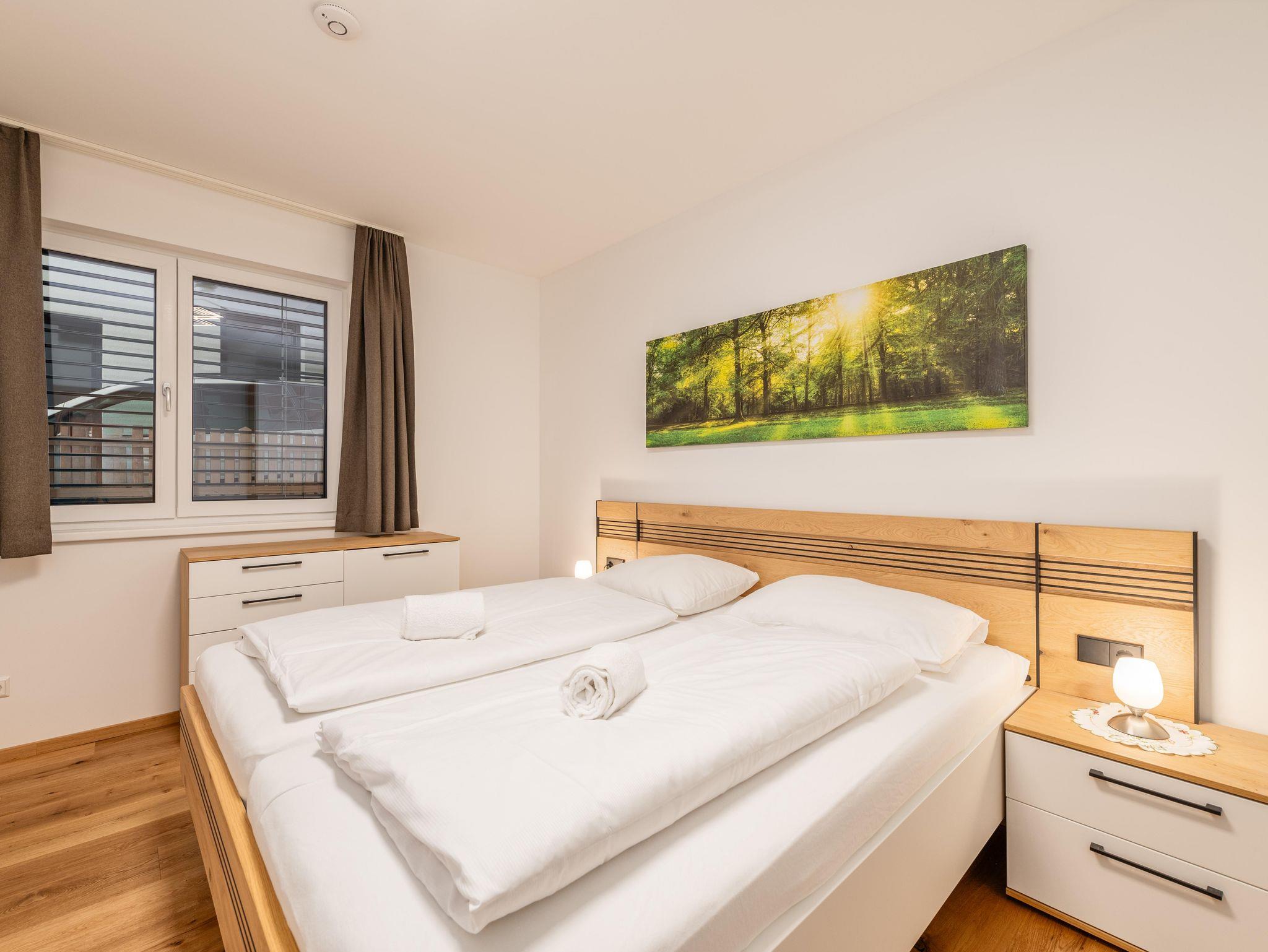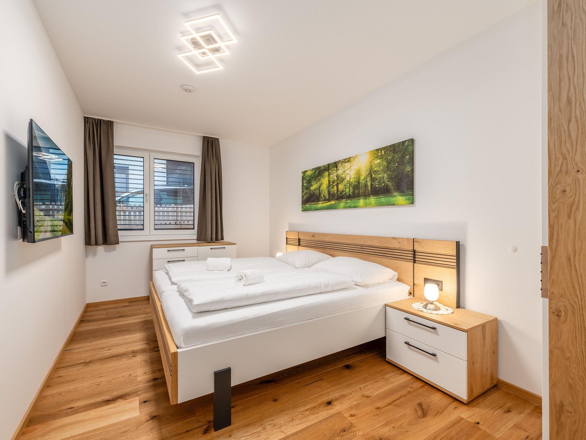 Das stilvoll eingerichtete Appartement mit 2 Schlafzimmern mit je einem Doppelbett sowie einer Couch im Wohnzimmer, bietet ingesamt Platz für bis zu sechs Personen. Jedes Zimmer verfügt über einen Smart-TV. Das großzügige Badezimmer ist ausgestattet mit einer großen Dusche und Doppelwaschbecken – ideal für Paare oder Familien.
