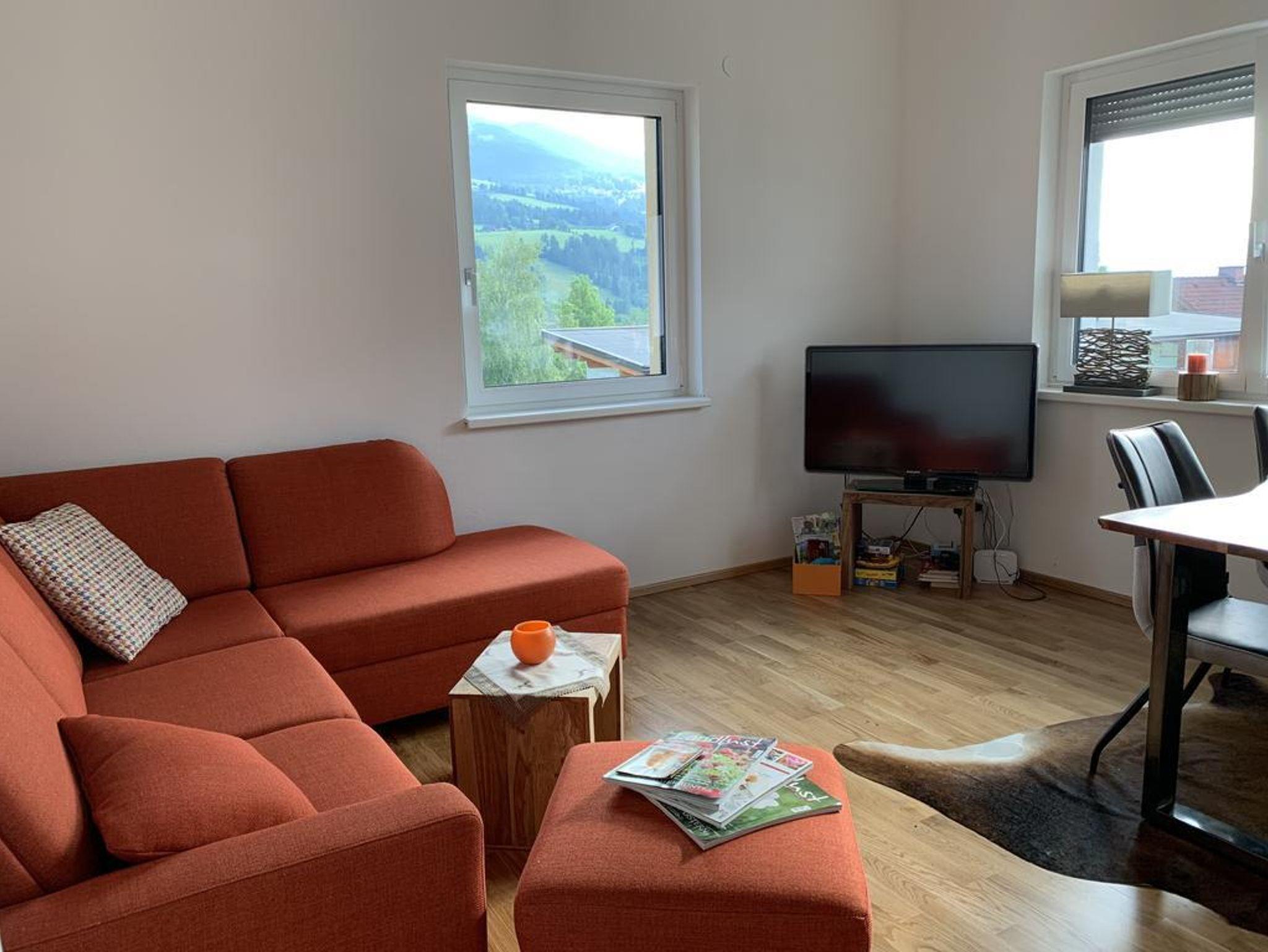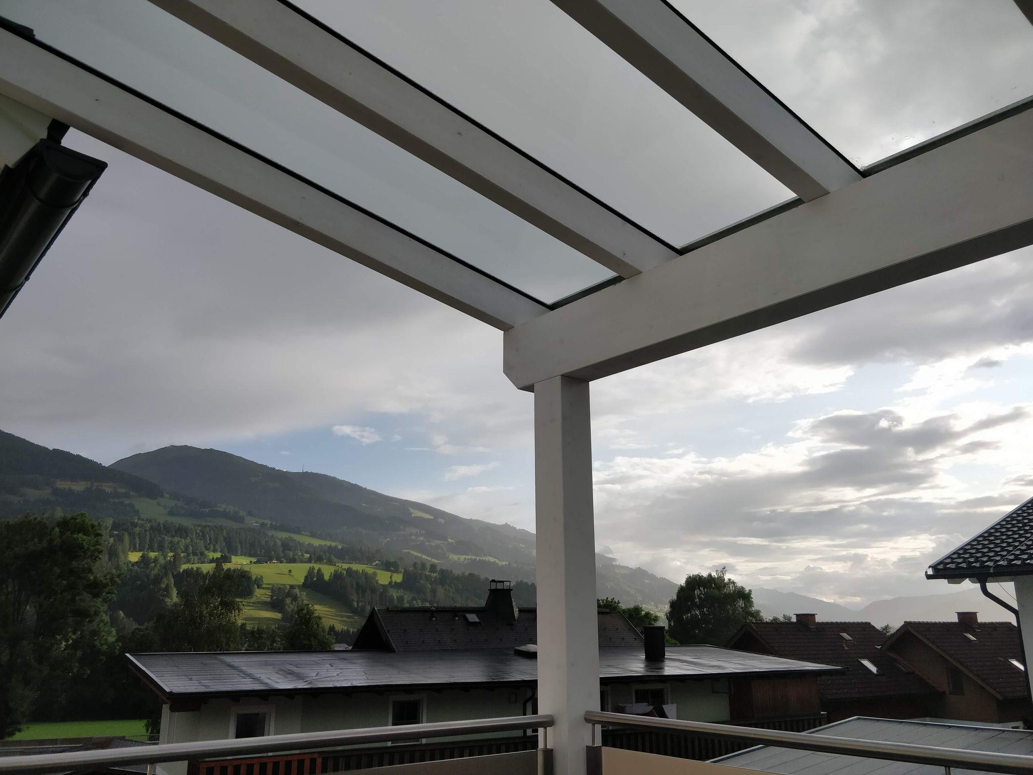 Nagelneu erbaute Ferienwohnung im 1. OG. Die Wohnung - alles ebenerdig, auch der Duschbereich - ist mit einer Fußbodenheizung, Isolierglasfenster, Küchenzeile mit Spülmaschine und kleinem Gefrierfach ausgestattet. Ceranfeld mit 4 Platten und ein Backofen runden die Küche ab. In der Wohnung befinden sich 2 Schlafzimmer, ein separates WC, ein Badezimmer und ein großes Wohnzimmer mit einer ca. 14 m² großen, überdachten Terasse mit Sitzmöbeln. Die Terasse ist Richtung Berge ausgerichtet, sodass man jederzeit die herrliche Alpenlandschaft mit dem Hauser Kaibling, Stoderzinken und den Dachstein sehen kann.