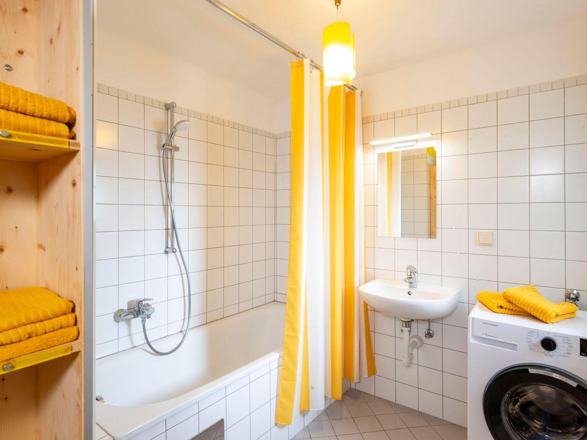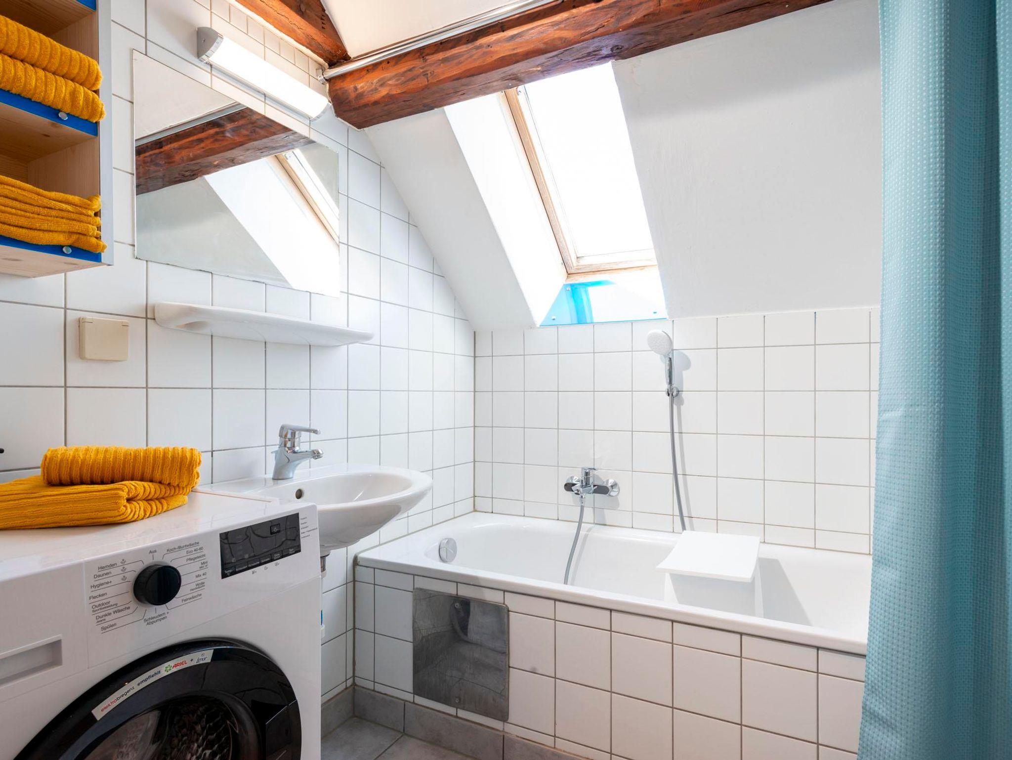 Das Apartment verfügt über ein Badezimmer mit Badewanne und Waschmaschine.