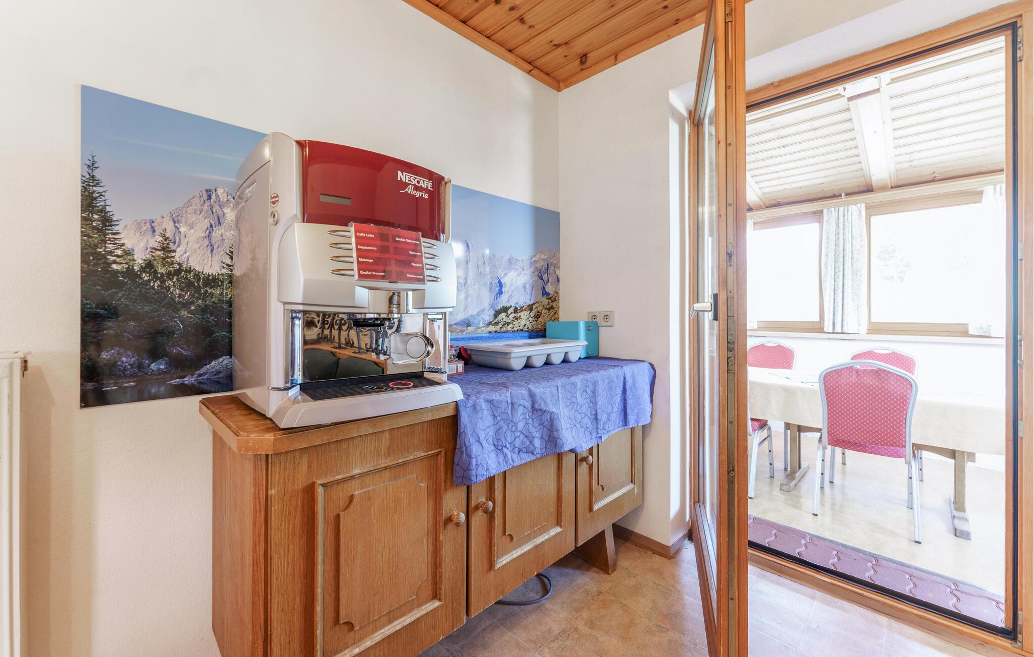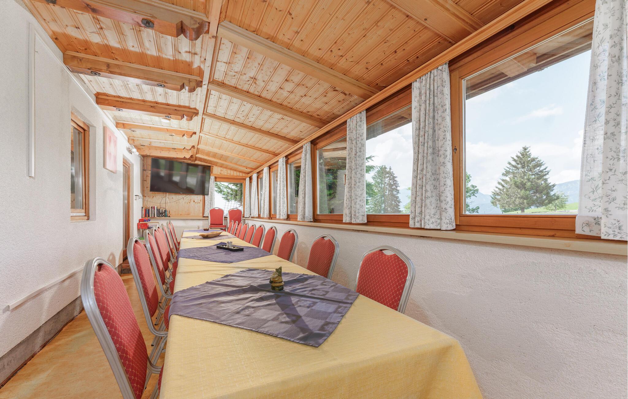 Freuen Sie sich auf Ihren Urlaub in dieser einladenden Unterkunft. Das Ferienhaus bietet Ihnen ausreichend Platz für eine große Gruppe oder mehrere Familien und besticht durch seine idyllische und ruhige Lage. Die Einrichtung kombiniert charmante, alpine Tradition mit modernem Komfort und sorgt für ein warmes und einladendes Ambiente. Das große Esszimmer mit Blick auf die Berge lädt zu geselligen Abenden ein und lässt Sie gemeinsam Ihre nächsten Aktivitäten planen.