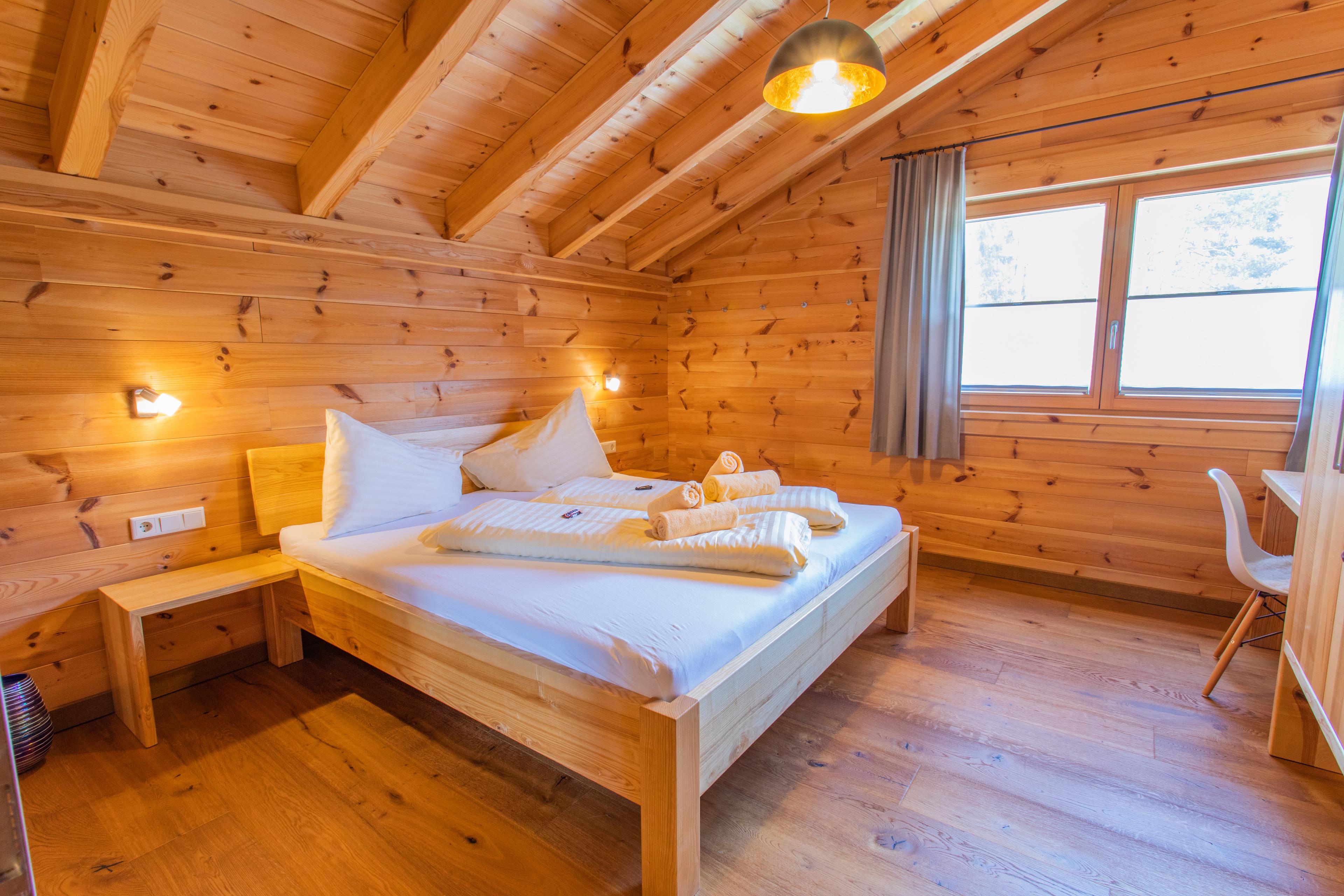 Drei Schlafzimmer im alpinen Stil sorgen mit komfortablen Massivholzbetten für erholsamen Schlaf. Jedes Zimmer ist zudem mit einem eigenen Fernseher ausgestattet. Zwei moderne Badezimmer mit stilvollen Holz- und Natursteinelementen runden das harmonische Gesamtbild ab.