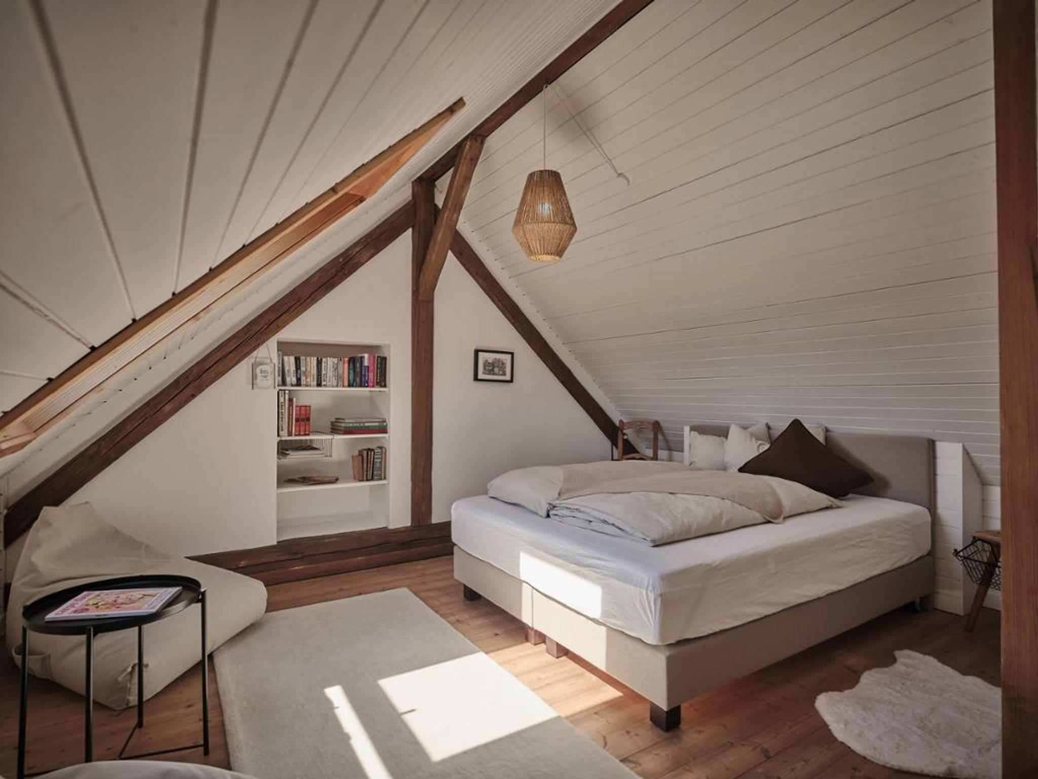Die Ferienwohnung Blumenwiese hat ca. 90 m2 und ist mit Boden- und Wandheizung ausgestattet. Die Wohnung ist sehr großzügig mit einem modernen Badezimmer, WC separat. Im Obergeschoß befindet sich das Schlafzimmer mit Panorama-Dachfenster und Boxspring-Doppelbett. Die Stube mit vollwertiger Küche hat einen eigenen Gartenausgang und eine weitere Schlafgelegenheit. Wir haben keine Schlafcouch, sondern ein vollwertiges Bett, das zur Couch umfunktioniert wird. Unsere Betten sind alle 160 cm breit.