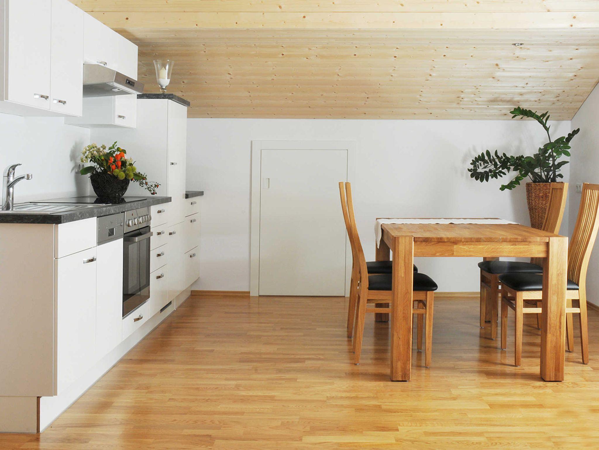 Unsere geräumige Ferienwohnung im 1. Obergeschoss bietet Platz für 5 Personen und verfügt über eine komplett eingerichtete Wohnküche mit gemütlicher Sitzecke.