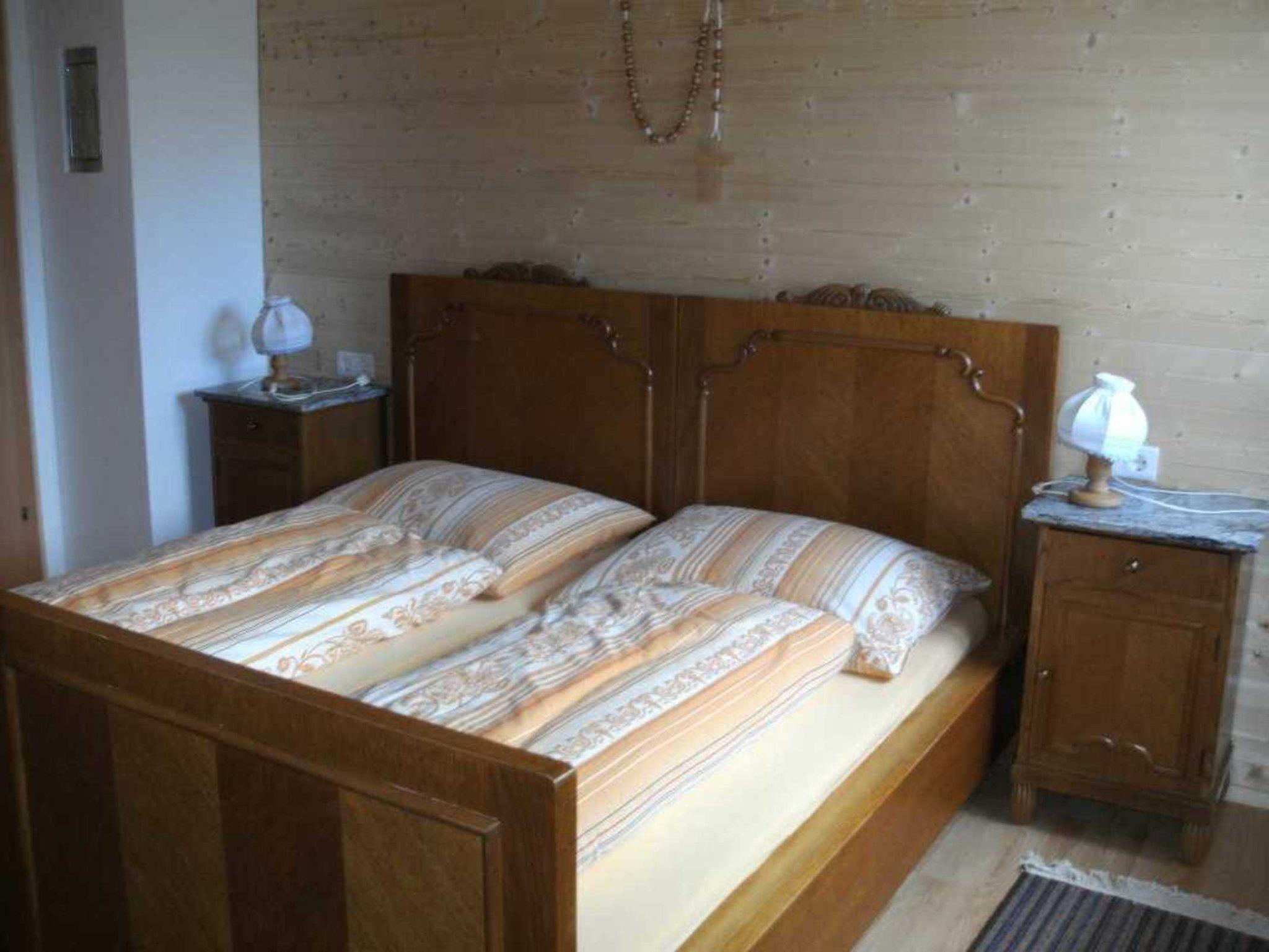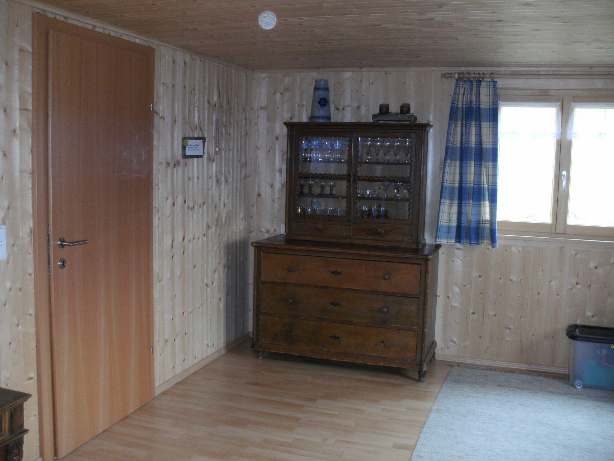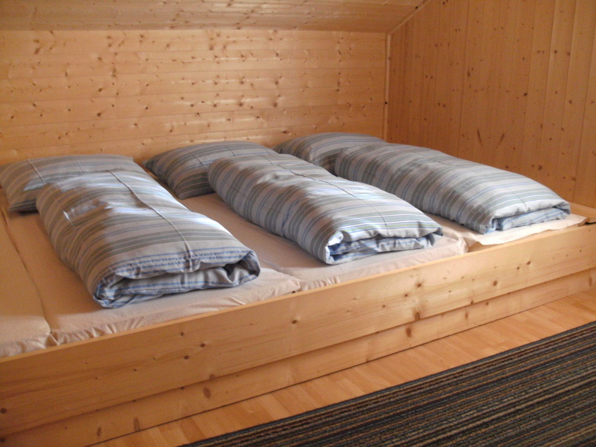 1 Doppelbettzimmer und ein Schlafraum mit Matratzenlager sowie einem ausziehbaren Doppelbett. Im Freien ist eine Liegewiese und eine Sonnenterrasse.