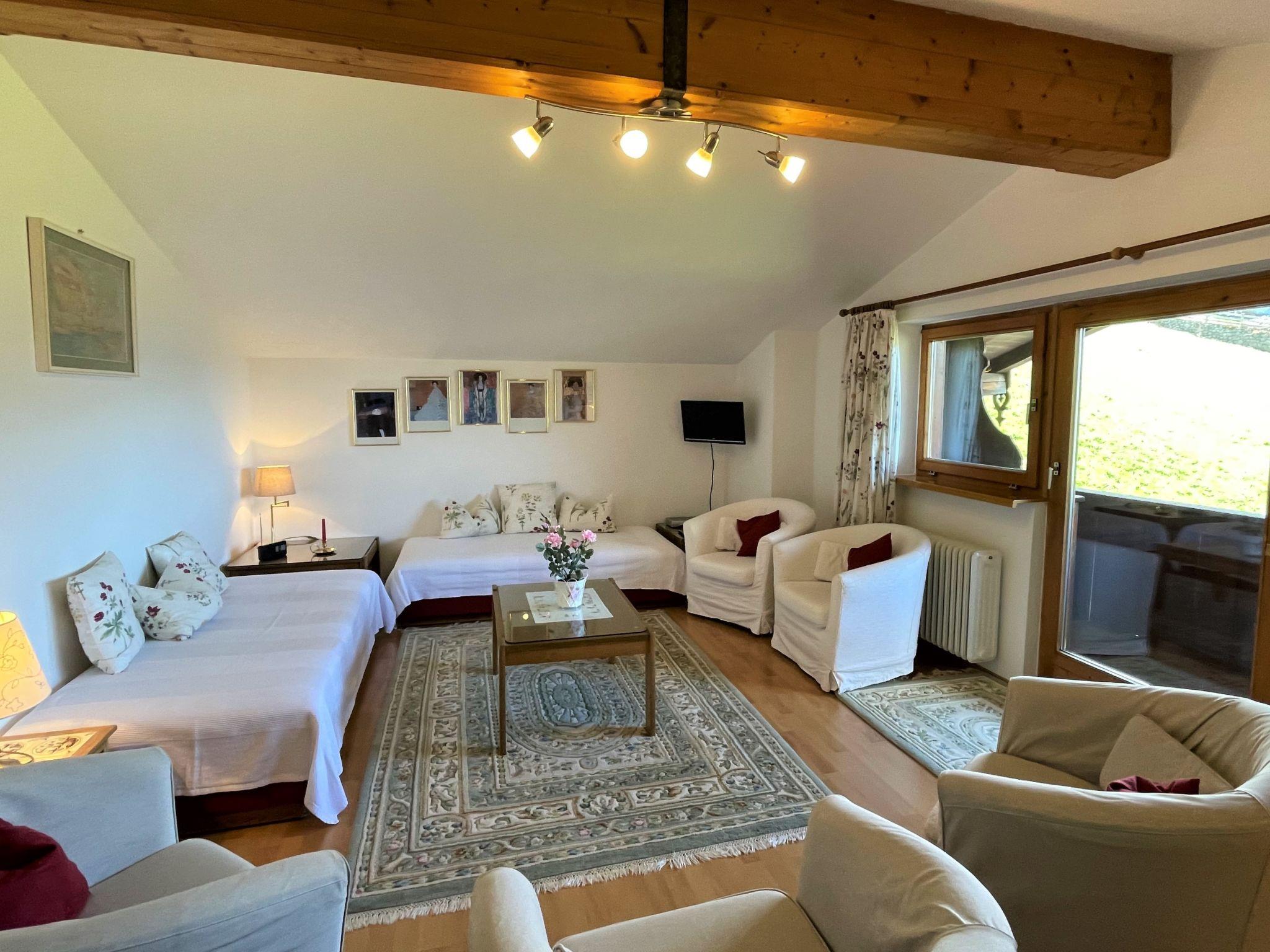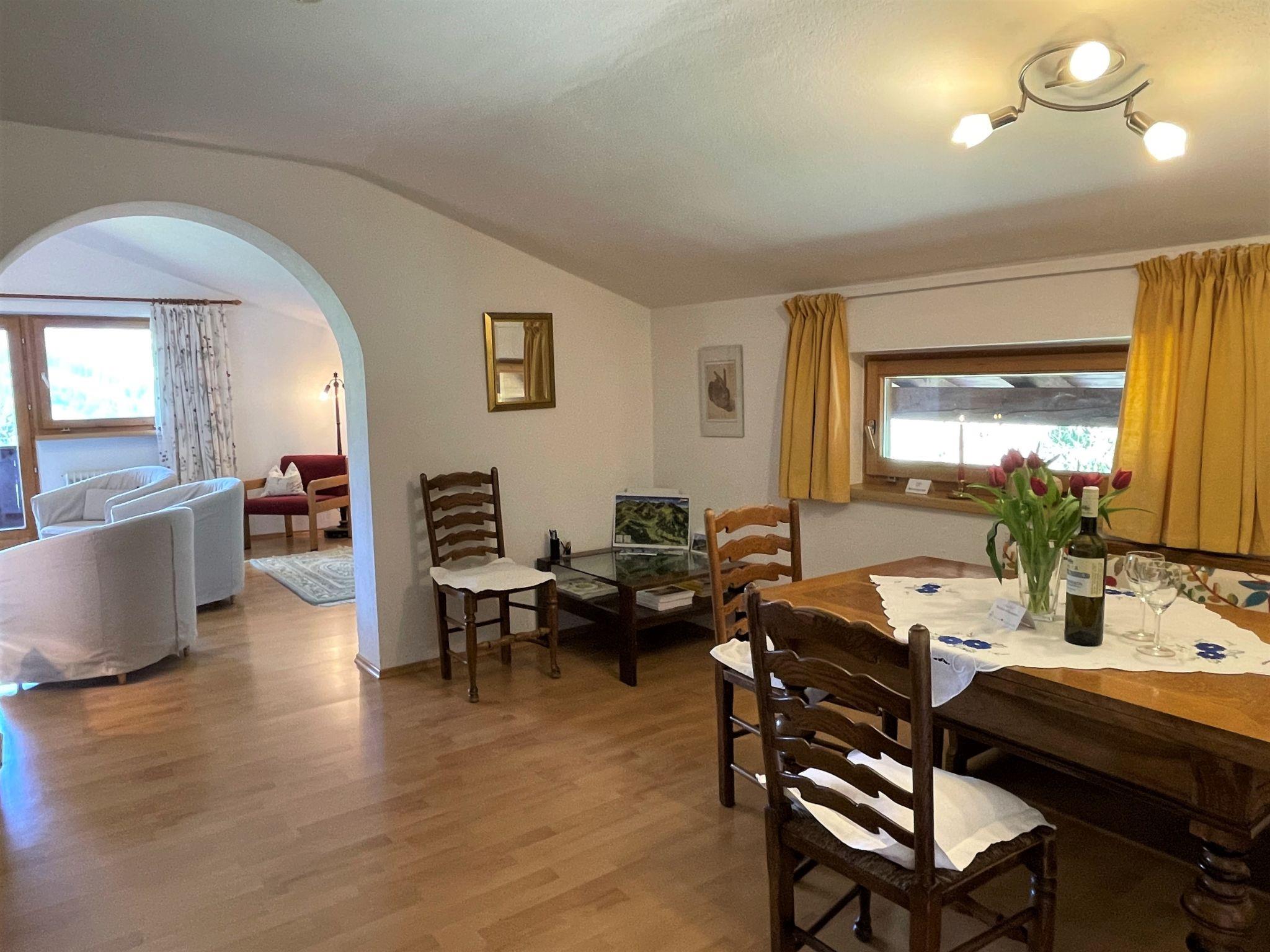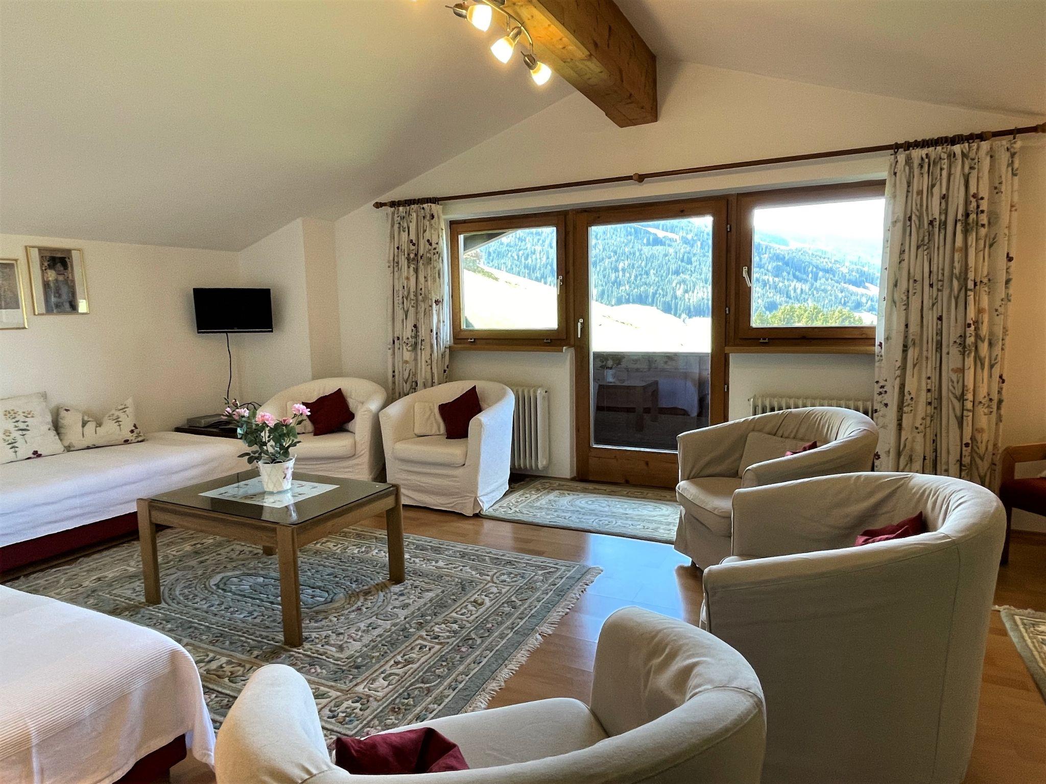3-room apartment 87 m2, on the top floor. Spacious and bright, partly with sloping ceilings, beautiful furnishings: open living room with satellite TV and radio. Exit to the balcony. 1 double bedroom with hand-basin. 1 room with 3 beds. Exit to the balcony. Open dining room with dining nook. Kitchen (4 hot plates, oven, dishwasher, toaster, kettle, microwave, electric coffee machine) with hatch. Bath/WC, sep. WC. Balcony, south-west facing position. Balcony furniture. Very beautiful panoramic view of the mountains and the valley. Facilities: children's high chair. Internet (WiFi, free). Please note: smoke alarm.