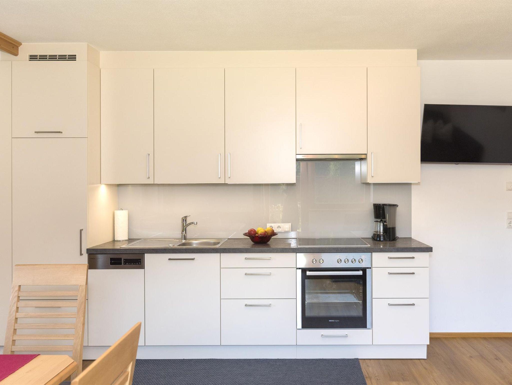 Die Küche ist ausgestattet mit Elektroherd und Backrohr, Kühlschrank, Geschirrspülmaschine, Wasserkocher, Frühstückstoaster, Kaffeemaschine, Kochtöpfe & Pfanne, Geschirr, Gläser & Besteck.