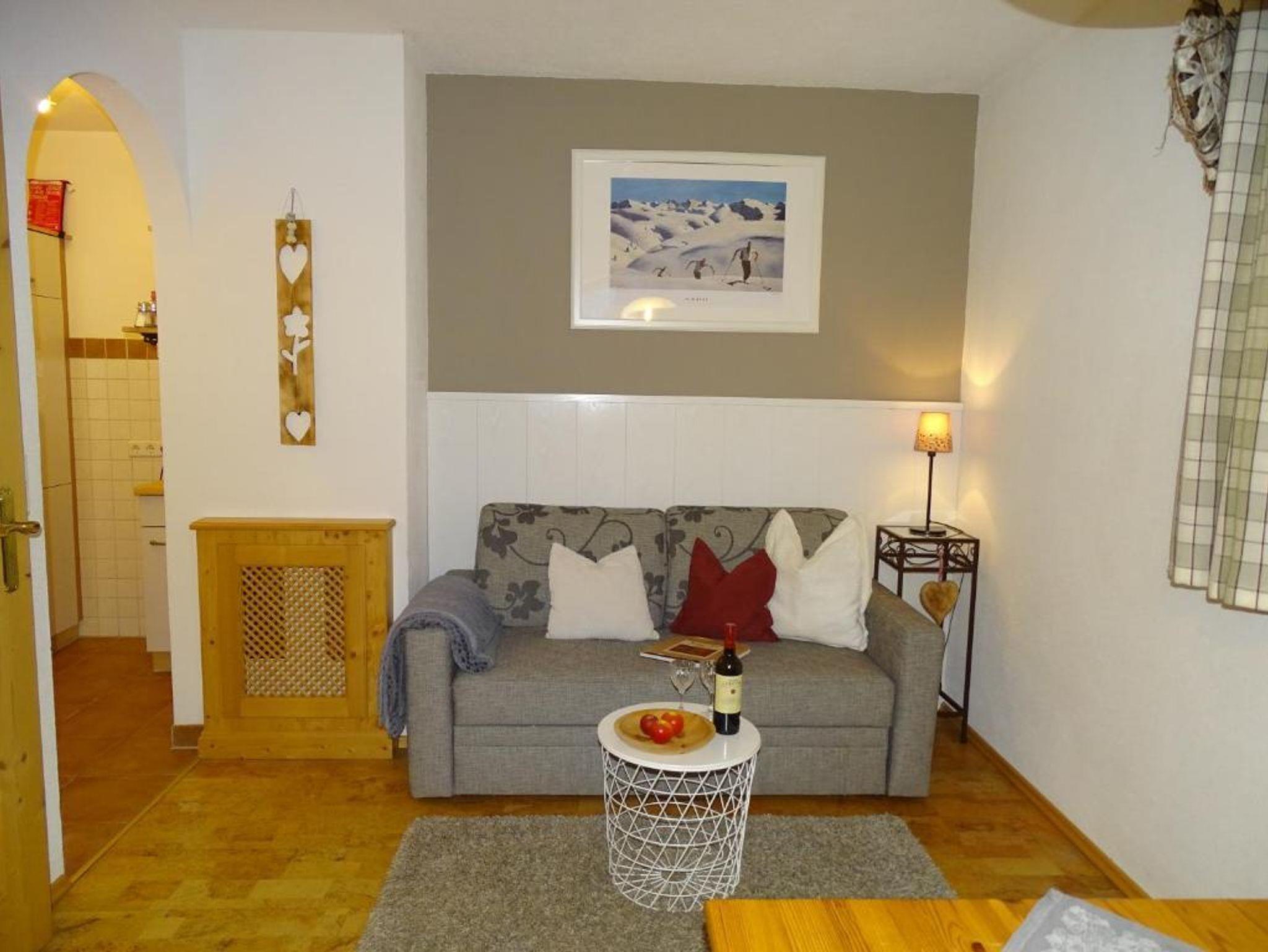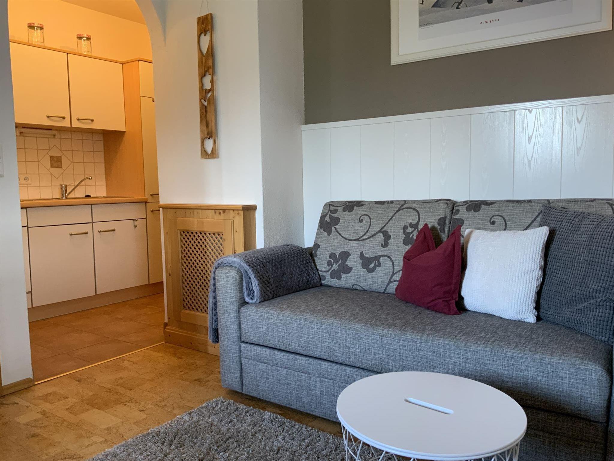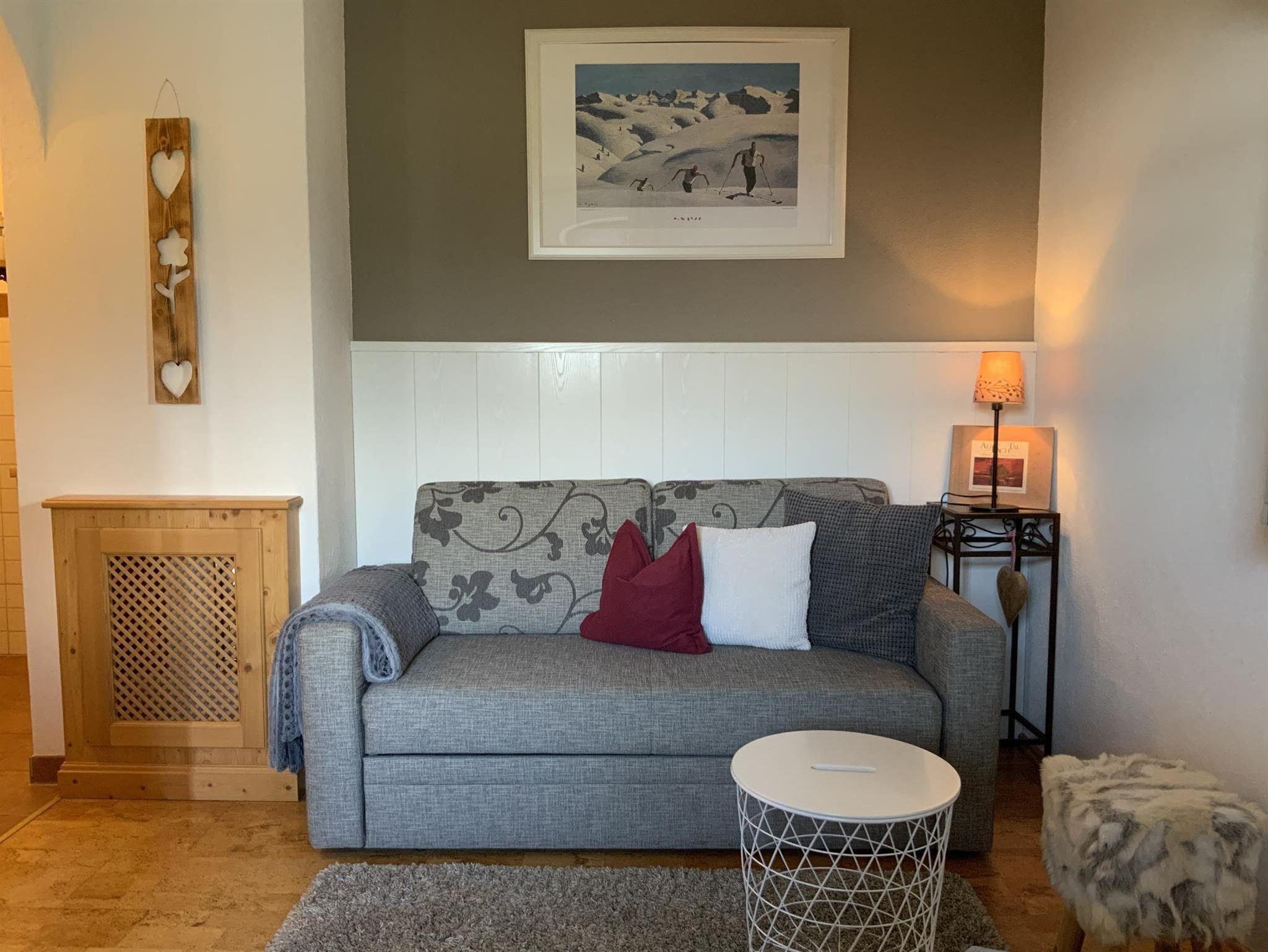 Sie wohnen in einem gemütlichen Appartement mit 1 Schlafzimmer und einer Schlafcouch im Wohnzimmer.