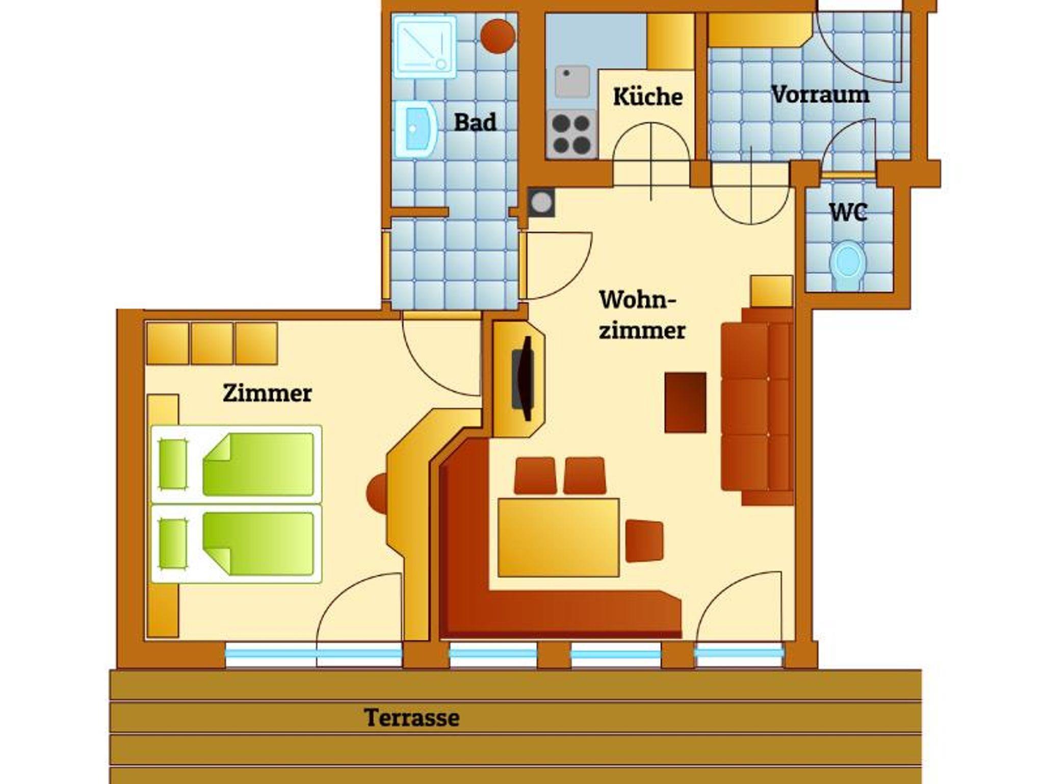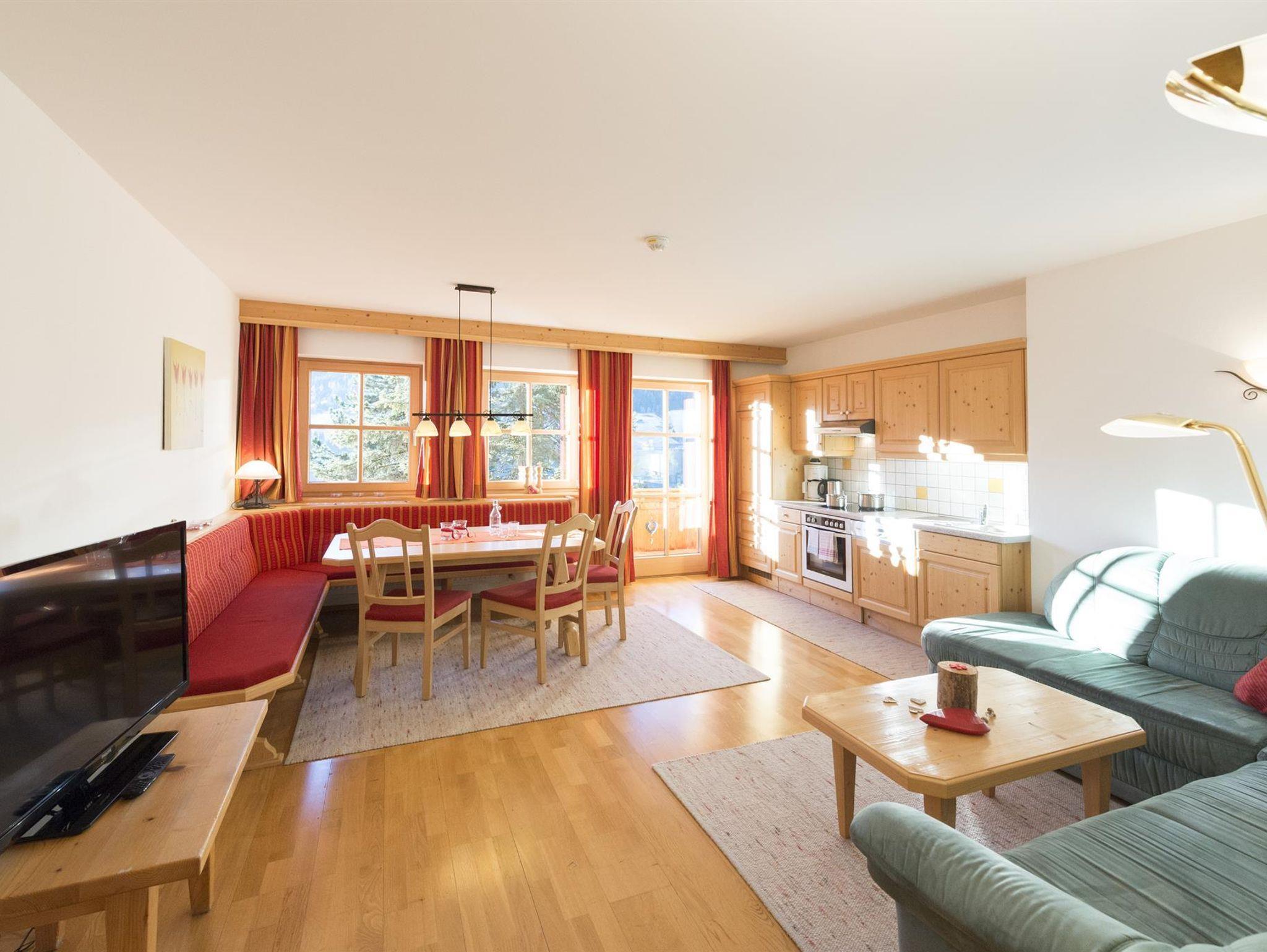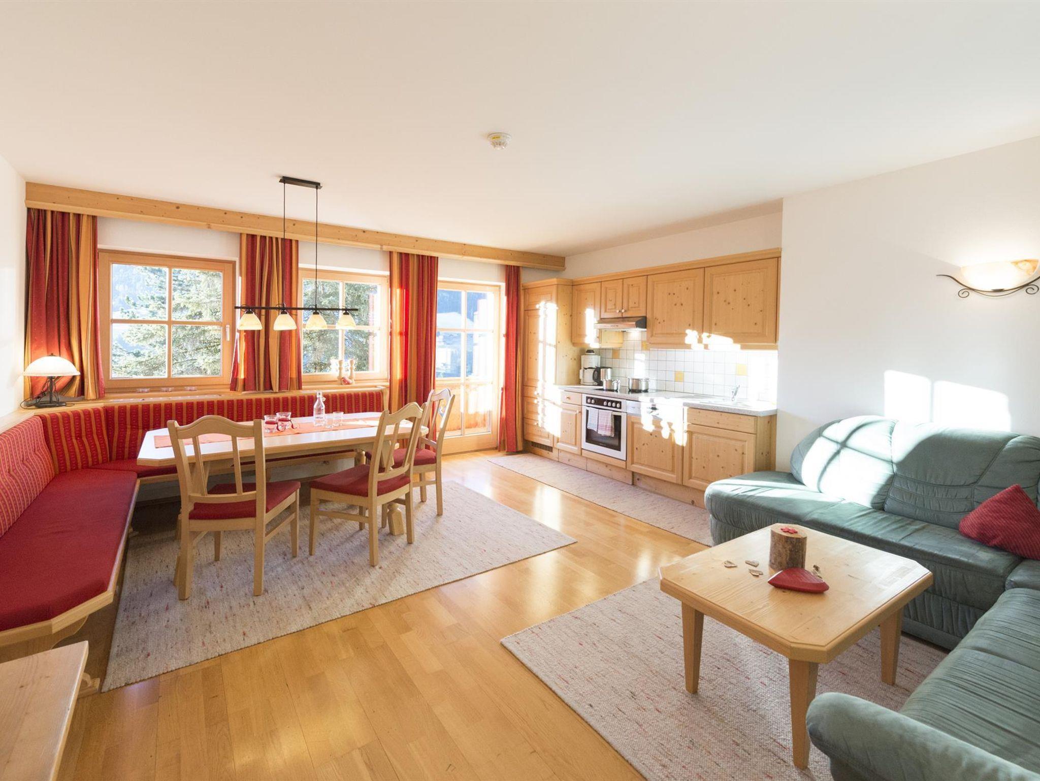 Genießen Sie großzügigen Wohnkomfort mit zwei Schlafzimmern (ein 3-Bettzimmer, ein 3-4 Bettzimmer), einer Küche mit Wohnbereich und einer ausziehbaren Couch. Das Appartement verfügt weiters über ein eigenes Badezimmer mit Dusche / WC sowie ein Badezimmer mit Bad / WC.
