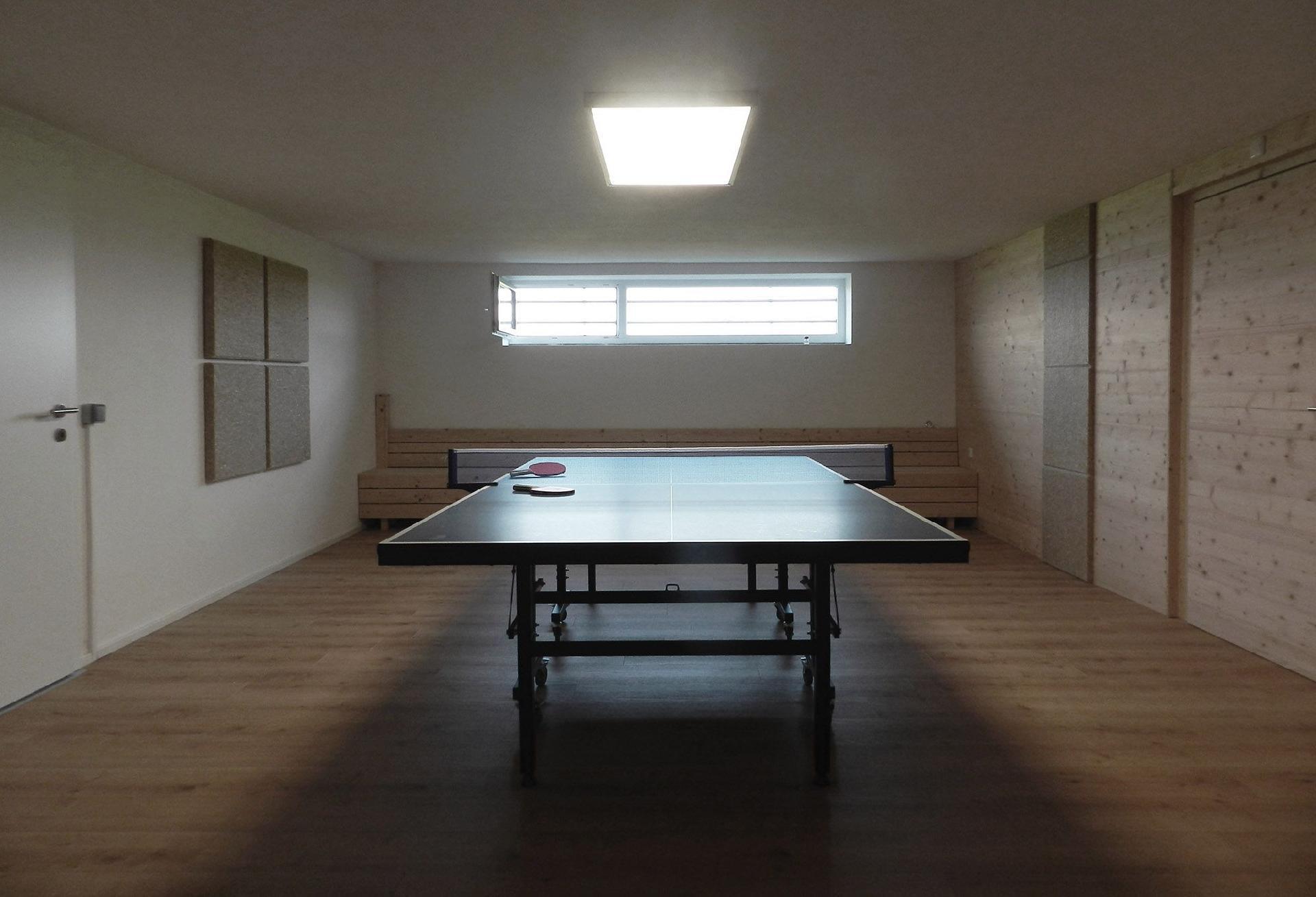 Directly from the wellness area you step out onto the pool terrace, where a cosy lounge set and sun loungers invite you to relax and the 9 m long saltwater pool invites you to take a dip. The pool can also be used with the cover, like an indoor pool, so that nothing stands in the way of bathing fun even on rainy days.For the children there is, apart from the pool, lots of fun in the large garden. Two swings, a climbing frame, a children's playhouse, bobby cars and a children's play kitchen are available for the little ones, while for older guests there is a football table and an electronic dartboard in the table tennis room next to the table tennis table.