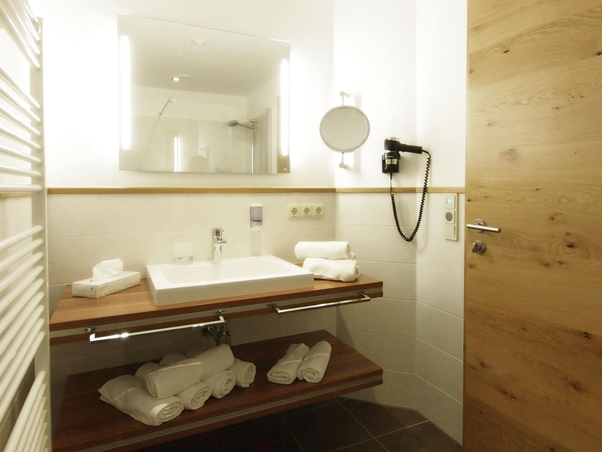 Modernes Badezimmer mit Dusche, Föhn, Kosmetikspiegel sowie Handtuchtrockner.