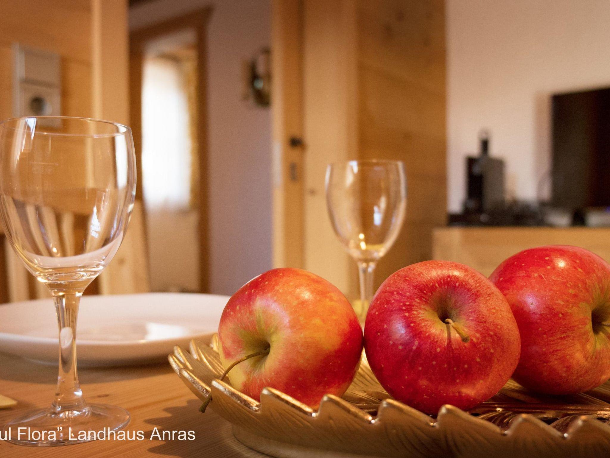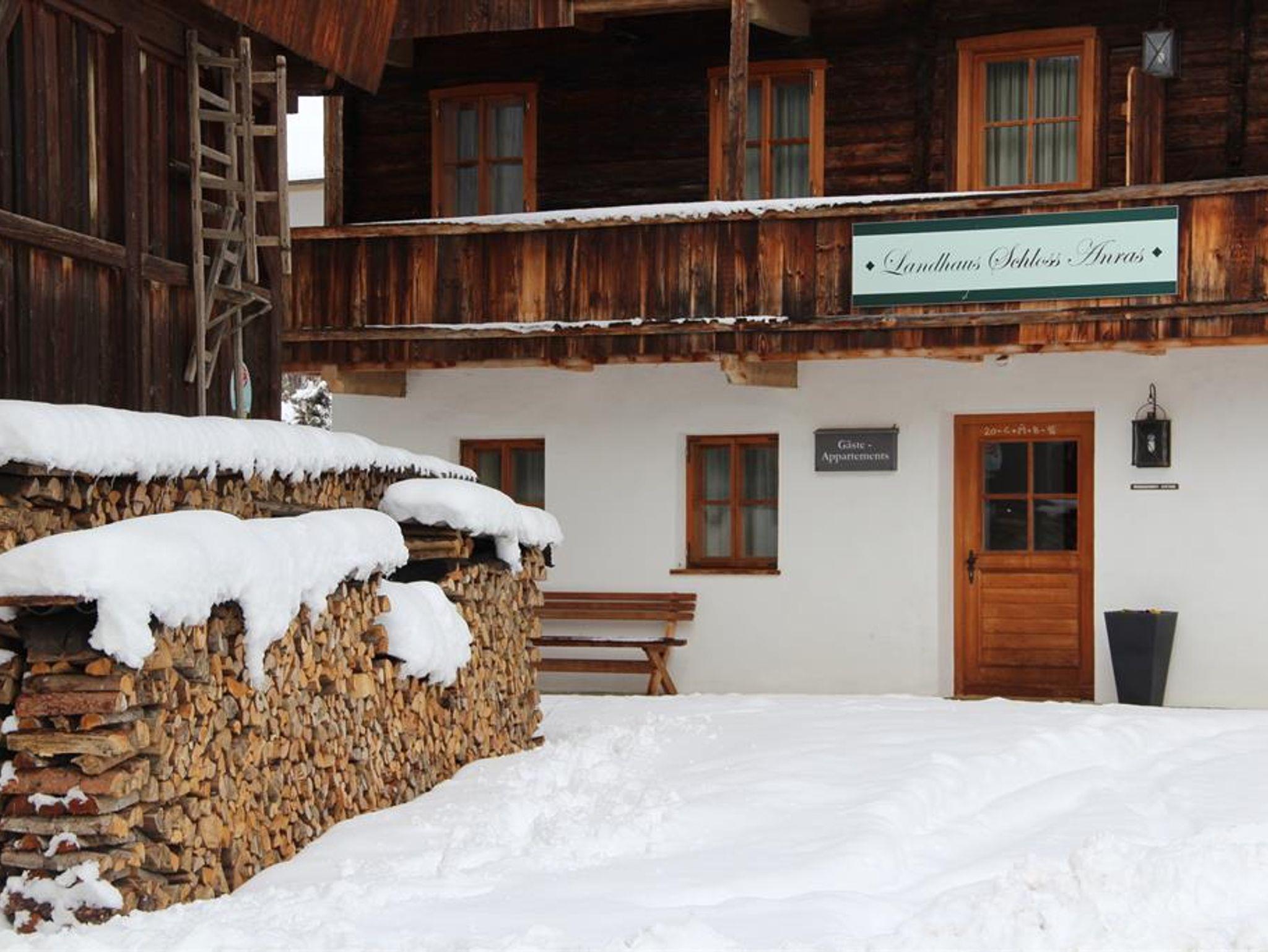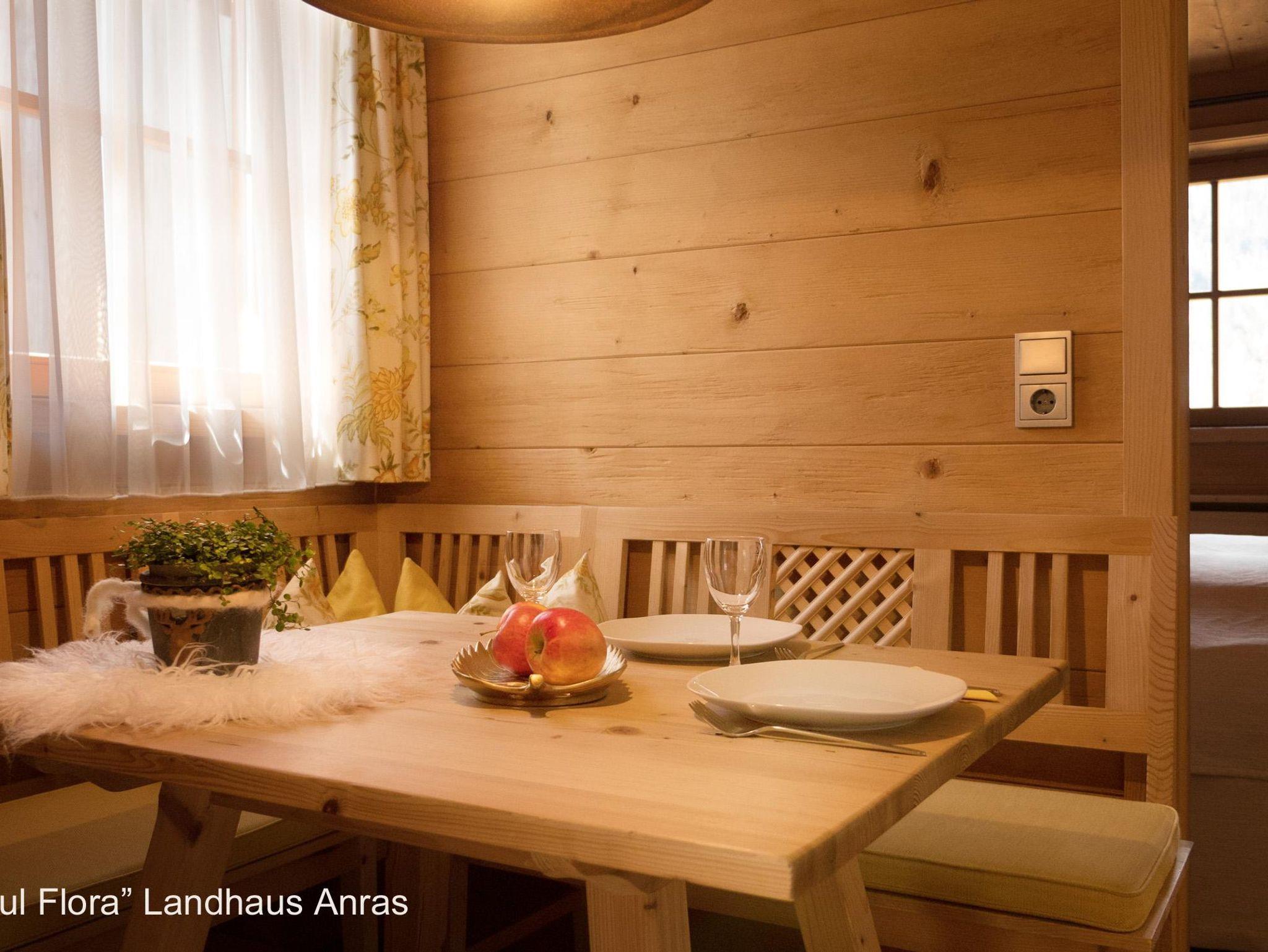 Besonders schön durch die handbehauene Holztäfelung und den Südbalkon mit Balkonmöbeln zum Entspannen in der Sonne, mit Blick auf das prachtvolle Schloss Anras. Doppelbett, Bad mit Wanne, komplette Küche. Ein zauberhaftes Wohlfühl-Appartment für Zwei