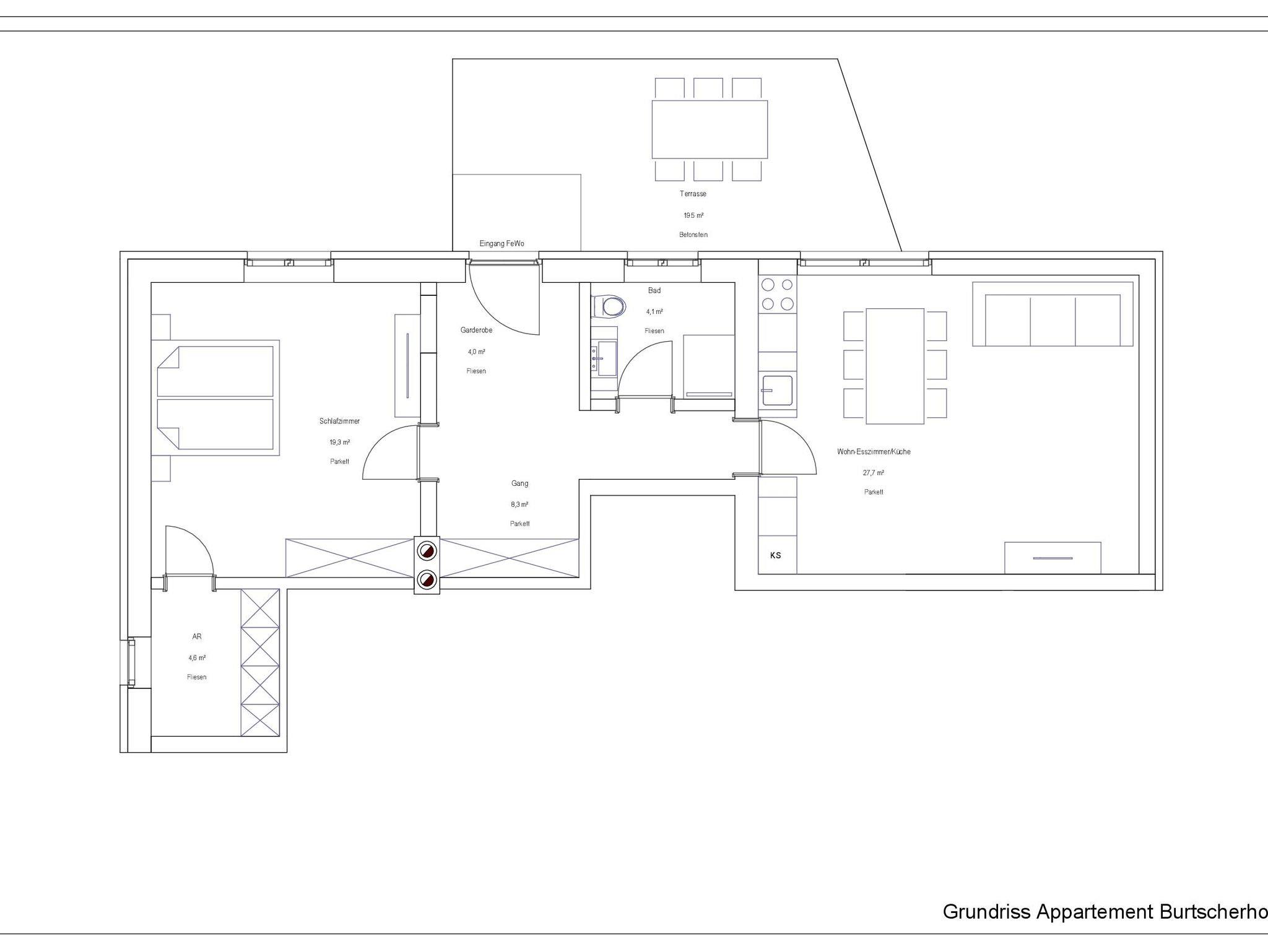Die Ferienwohnung befindet sich im neu renovierten Mehrgenerationenhaus mit eigenem Eingang. Neues, 73 m² großes, hochwertig ausgestattetes 2-Zimmer-Appartement mit Wohnküche (ca. 30 m²) inklusive Bettsofa und separatem Schlafzimmer mit Doppelbett. Mit Dusche und WC und einem Abstell-/Trockenraum. Gemütliche, eigene Terrasse direkt vor dem Appartement.
