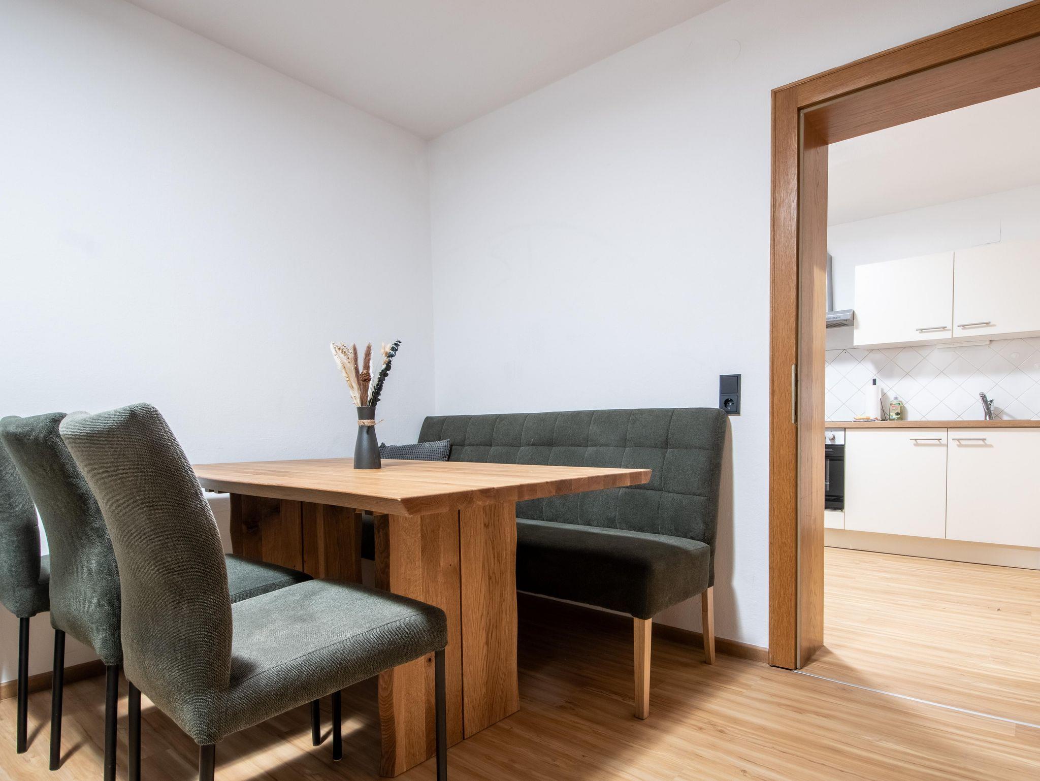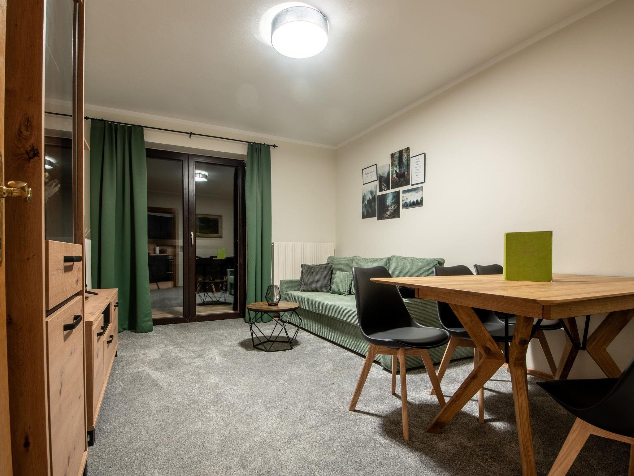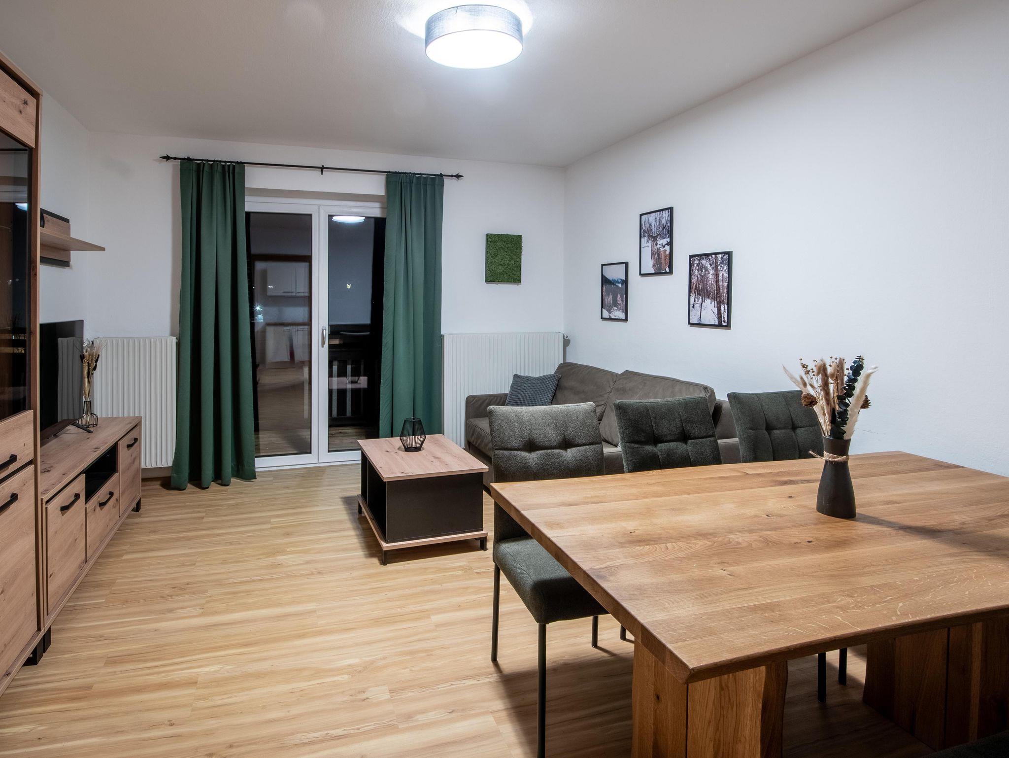 RAUM FÜR ENTSPANNUNG UND GESELLIGKEIT Das großzügige Gamskarkogel Appartement, ideal für 4 bis 6 Personen, verfügt über separate Schlafbereiche, eine vollausgestattete Küche und ein Wohnzimmer mit einem Esstisch für 6 Personen. Genießen Sie den Komfort von getrennten Bad- und WC-Bereichen und entspannen Sie auf dem Balkon. Die naturnahe Einrichtung mit lebendigen Moosakzenten unterstreicht unser Engagement für Nachhaltigkeit und Wohlbefinden.