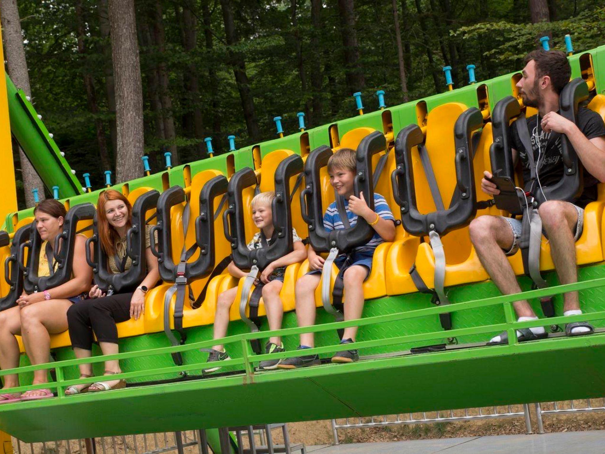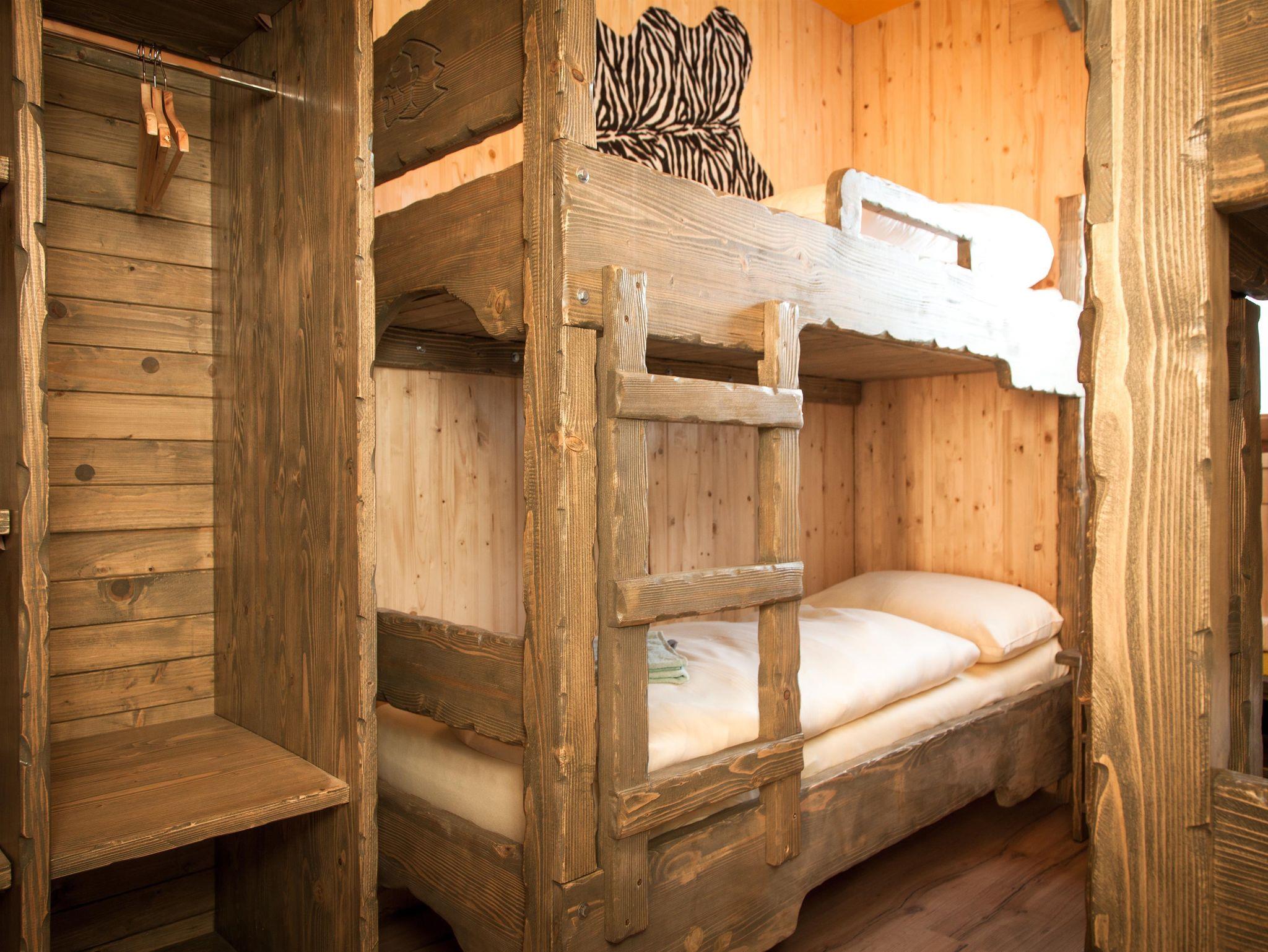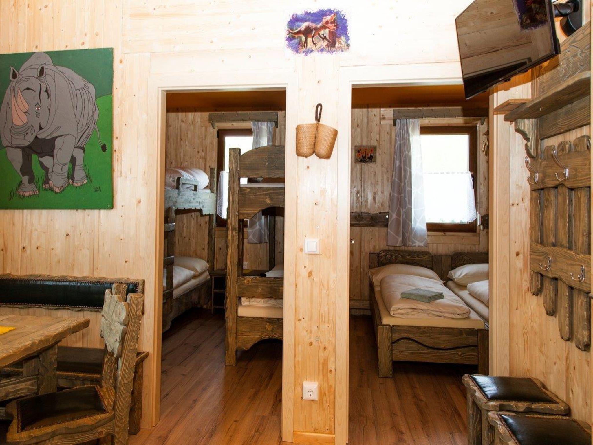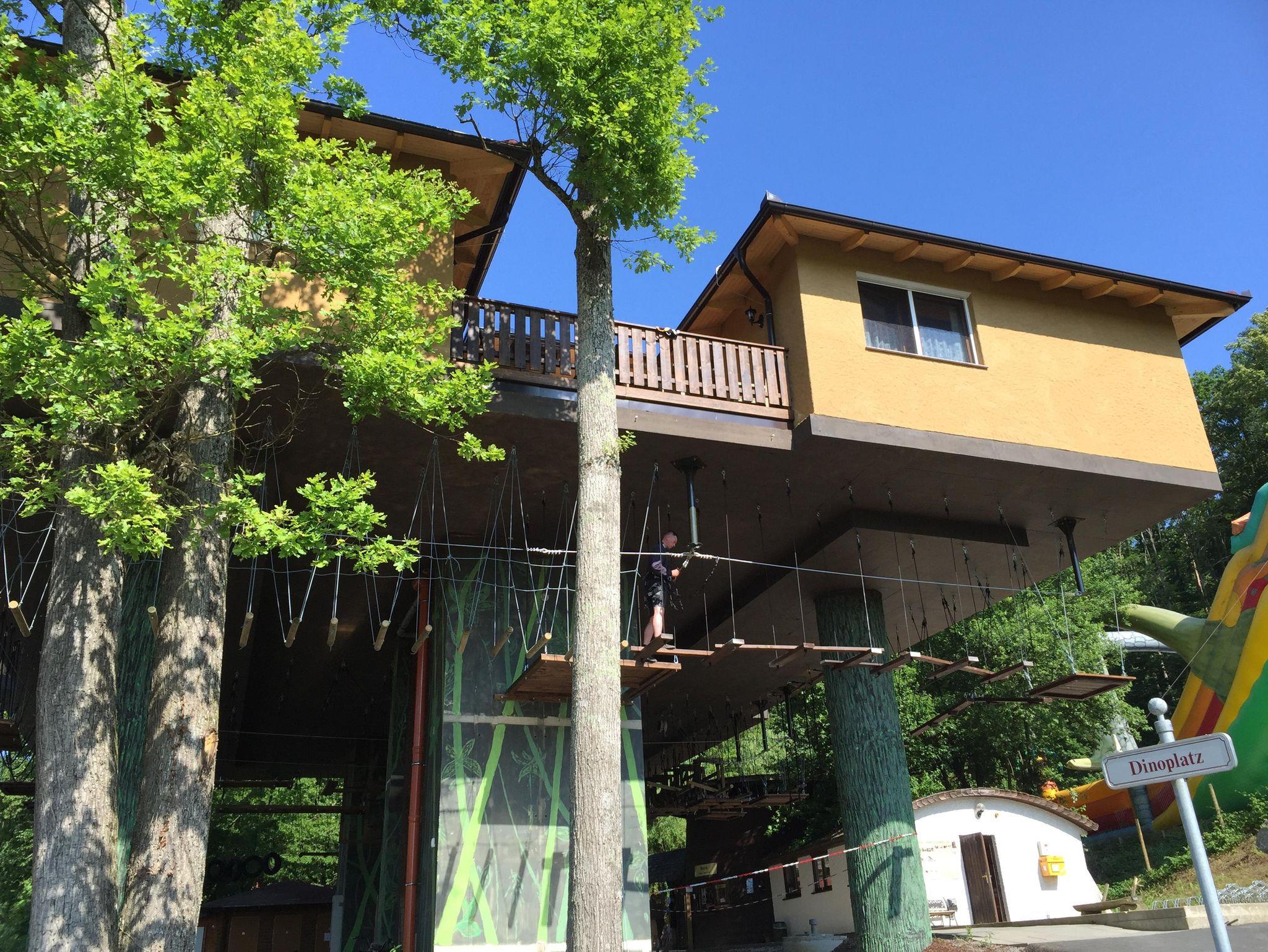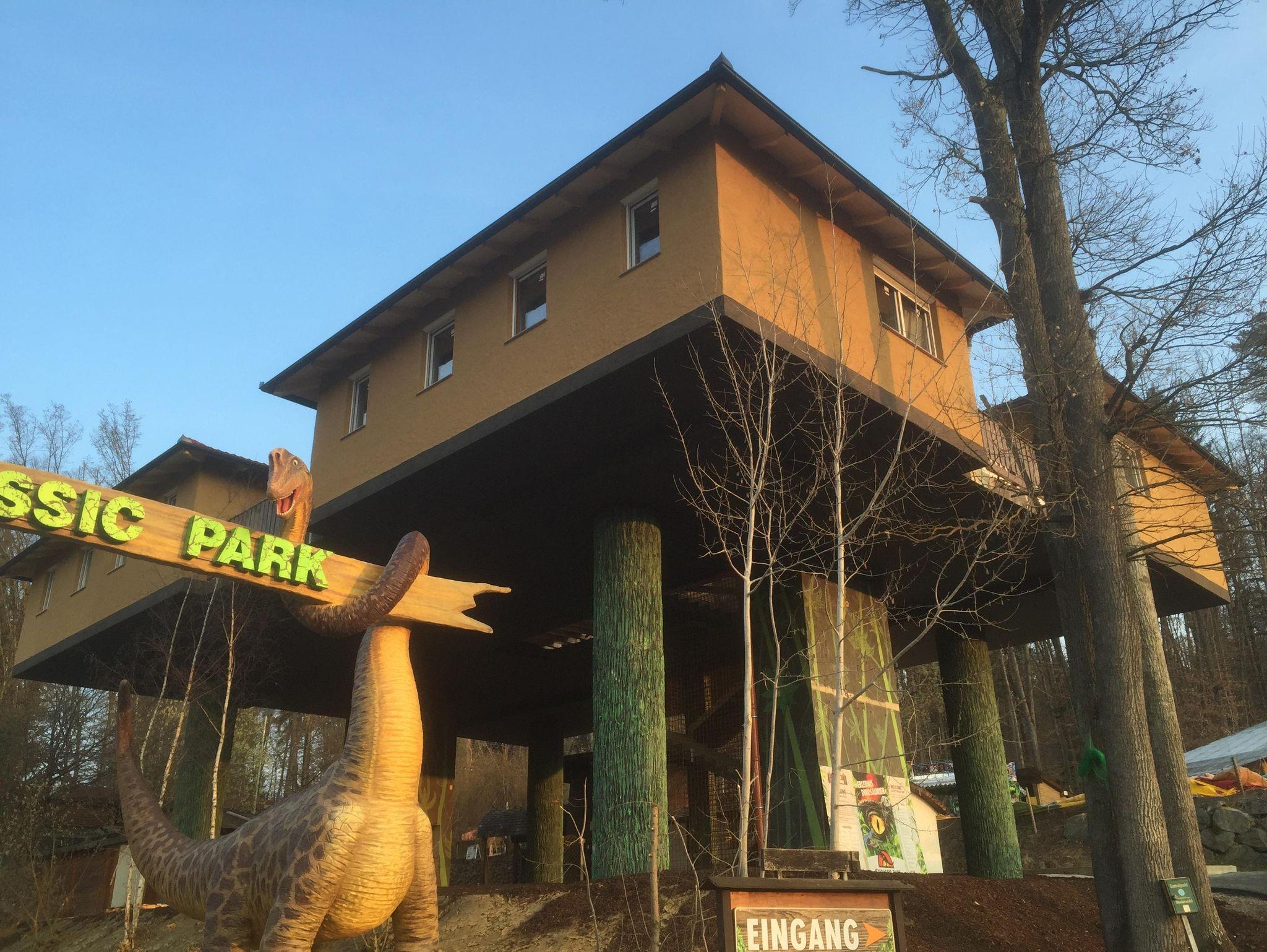 Im Baumhaus Neandertal können bis zu 6 Personen drinnen schlafen. Dieses ist mit 2 getrennten Schlafzimmern (1x Doppelbett und 2x Stockbett), einer handgeschlitzten Küche, einem Badezimmer mit WC, Dusche und Waschbecken sowie einem TV, einer Sitzecke, einer Außenterrasse und einem Lift ausgestattet und befindet sich direkt neben dem Dino-Restaurant.