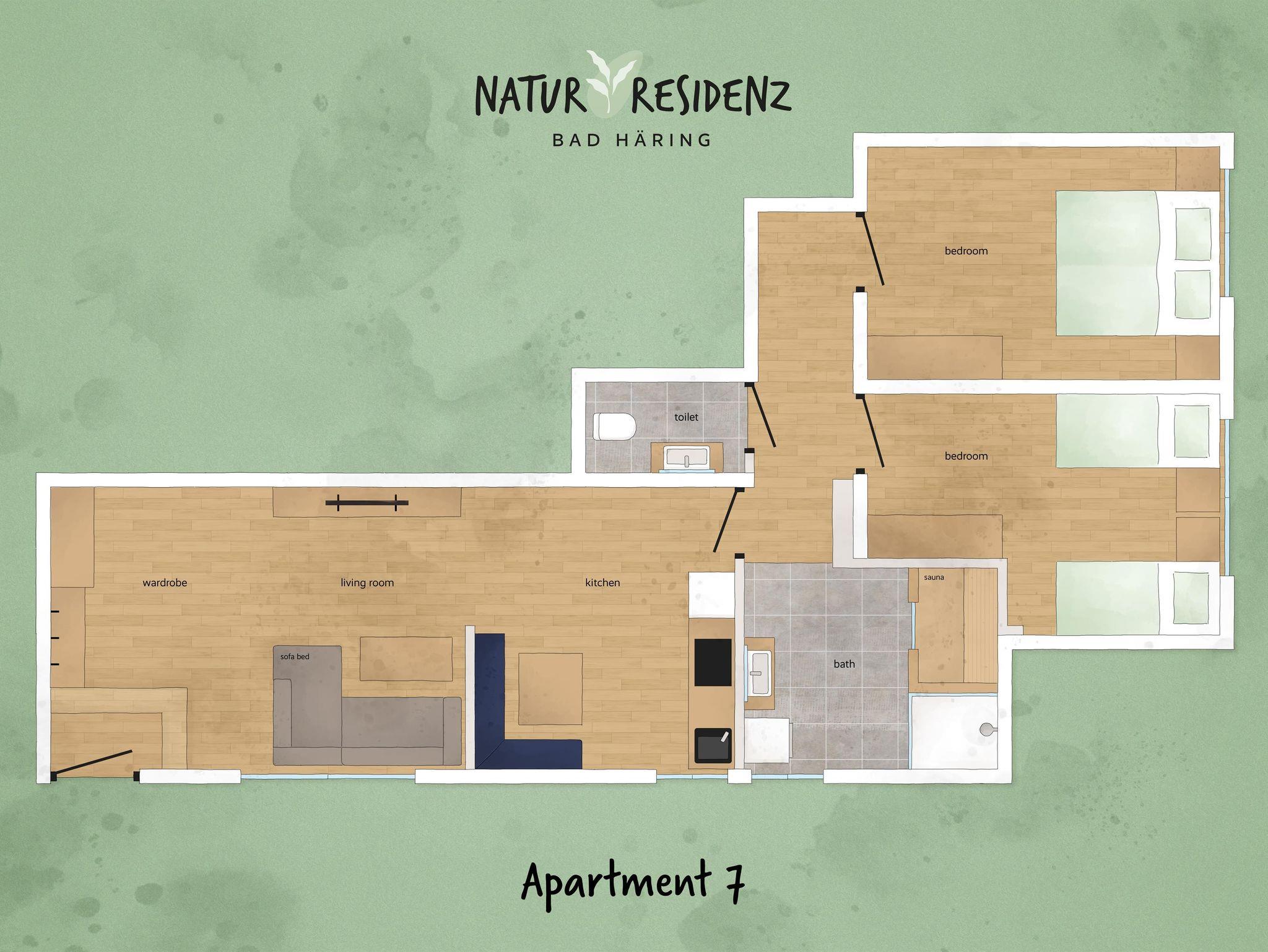 Alles neu, alles modern und alles geschmackvoll eingerichtet - oder einfach: deine Natur Residenz Bad Häring. Die Apartments der Natur Residenz Bad Häring sind sowohl funktional als auch gemütlich und stilvoll eingerichtet. Alle Wohnungen sind mit einer vollausgestatten Küche, einem Geschirrspüler und einem Backrohr ausgestattet. Die liebevoll eingerichteten Ferienwohnungen der Natur Residenz Bad Häring verfügen zudem über Bettwäsche, Handtücher und einen Fön. Des weiteren stellt die Natur Residenz Bad Häring jedem Apartment einen kostenfreien Parkplatz zur Verfügung. Da sich die Natur Residenz wunderbar in Bad Häring gelegen befindet, kann somit auch ihr Auto Urlaub machen, da die wesentlichen Highlights des Urlaubsortes entweder zu Fuß oder via Bus erreicht werden können. Unsere Apartments 1-5 und 9 befinden sich in den oberen Stockwerken, Apartment 6-8 liegen durch eine Souterrain Lage etwa 0,5m unter Bodenniveau. Trotzdem bieteten die Wohnungen genügend Tageslicht.