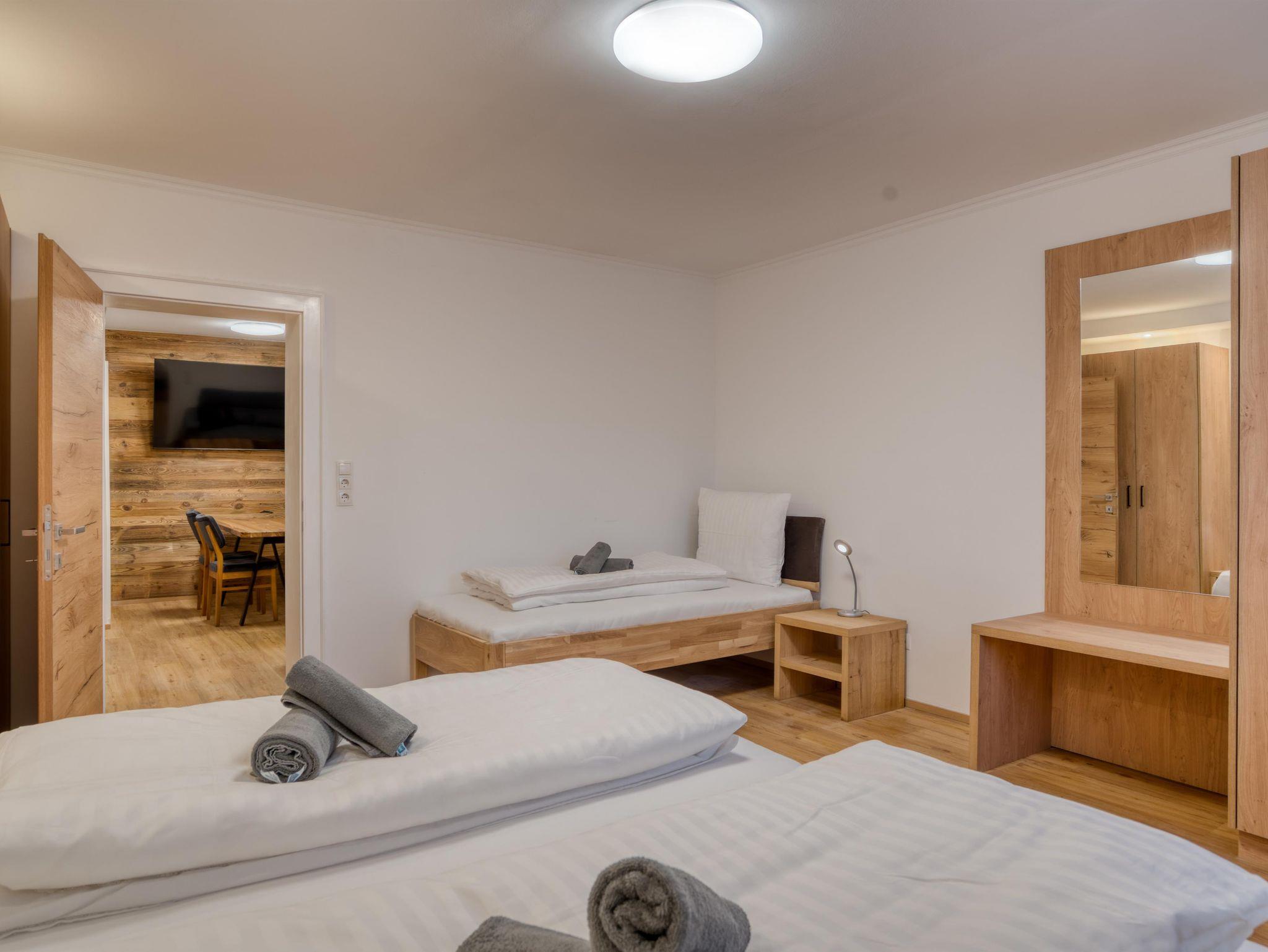 Unser Apartment 6 ist Dein zu Hause auf Zeit im malerischen Bad Häring. Durch eine Souterrain Lage befindet sich das Apartment etwa 0,5m unter Bodenniveau. Trotzdem bietet die Wohnung genügend Tageslicht. Auf 40 Quadratmetern erwarten dich 2 Schlafzimmer (jeweils Doppelbett+1x Einzelbett). Somit ist dieses Apartment für bis zu 5 Personen geeignet. Im großzügigen Wohn- und Essbereich findet sich genügend Platz für gesellige Abende mit der Familie oder mit Freunden.