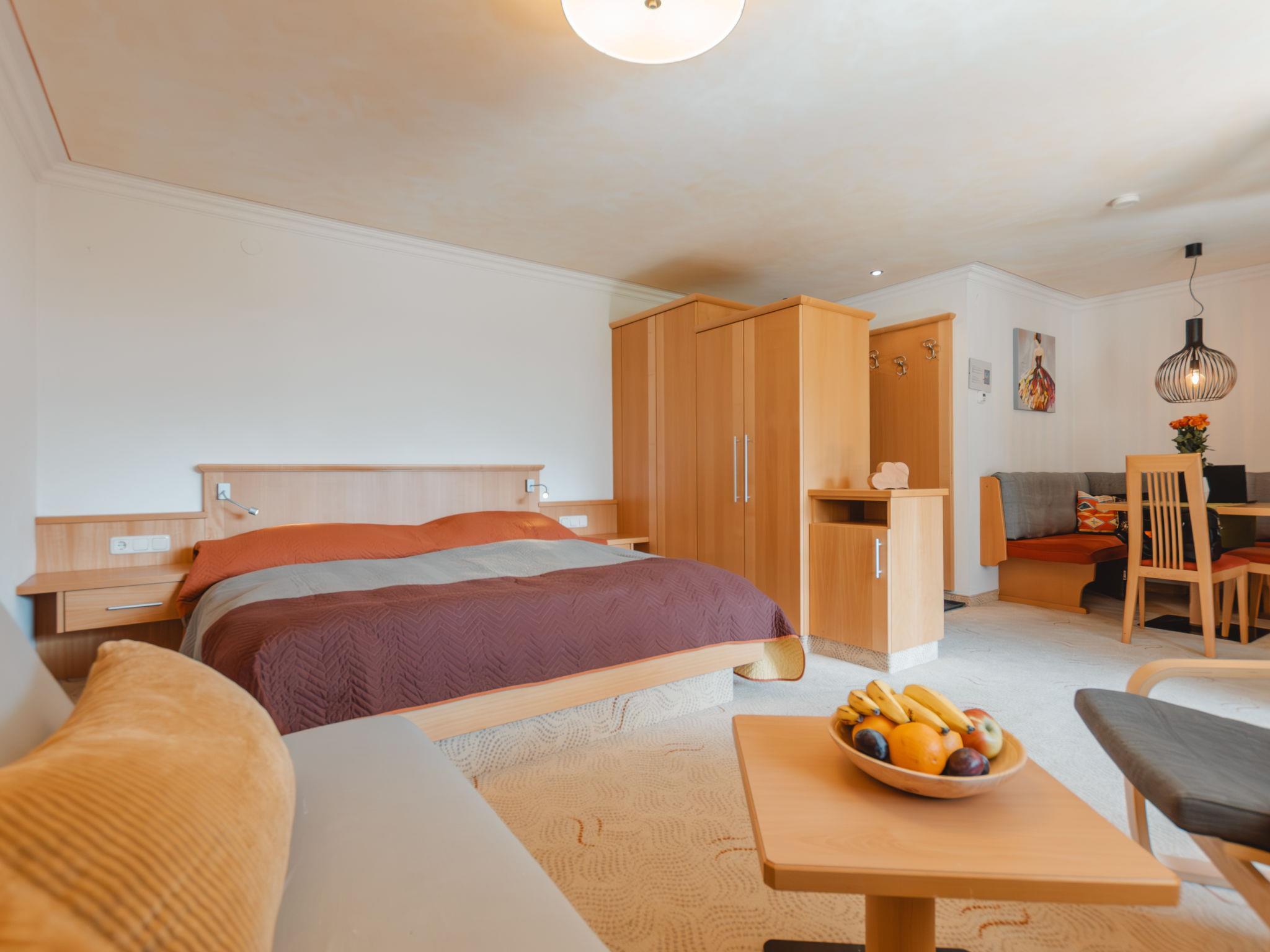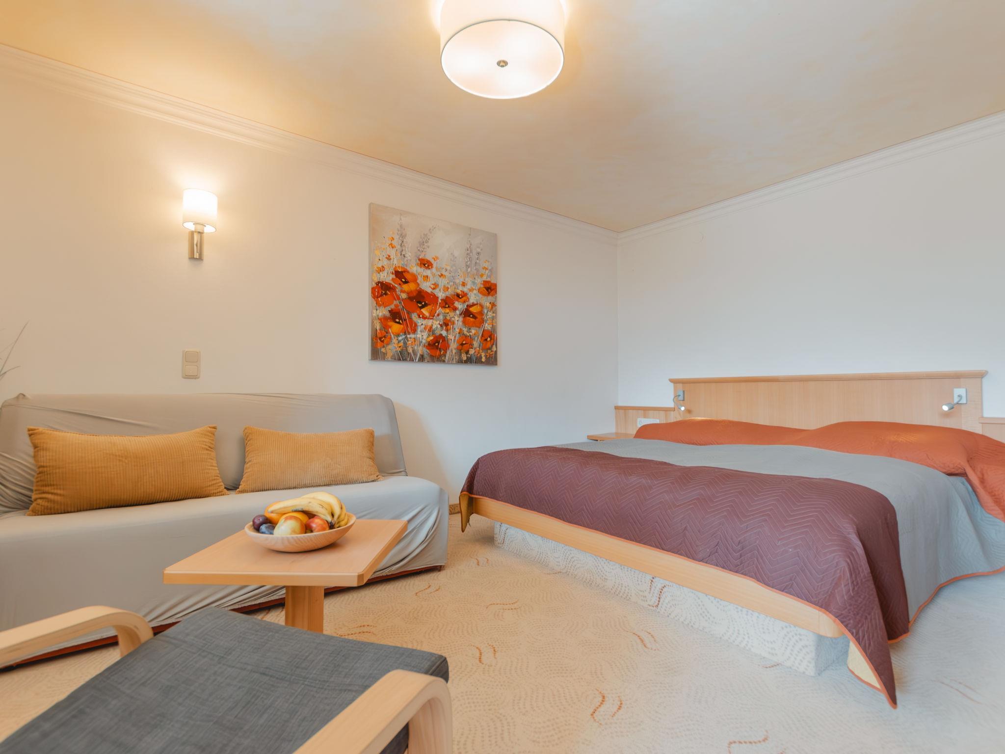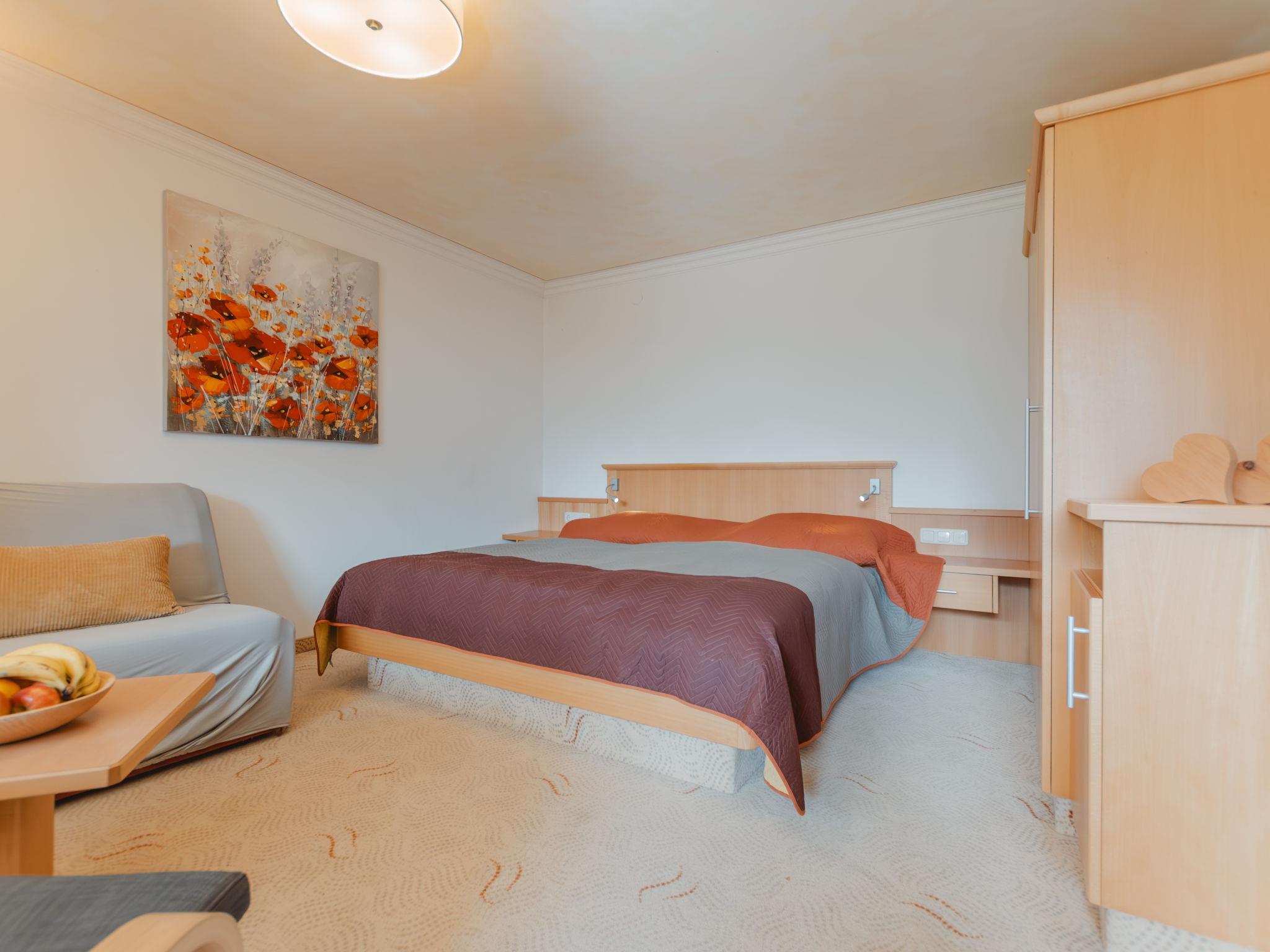"Rose", 1-room apartment 35 m2 on 3rd floor. Bright, very comfortable and modern furnishings: living/sleeping room with 1 sofabed, 1 double bed, dining nook and cable TV (flat screen). Exit to the balcony. Open kitchen (oven, 4 ceramic glass hob hotplates, toaster, kettle, microwave, electric coffee machine, Capsules for coffee machine (Tschibo)). Shower, sep. WC. Electric heating. Carpet. Balcony 11 m2. Balcony furniture, deck chairs (2). Marvellous panoramic view of the mountains and the garden. Facilities: hair dryer. Internet (WiFi, free). Garage space n 300. Please note: suitable for families. Non-smokers only. Smoke alarm, fire extinguisher. 2 children up to 15 years possible on request. 50402-000675-2020