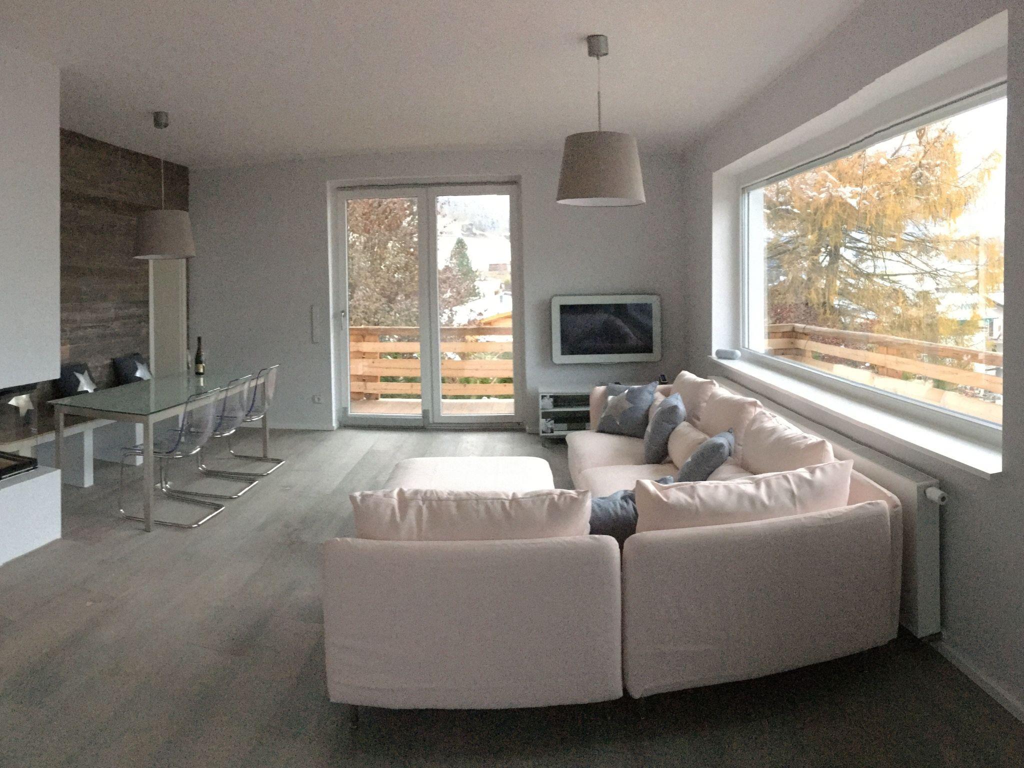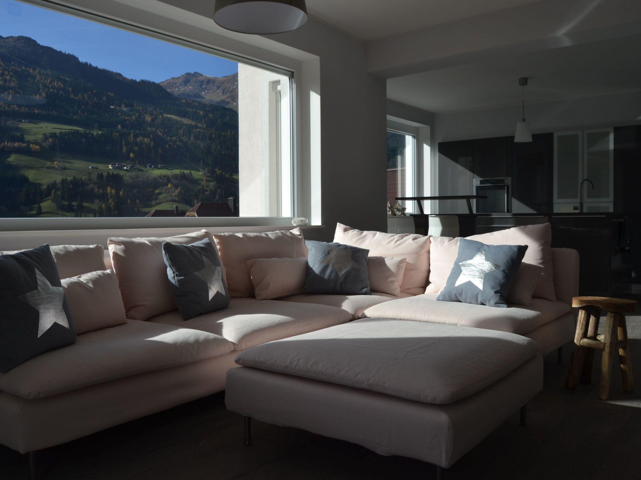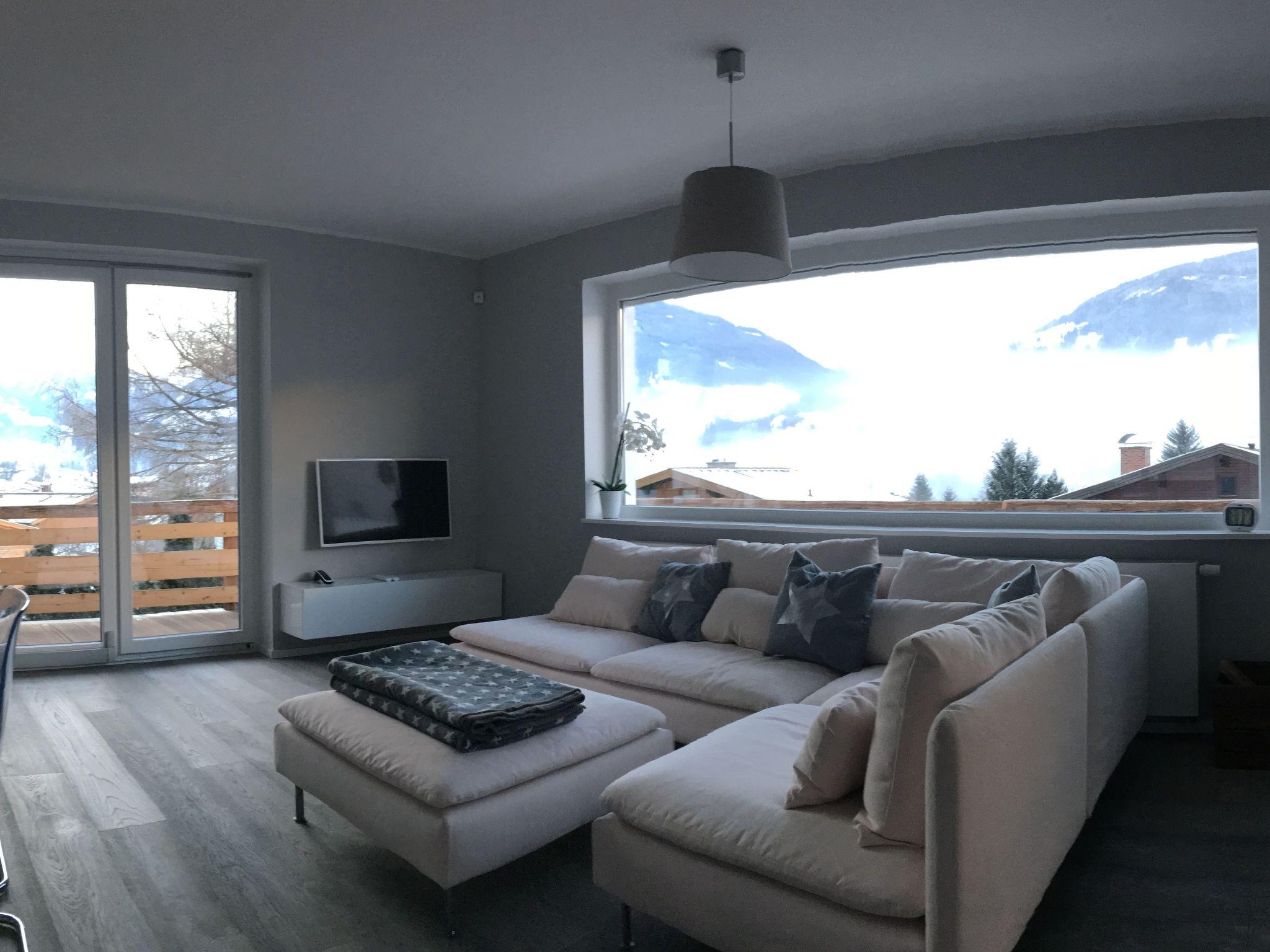 Inside you will find a modern flat of 120 m², situated on the upper and top floor in a quiet hillside location. The luxurious interior, which is characterised by wood and stone, includes a spacious living area with an open-plan kitchen and fireplace corner, from where you can marvel at the fantastic Alpine panorama. Two cosy bedrooms on the upper floor and another on the top floor offer high-quality sleeping comfort. The modern bathroom with free-standing bathtub and large rainfall shower as well as a separate WC round off the feel-good ambience. A fully equipped kitchen, HD flat-screen TV, high-speed WLAN and other comforts ensure an unrivalled living experience.