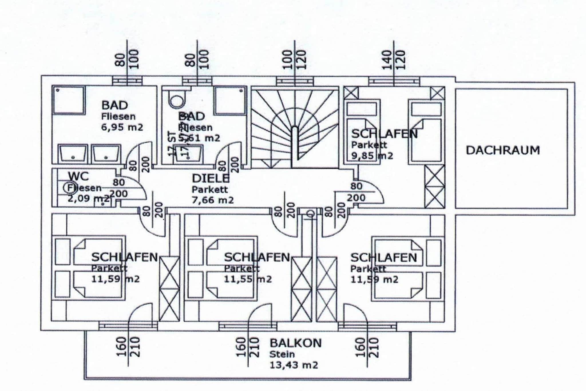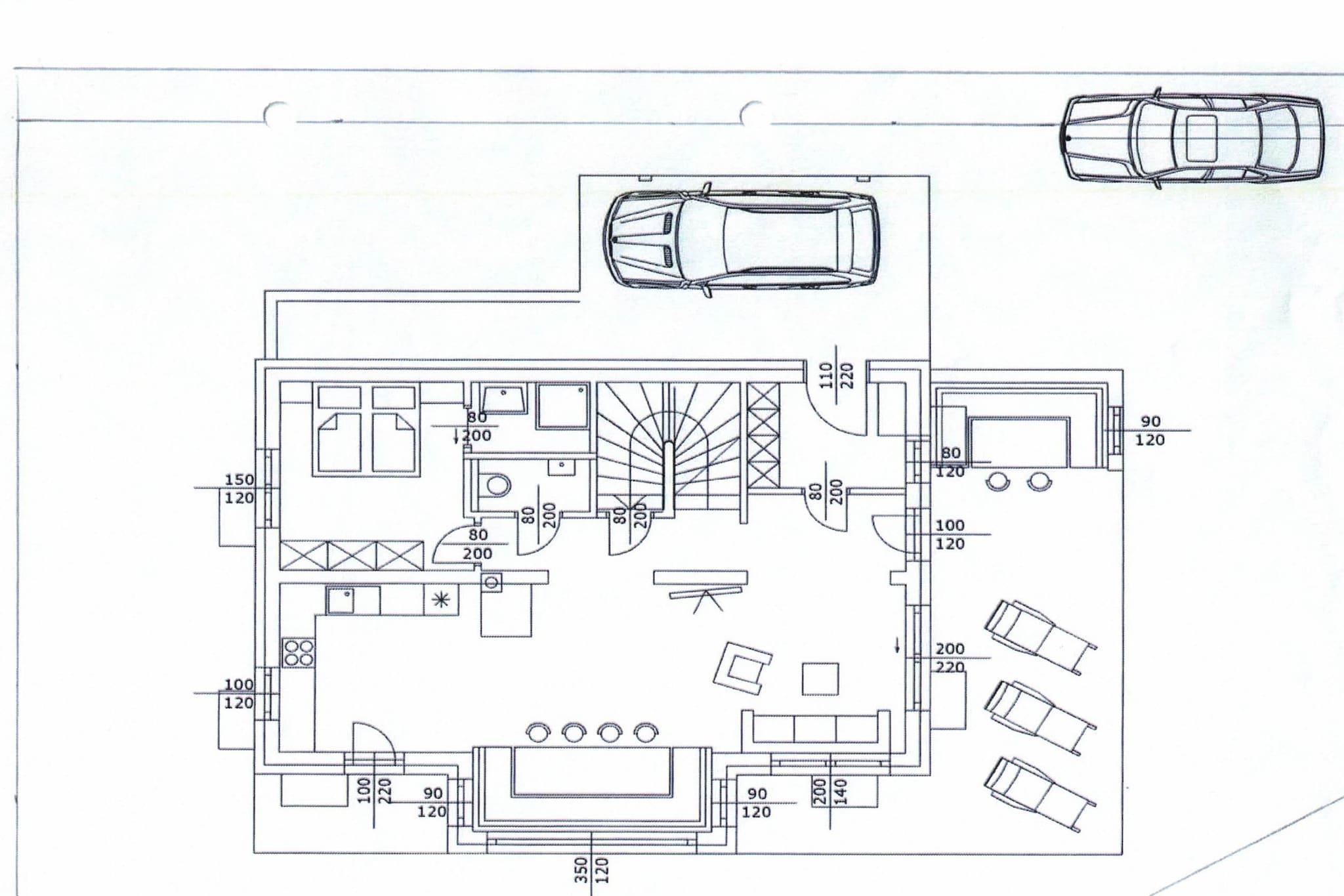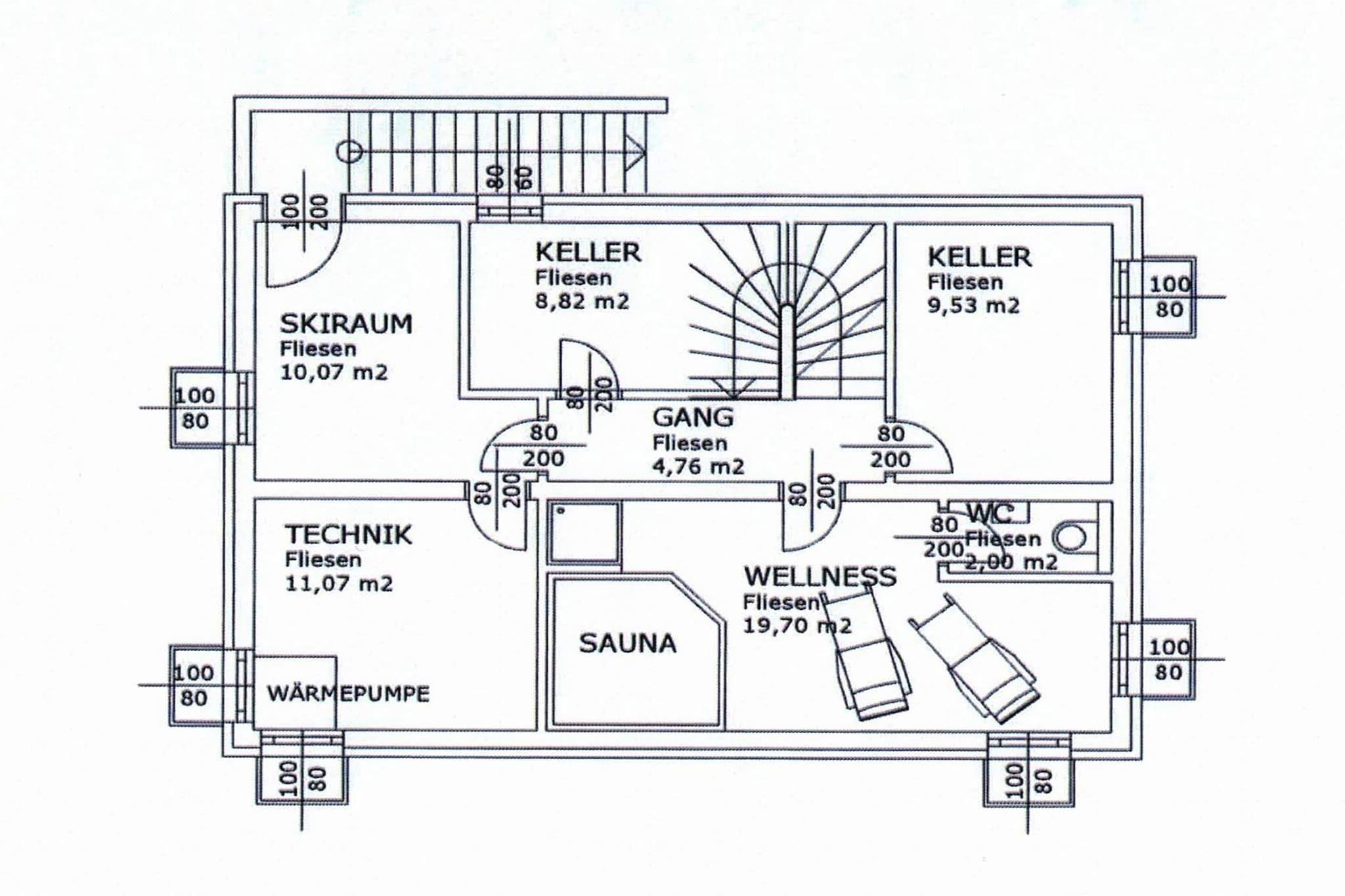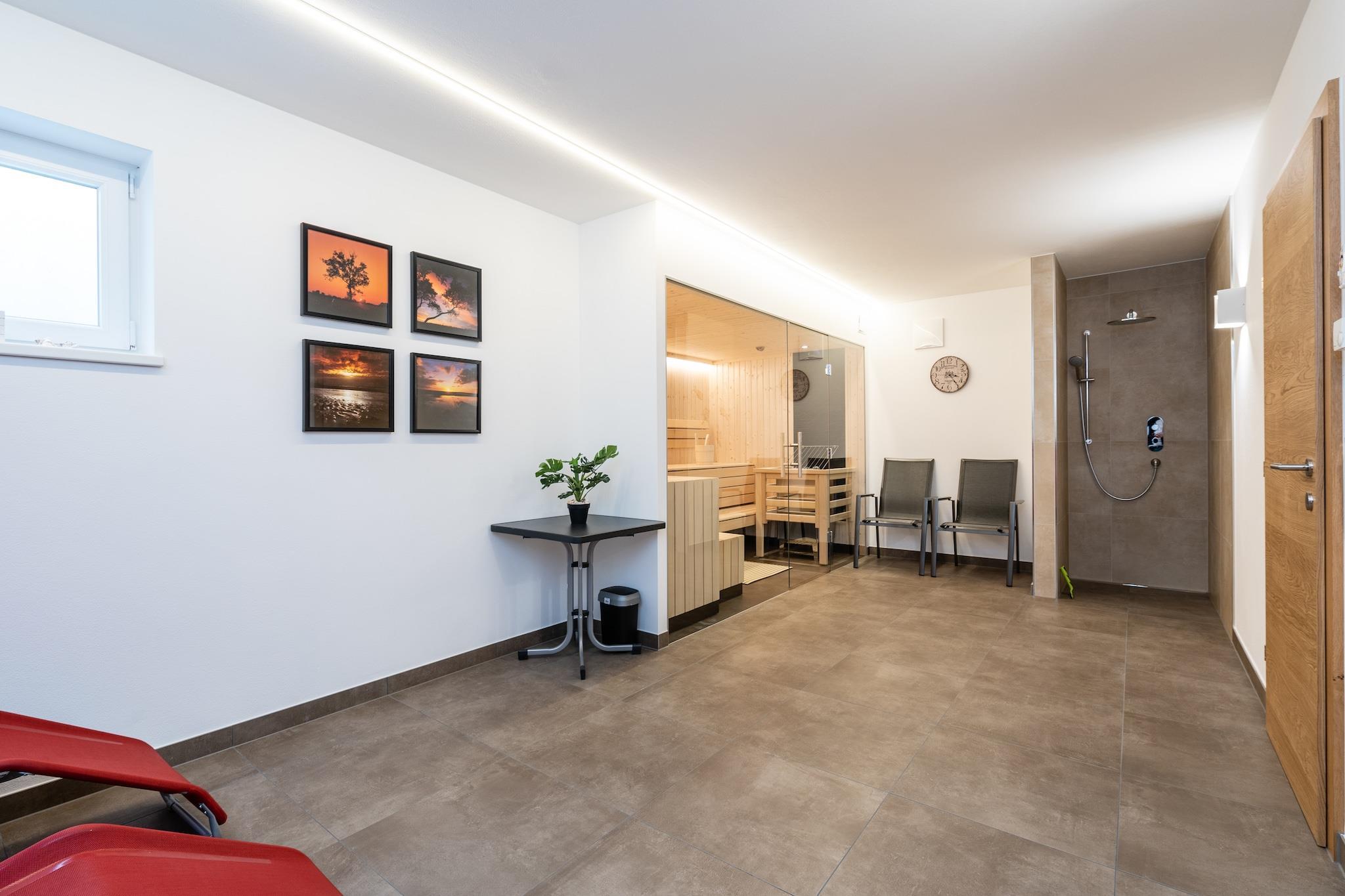 Ground floor: (Living room(TV, dining table, seating area), open kitchen(cooker, oven, dishwasher, fridge-freezer), Bedroom with bathroom(double bed, TV, shower, washbasin), toilet, terrace) On the 1st floor: (bedroom(bunk bed, bunk bed), bedroom(double bed, TV, balcony), bedroom(double bed, TV, balcony), bedroom(double bed, TV, balcony), bathroom(bath tub, shower, washbasin, washbasin), bathroom(shower, washbasin, toilet), toilet) Basement: (playroom(TV), relaxation area(shower, sauna, deckchairs), storage(tumble dryer, washing machine, ironing board, iron), ski storage(ski boot heaters)) garden, garden furniture, parking, children's bed, children's bed, high chair, high chair