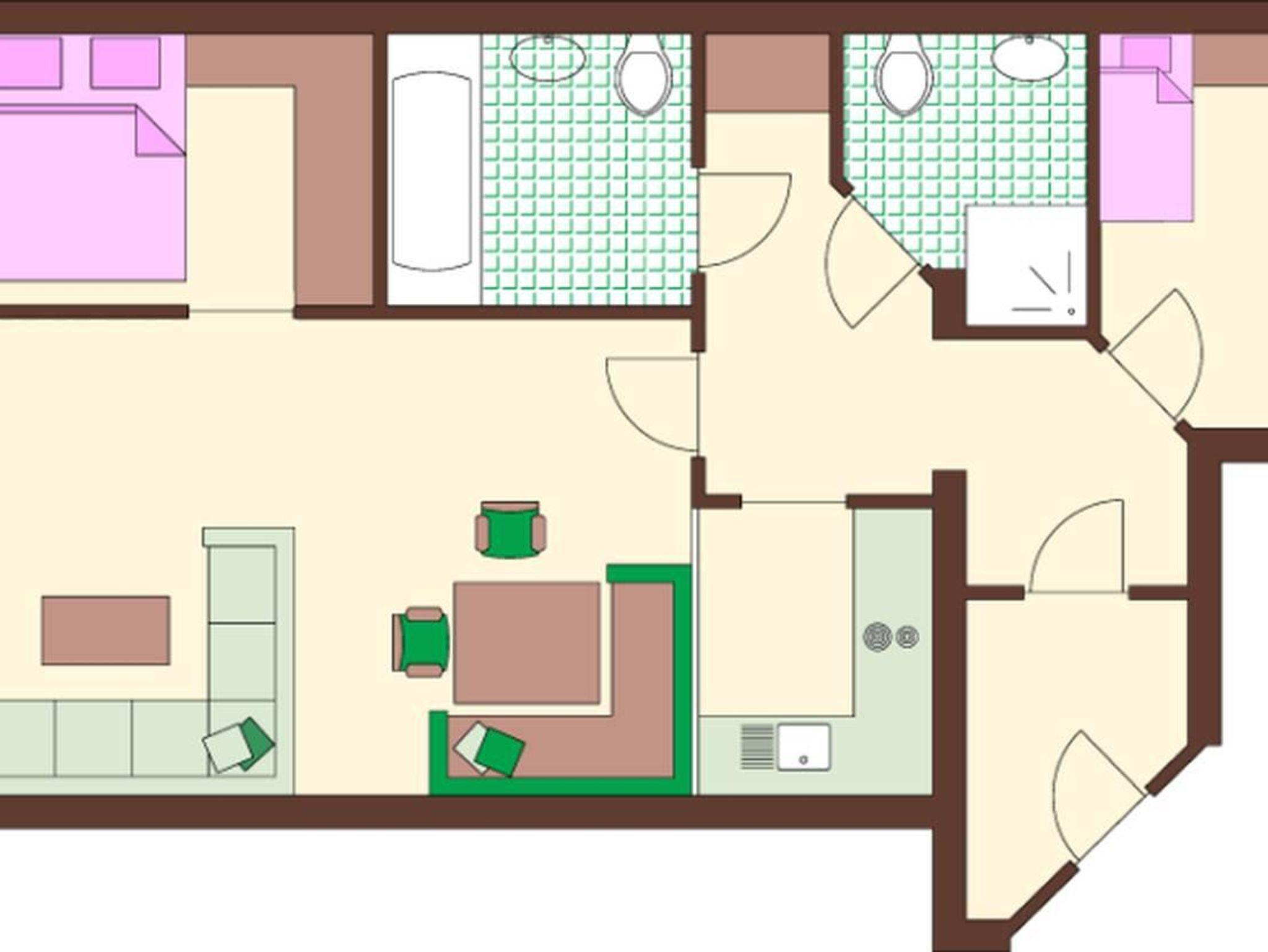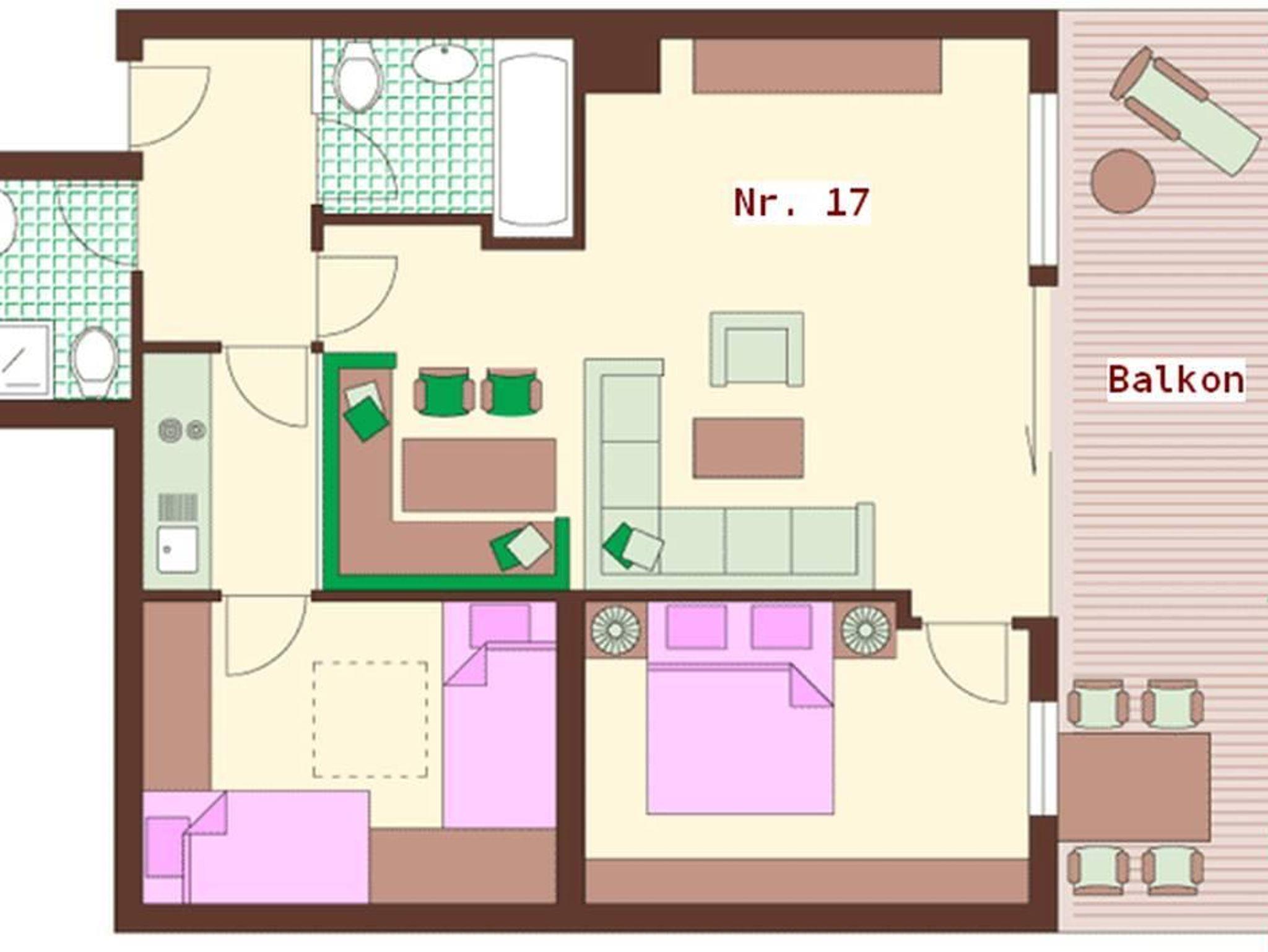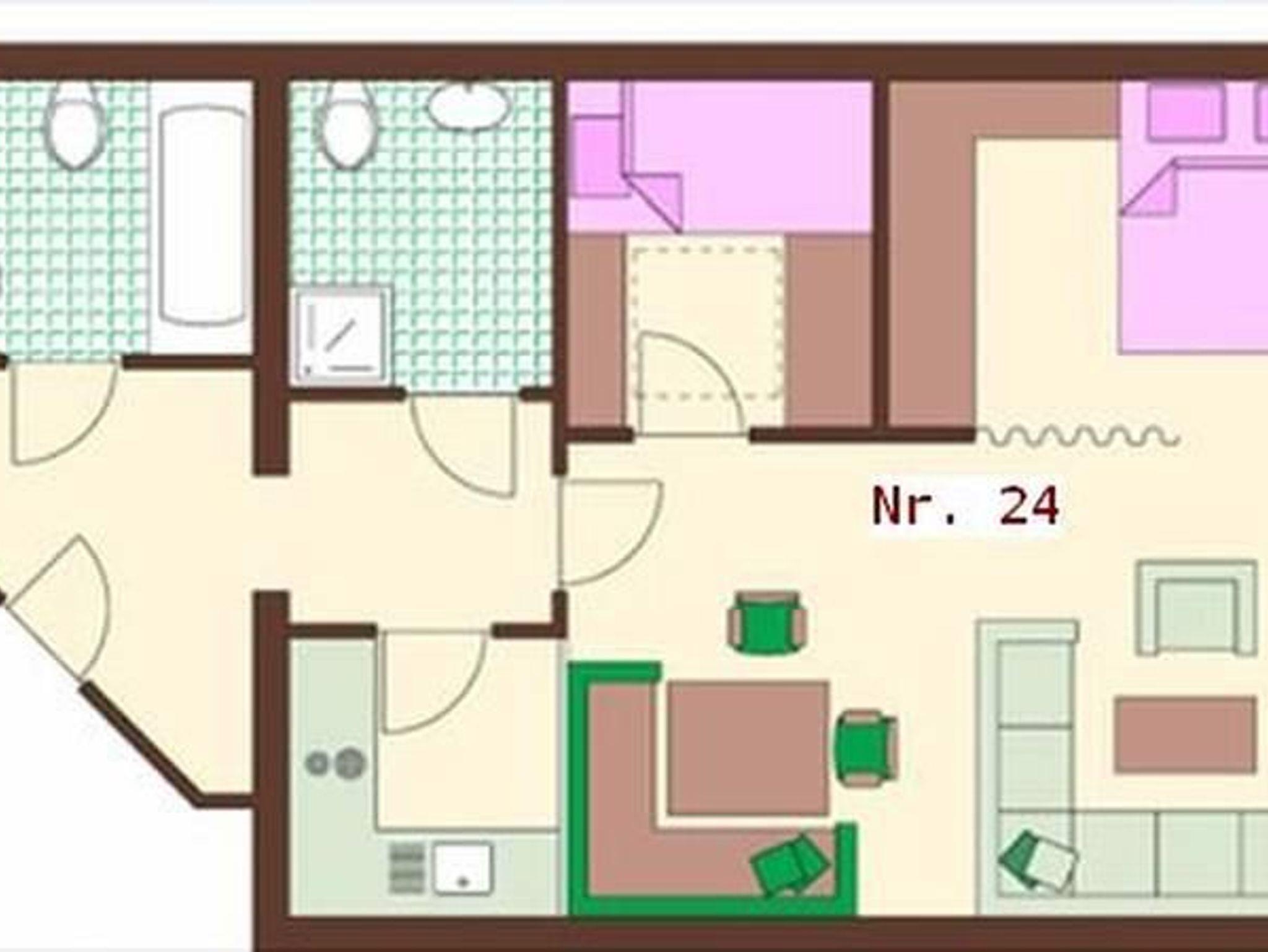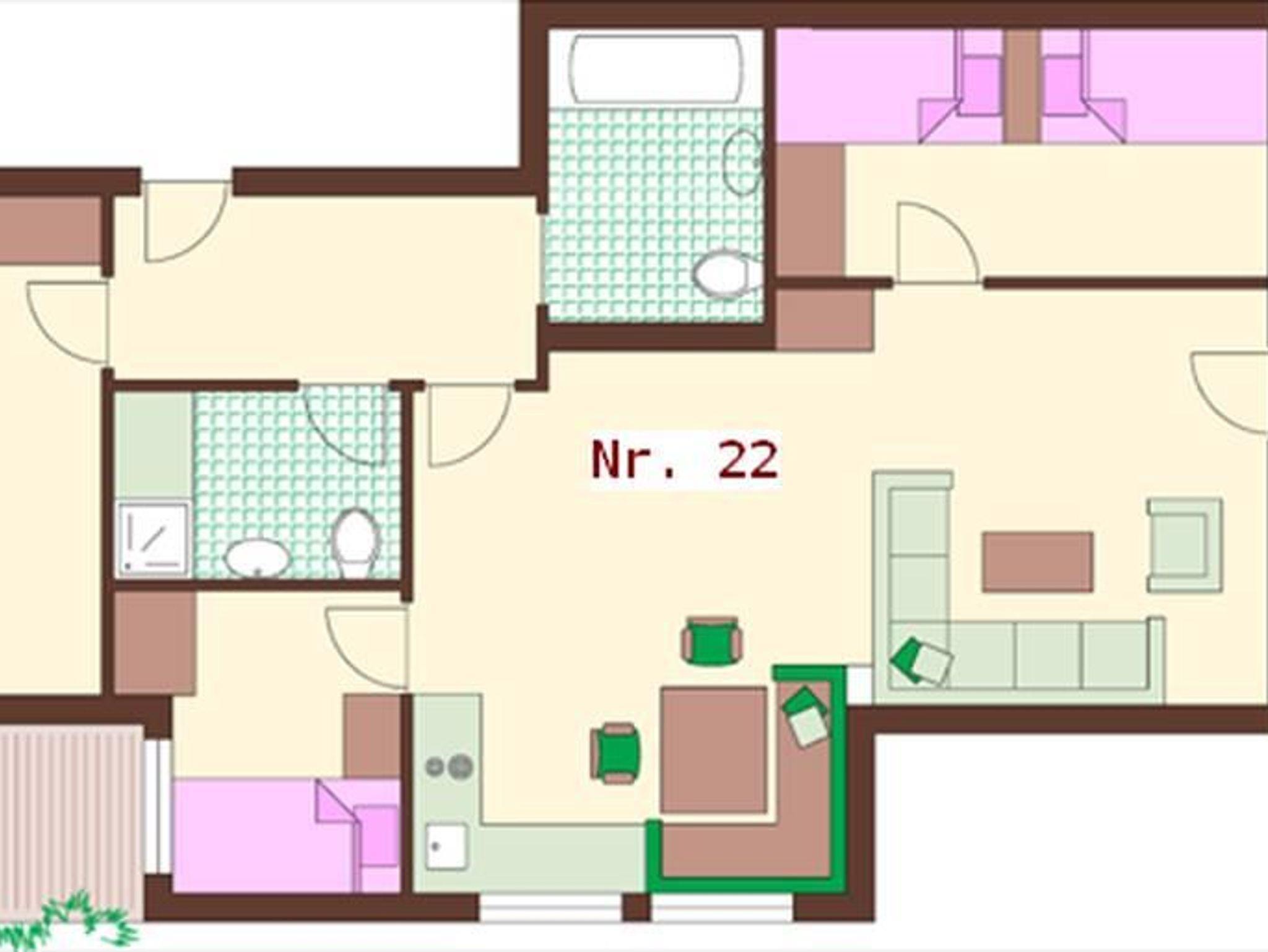 Typ C: Wohnungen mit zwei Schlafzimmern von 57 - 68 qm, Wohnraum mit gemütlicher Sofaecke (zwei Einzelbetten möglich), großzügiger Eßplatz und kleiner Küche oder integriete Küche mit zwei - vier Plattenherd, Backrohr, Kaffeemaschine, Geschirrspüler, Wasserkocher und Kühlschrank mit Gefierfach. Großzügiger Eßplatz mit Tisch und Eckbank. Alle Wohnungen verfügen über Bad/WC (Haarföhn) und Dusche/WC, Diele und Balkon (teilweise in Südlage). Flat-TV mit internationalen Programmen, Safebox, kostenloses Wlan und Telefon. Die Wohnungen Nr. 23 und Nr. 24 sind nur über die Treppenhaus vom dritten Stockwerk (Lift) in das Dachgeschoss erreichbar. Bei online Buchungen ist keine bestimmte Wohnungsnummer buchbar.