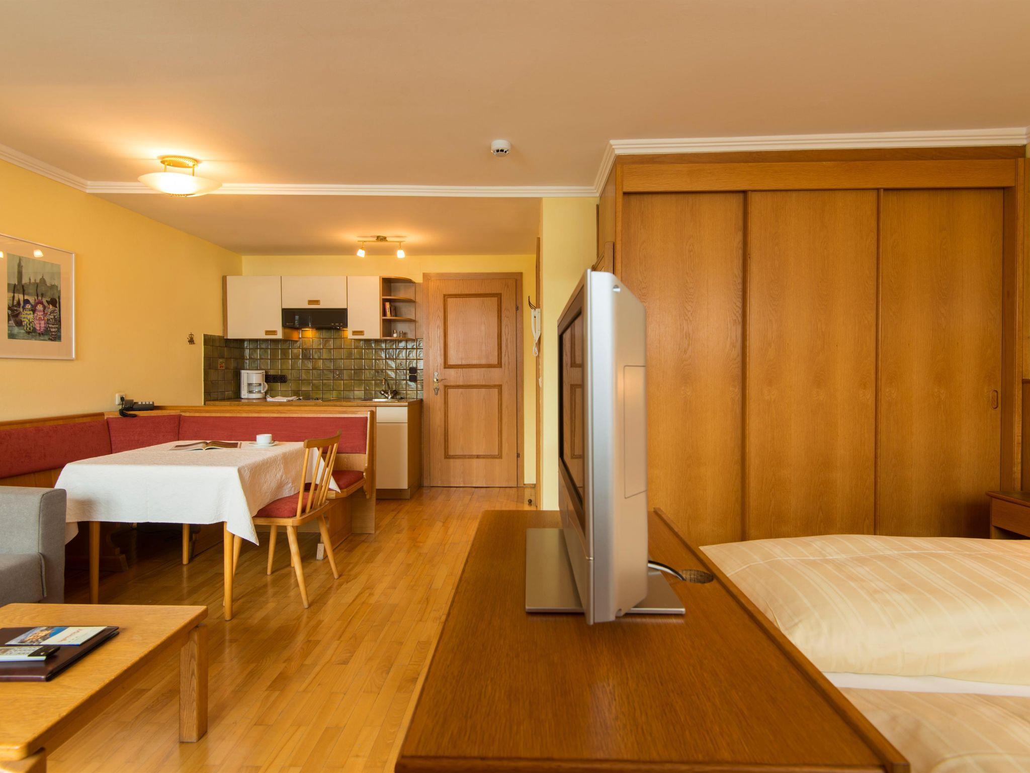 Appartement (ca. 30m²) bestehend aus einem kombinierten Wohn-Schlafraum, Couch, Essecke, Küchenzeile, Dusche/WC, Balkon zur Südseite mit herrlichem Blick auf die Bergwelt der Hohen Tauern.