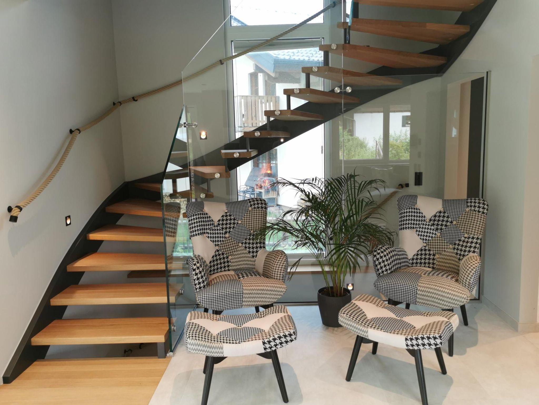 Ferienhaus bis zu 9 Personen, Küche, Esstisch, großer Wohn-Schlafraum mit offenen Kamin, Couch, drei Schlafräume, drei Bäder, ein WC extra, Gardarobe, Grosse Terrasse Sonnenliegen Grillplatz, und eigener Garten mit Spielplatz.
