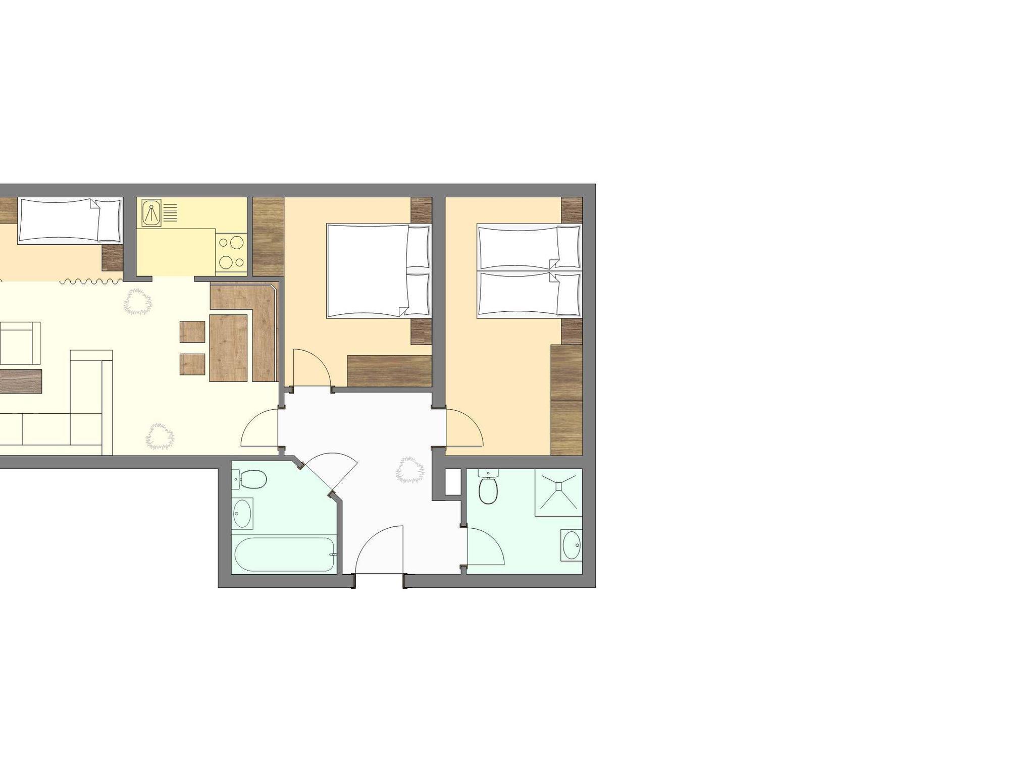 Großes Mehrraumappartement - 67 m² - mit einem Schlafzimmer mit Doppelbetten und einem Schlafzimmer mit 2 Einzelbetten. Im Wohnzimmer befindet sich noch ein Einzelbett und eine Doppelbettcouch, die Küche mit Geschirrspüler und eine Essecke. Es gibt 2 Badezimmer und einen großen, möblierten Balkon (nordseitig).