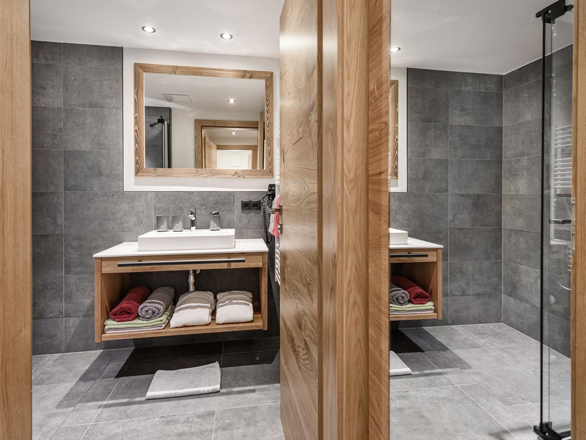 Modernes Badezimmer mit Dusche, Waschbecken, Fön, WC extra, Trotz der Lage im Erdgeschoß eine gute Aussicht auf die umliegende Bergwelt und in den Garten.