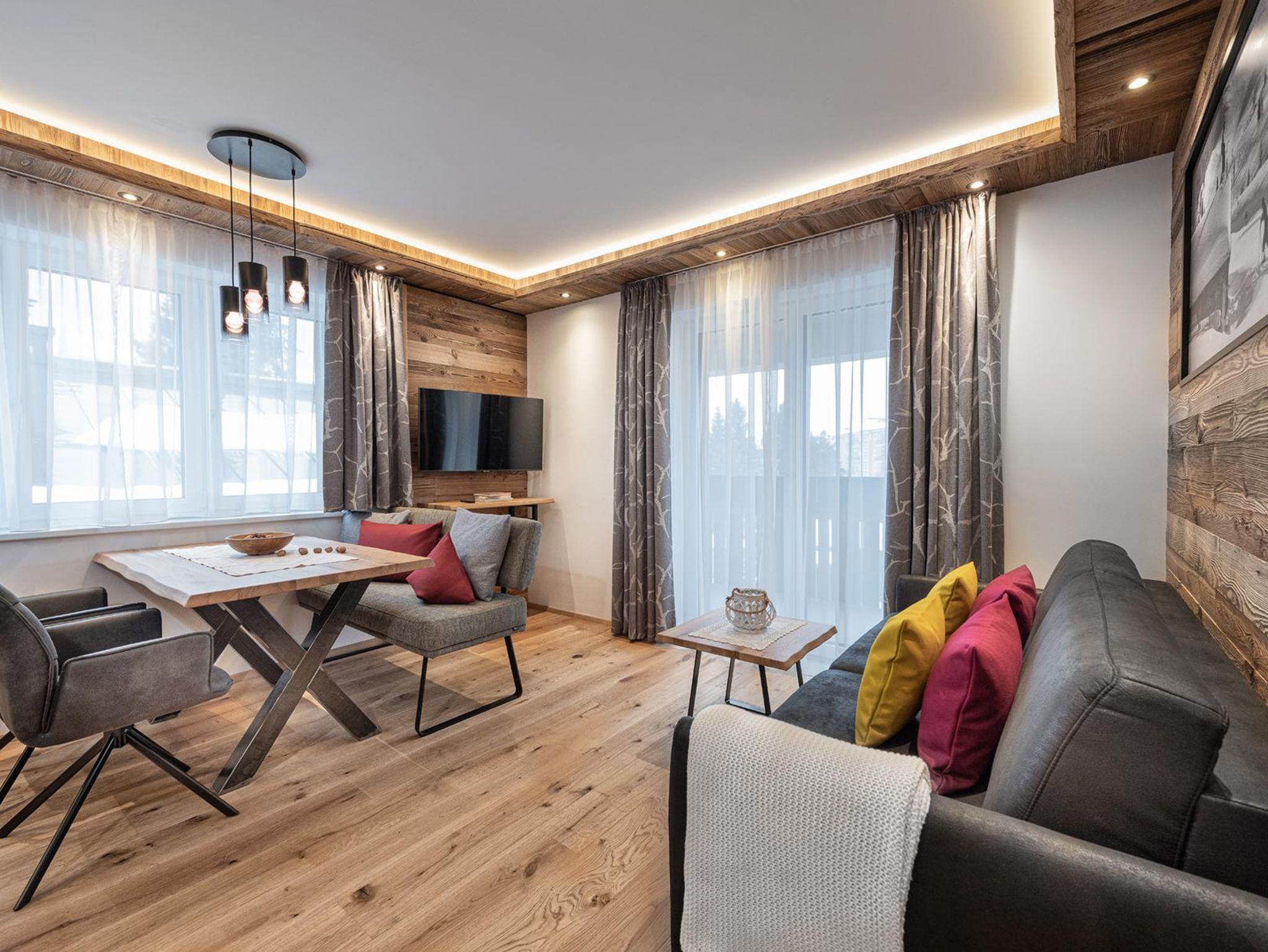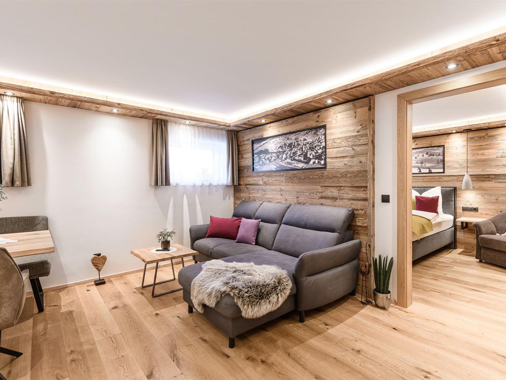 S`Hoamatl. Apartment I mit 53 m² liegt im Erdgeschoss und ist ideal fu¨r zwei Personen, beherbergt aber auch bis zu vier Personen. Hier hast du ein Schlafzimmer ( 1 Zustellbett und 1 Gitterbett oder weiteres Zustellbett möglich auf Anfrage) sowie ein Wohn- Esszimmer mit Schlafsofa und komplett ausgestattete Ku¨che mit Abstellraum. TV im Wohnzimmer und Schlafzimmer.