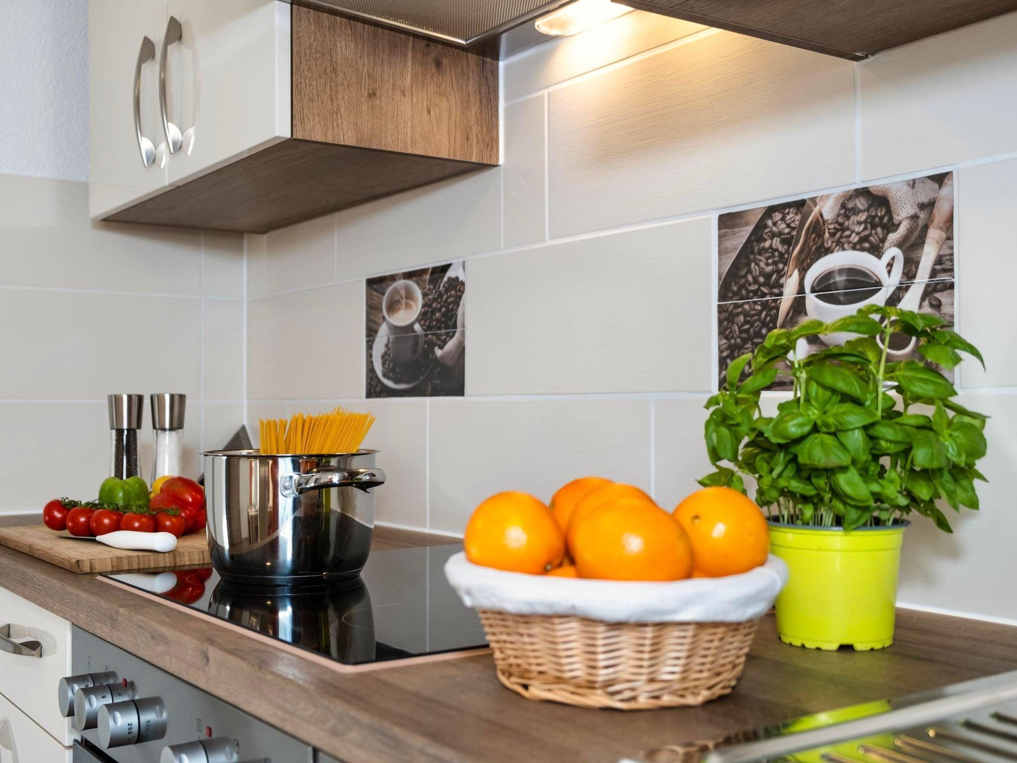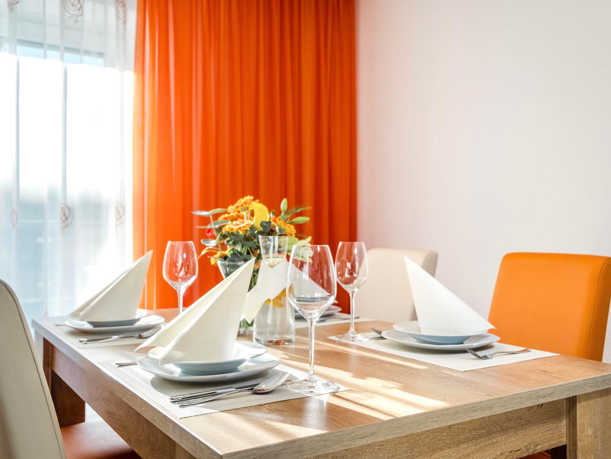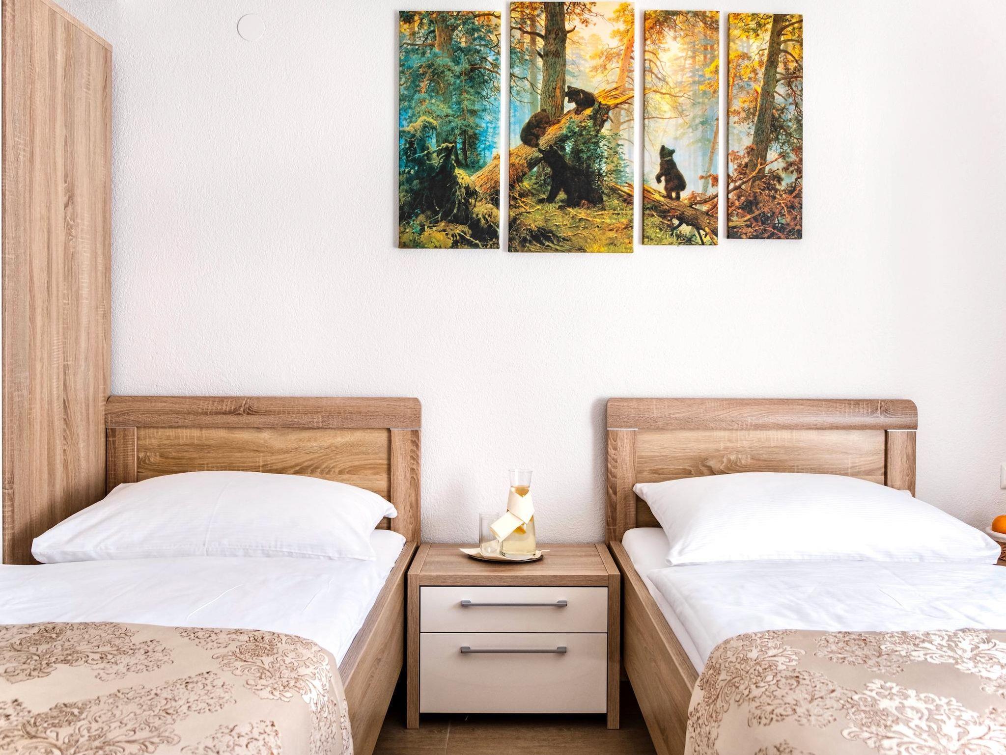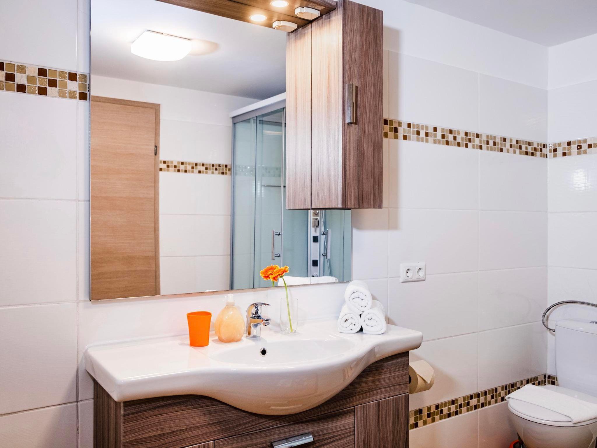 Das erste Schlafzimmer verfügt über ein Kingsize-Doppelbett, im zweiten Schlafzimmer stehen 2 getrennte Einzelbetten und nach Bedarf ein Einzel-Klappbett. Die Wohnung bietet ebenso eine komplett ausgestattete Küche mit allen nötigen Kochutensilien, ein eigenes Badezimmer mit einer Duschkabine, Handtuchtrockner und Föhn, sowie ein zweites WC.
