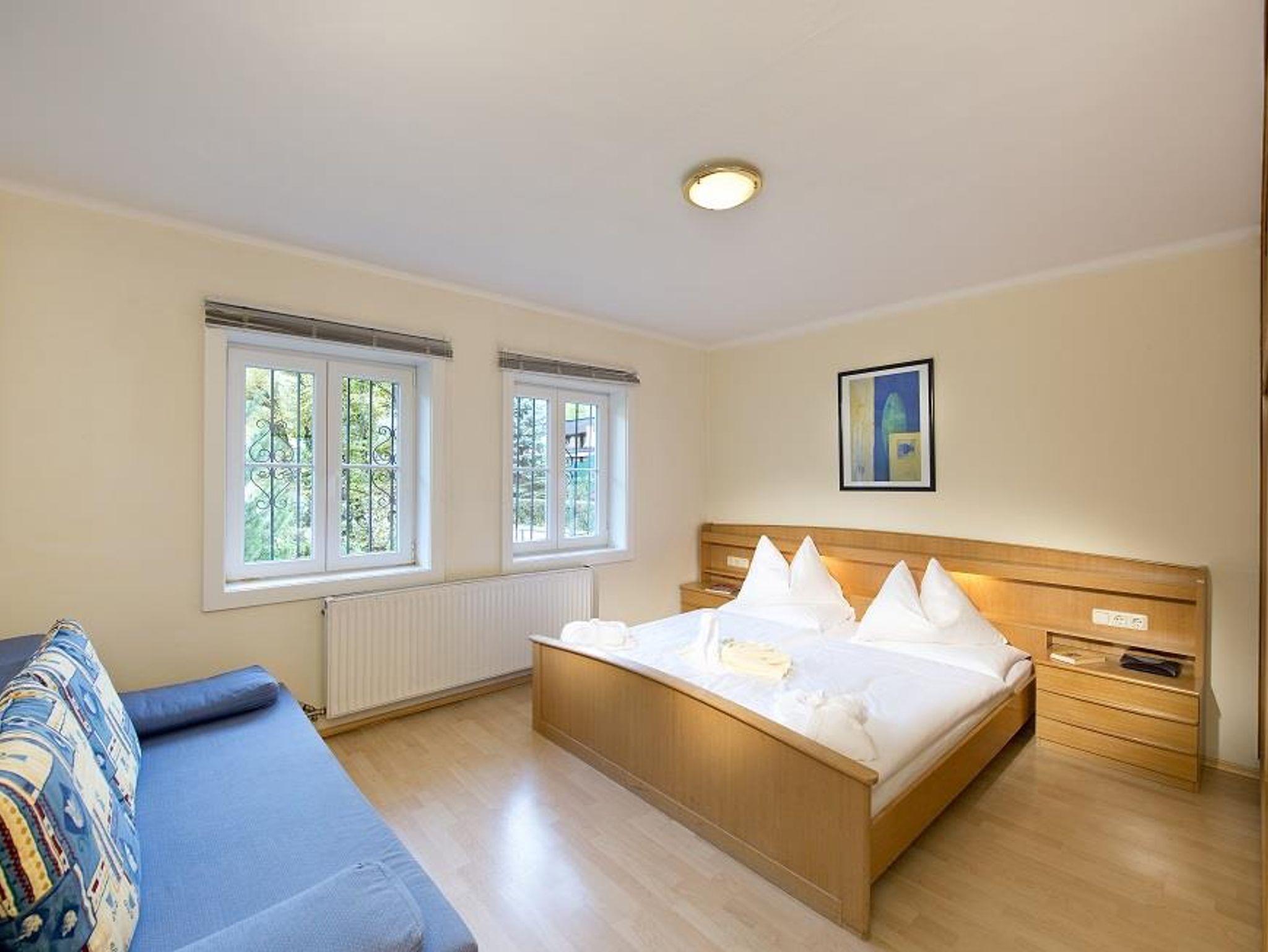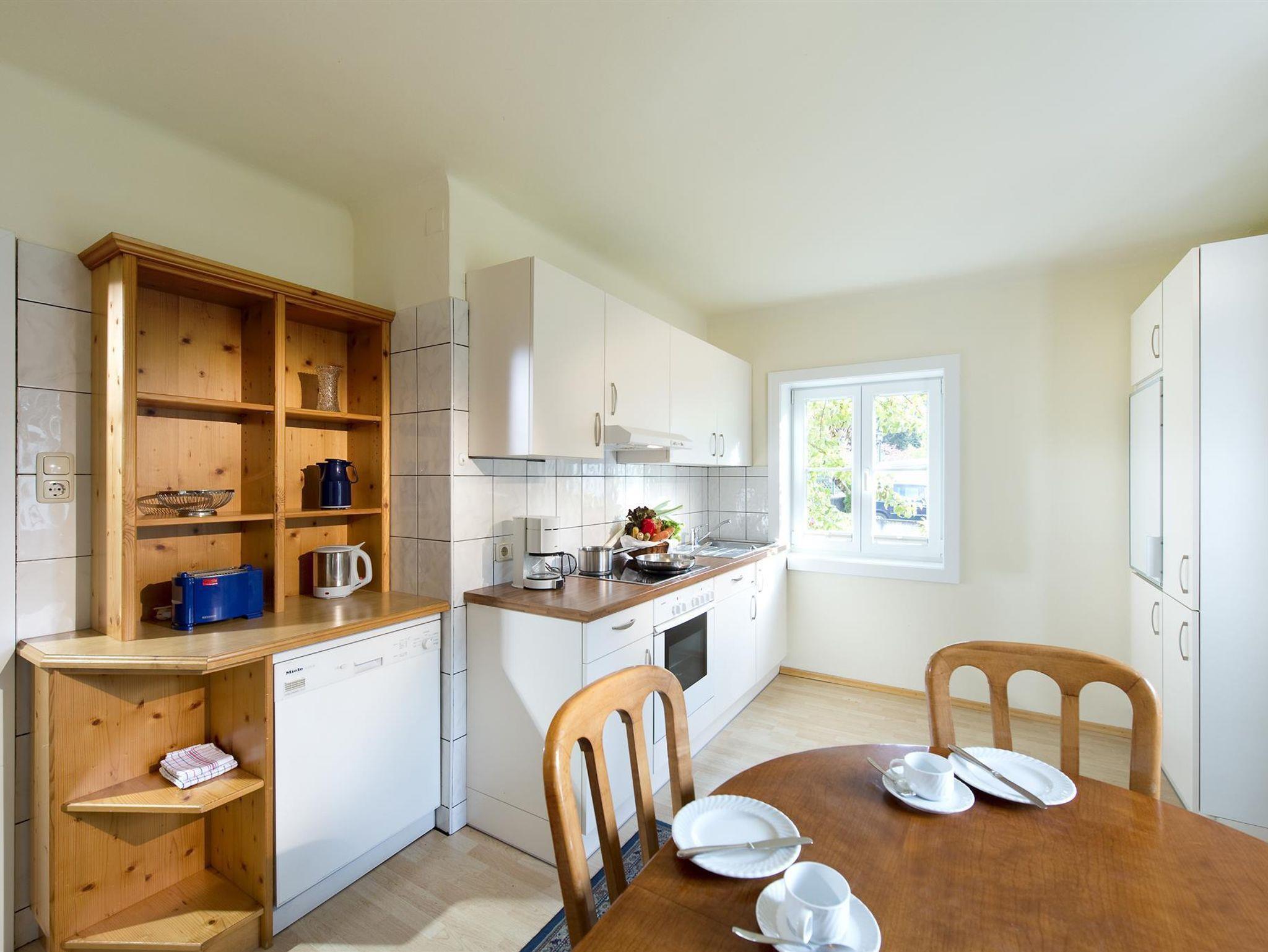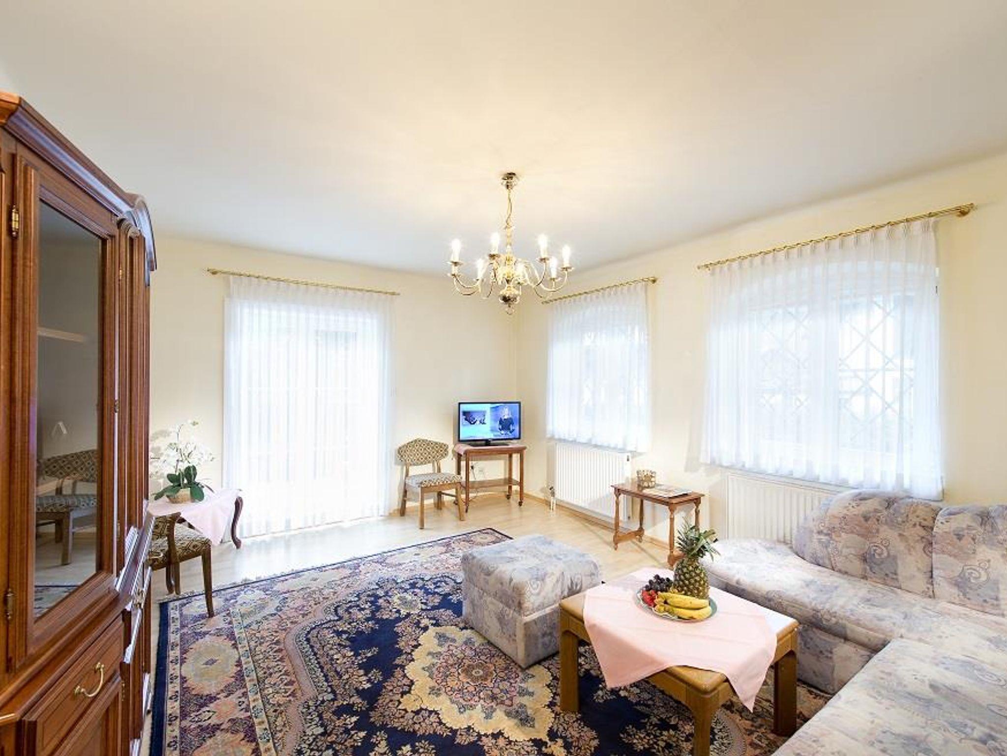 Aufteilung vom Appartement: Vorraum, Küche, Wohnzimmer inkl. Ausziehsofa, 2 Schlafzimmer (eines mit französischem Bett), Bad/WC, Radio, SAT-Farb-TV, Selbstwähltelefon. Geschirrspüler und Terrasse zur Südseite, großer Garten mit Liegewiese