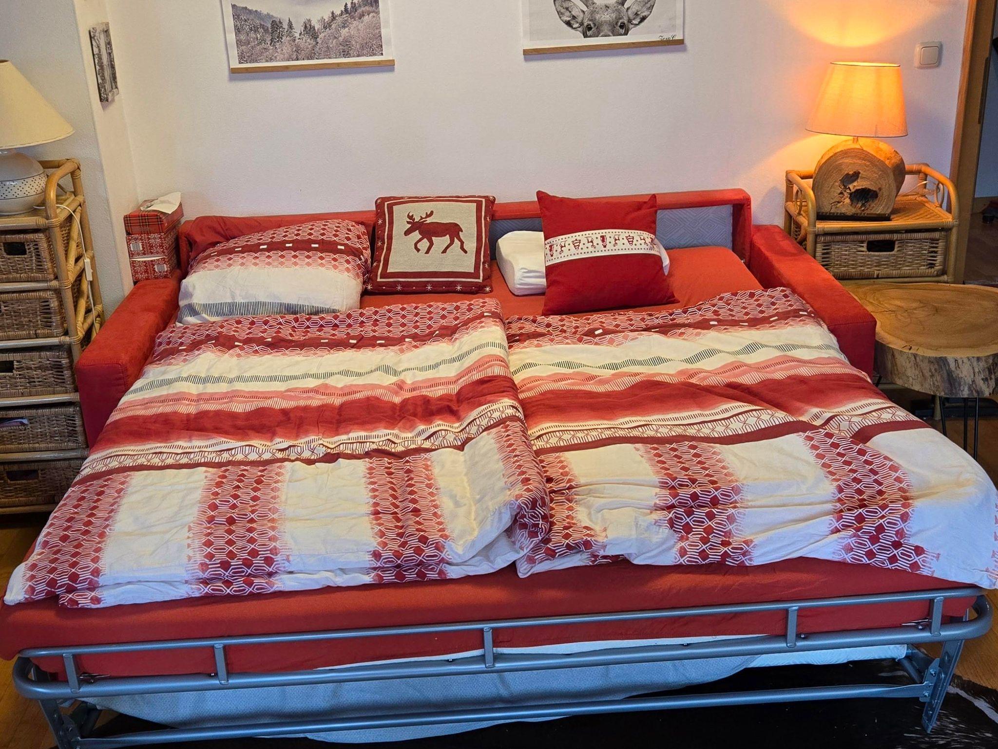 Die 50 Quadratmeter große Unterkunft bietet Platz für bis zu 4 Gäste. Du findest ein gemütliches Schlafzimmer mit einem Doppelbett sowie eine Schlafcouch für 2 Personen im Wohnzimmer. Die Unterkunft verfügt über ein separates Bad, eine gemeinsame Küche und ein gemeinsames Wohnzimmer, in dem Du dich entspannen kannst. Besonders schön ist der große Garten mit einer überdachten Loggia, die dir viel Raum für Erholung im Freien bietet. Perfekt für einen entspannten Aufenthalt mit Familie oder Freunden.