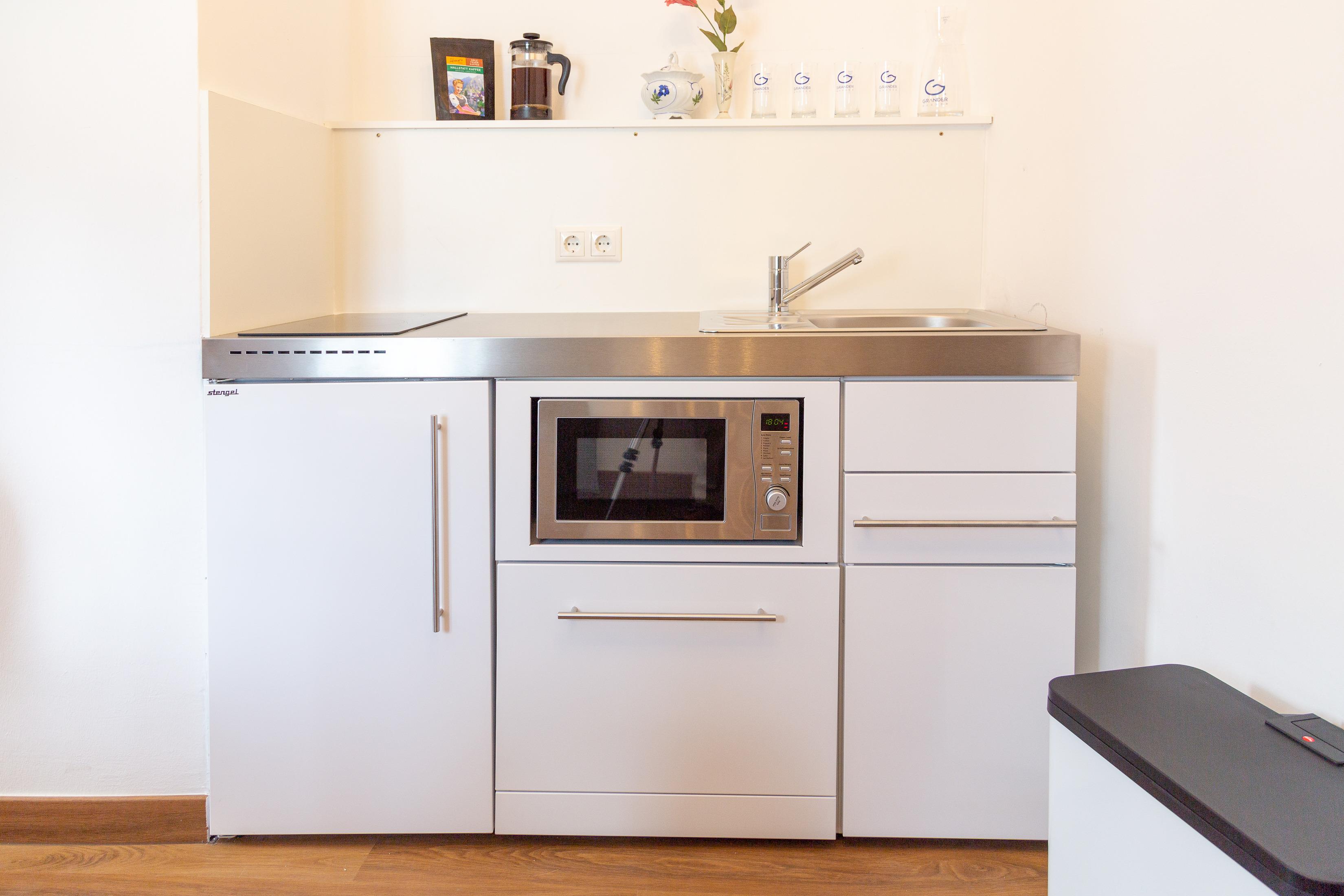 Der großzügige Wohnraum mit fantastischer Aussicht bietet eine vollständig ausgestattete Pantry-Küche inkl. Kühlschrank, Geschirrspüler, und Mikrowelle mit Backfunktion. Der Esstisch für bis zu 4 Personen und die Chaiselongue im Jugendstil machen dieses Apartment zu einem besonderen Juwel.
