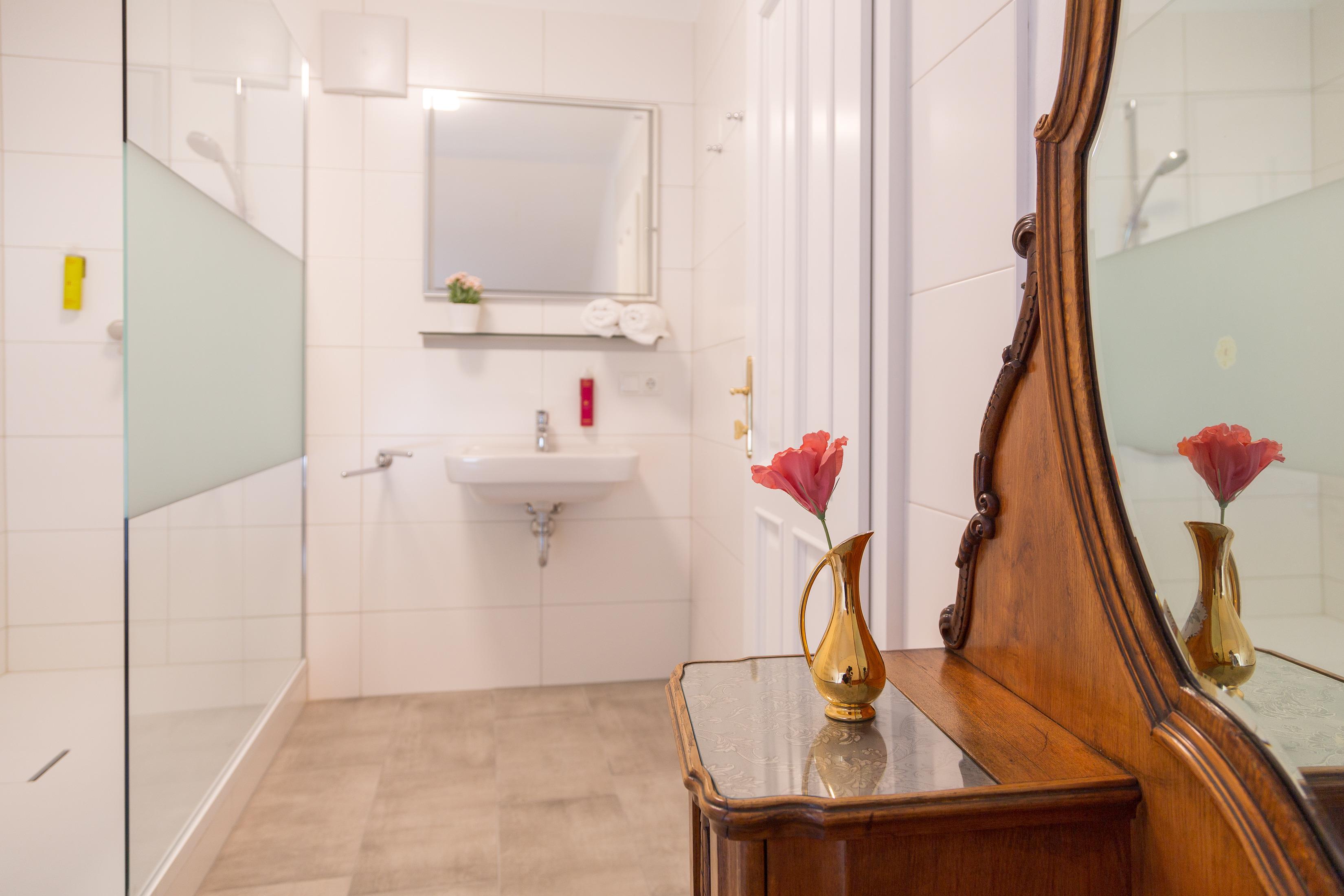 Das 2020 neu installierte Bad glänzt mit ’Walk-In' Dusche, Waschbecken, und sämtlicher Ausstattung inkl. Handtücher, Seife, Duschgel und Föhn. Genießen Sie Ihre ganz private Wohlfühloase und fühlen Sie sich durch den antiken Ankleidespiegel wie zu Sisi's Zeiten.