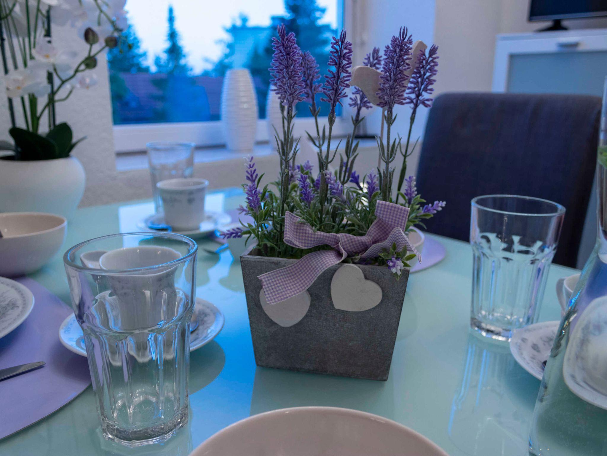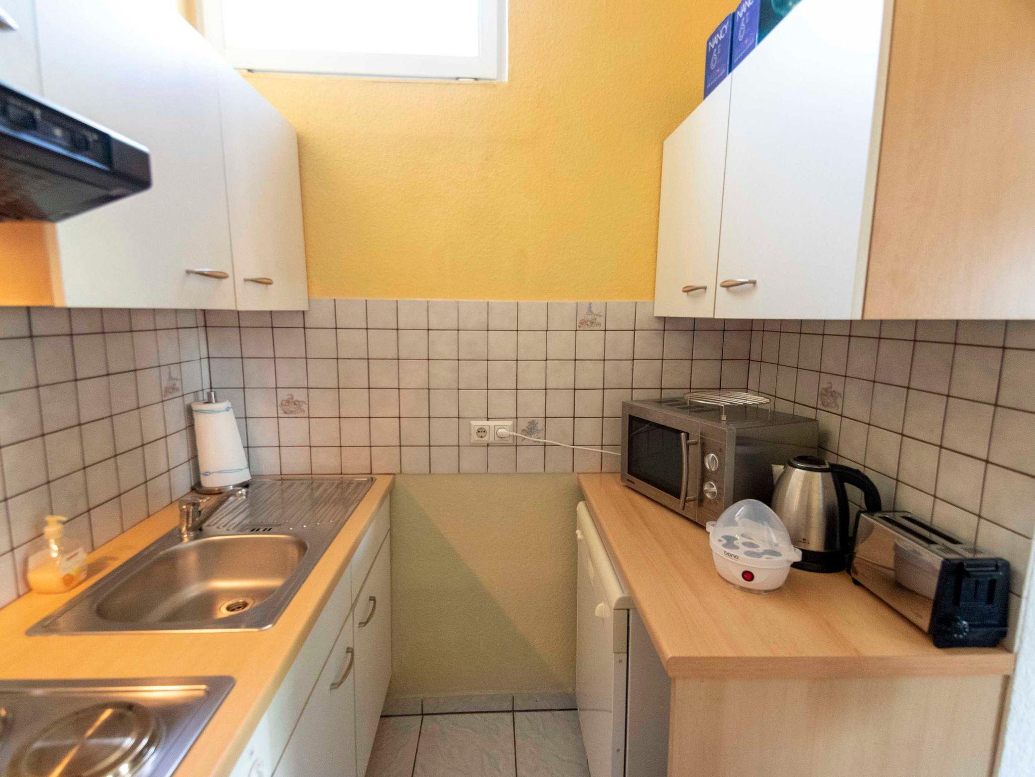 Die Küche ist komplett ausgestattet mit Herd, Backofen, Kühlschrank, Geschirrspüler, Mikrowelle, Nespresso-Kaffeemaschine, Wasserkocher, Eierkocher und natürlich sämtlichem Geschirr, Weingläsern, Töpfen und Pfannen. Weiters ist hier auch eine Waschmaschine vorhanden.