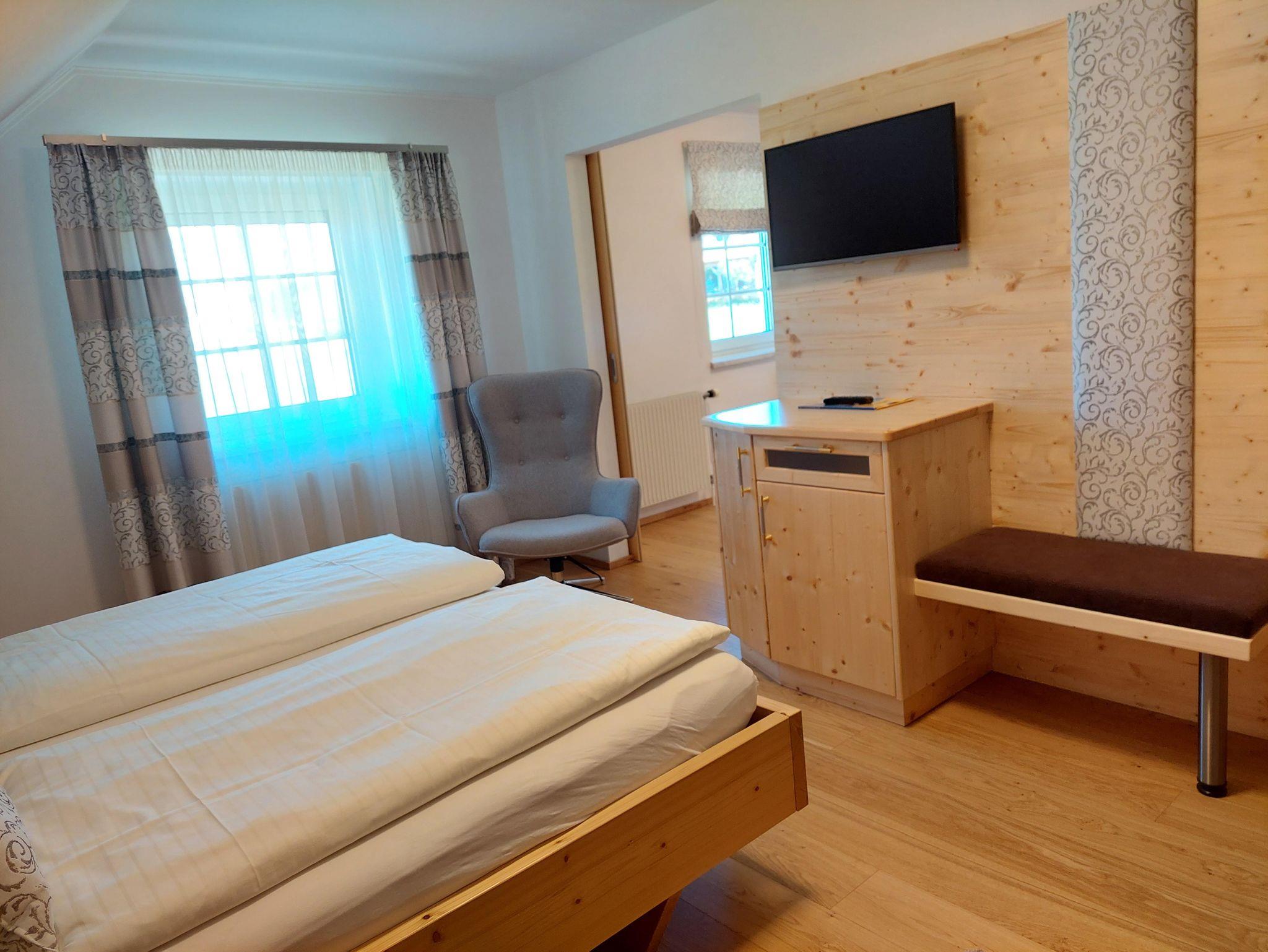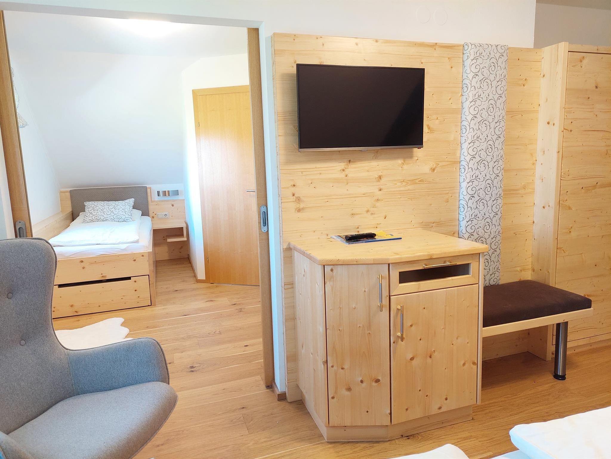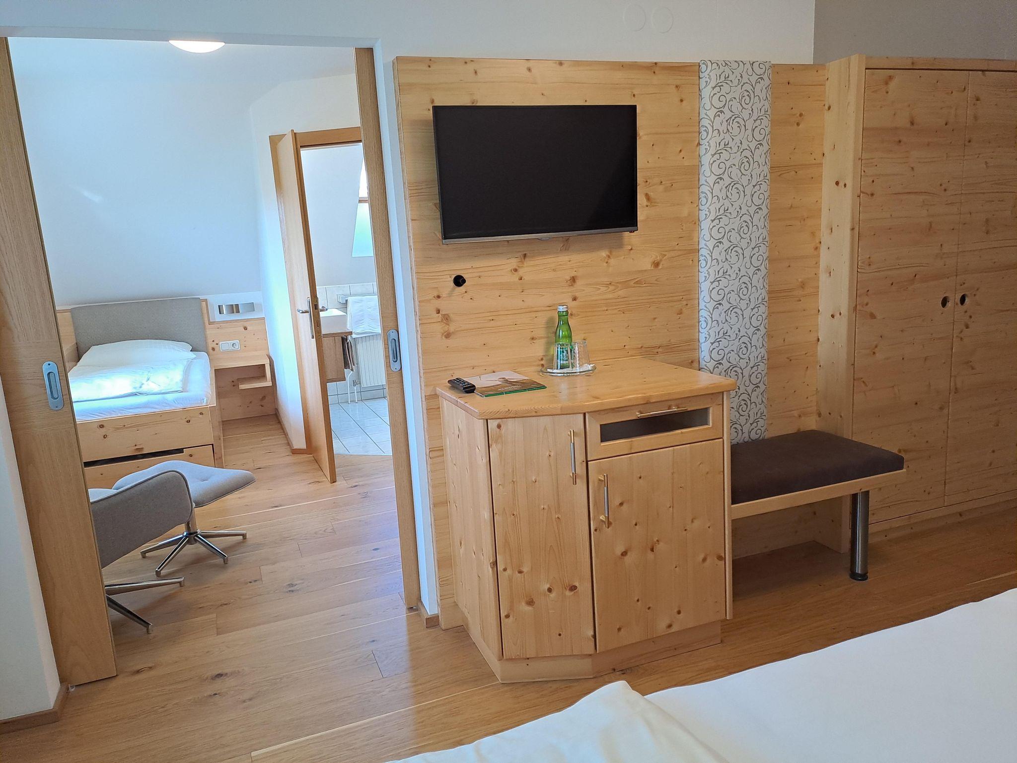 Das Familienzimmer oder auch Schnarcherzimmer genannt, ist mit zwei getrennten Schlafräumen im Vollholzmöbelstil ausgestattet.