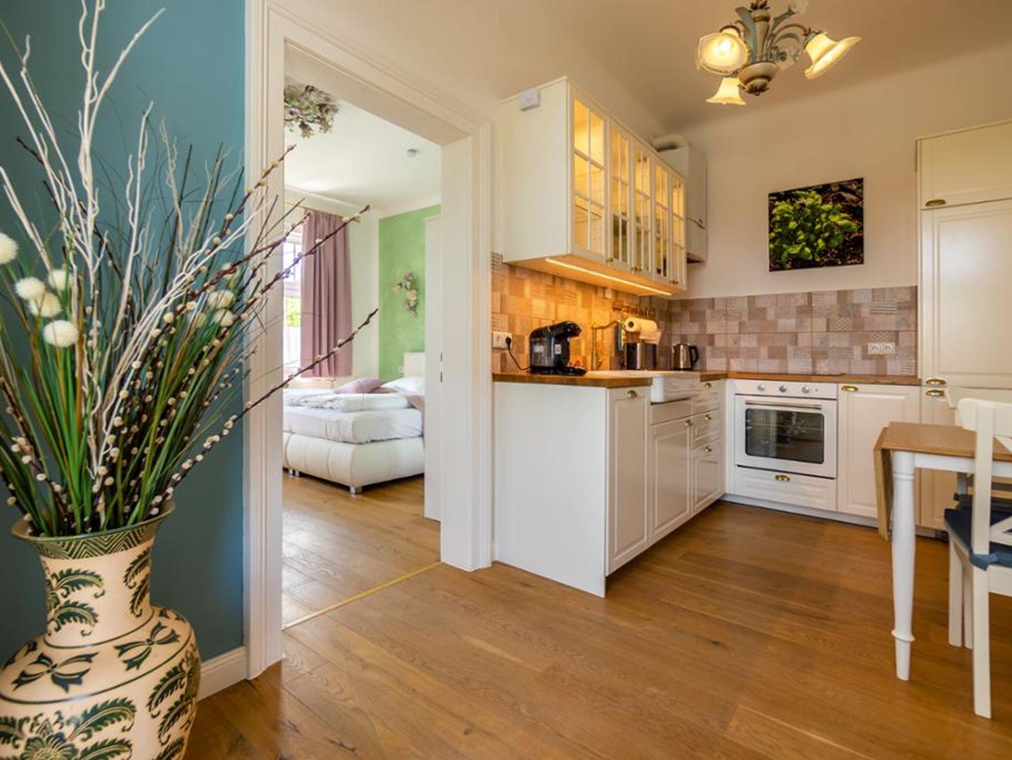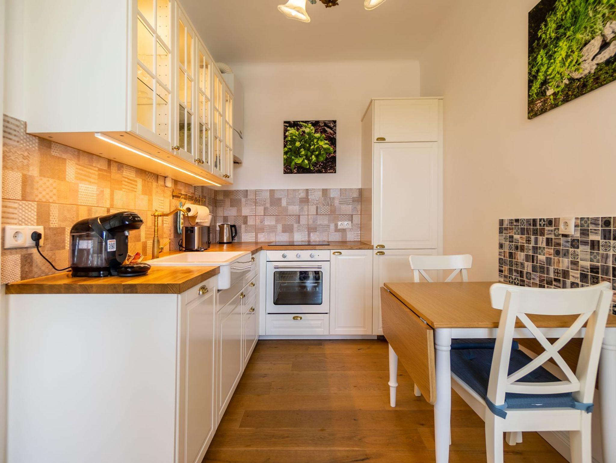 Apartment Lara im zweiten Obergeschoss überzeugt mit seinem kompakten, charmanten Grundriss auf ca. 35?m² und ist über eine traditionelle Pawlatsche erreichbar. Nach einem kleinen Eingangsbereich öffnet sich eine gut ausgestattete Küche, die in ein gemütliches Schlafzimmer mit komfortablem Doppelbett übergeht – ein idealer Rückzugsort für Paare oder Alleinreisende, die stilvolle Schlichtheit und behagliche Ruhe im Herzen des Hauses genießen möchten.