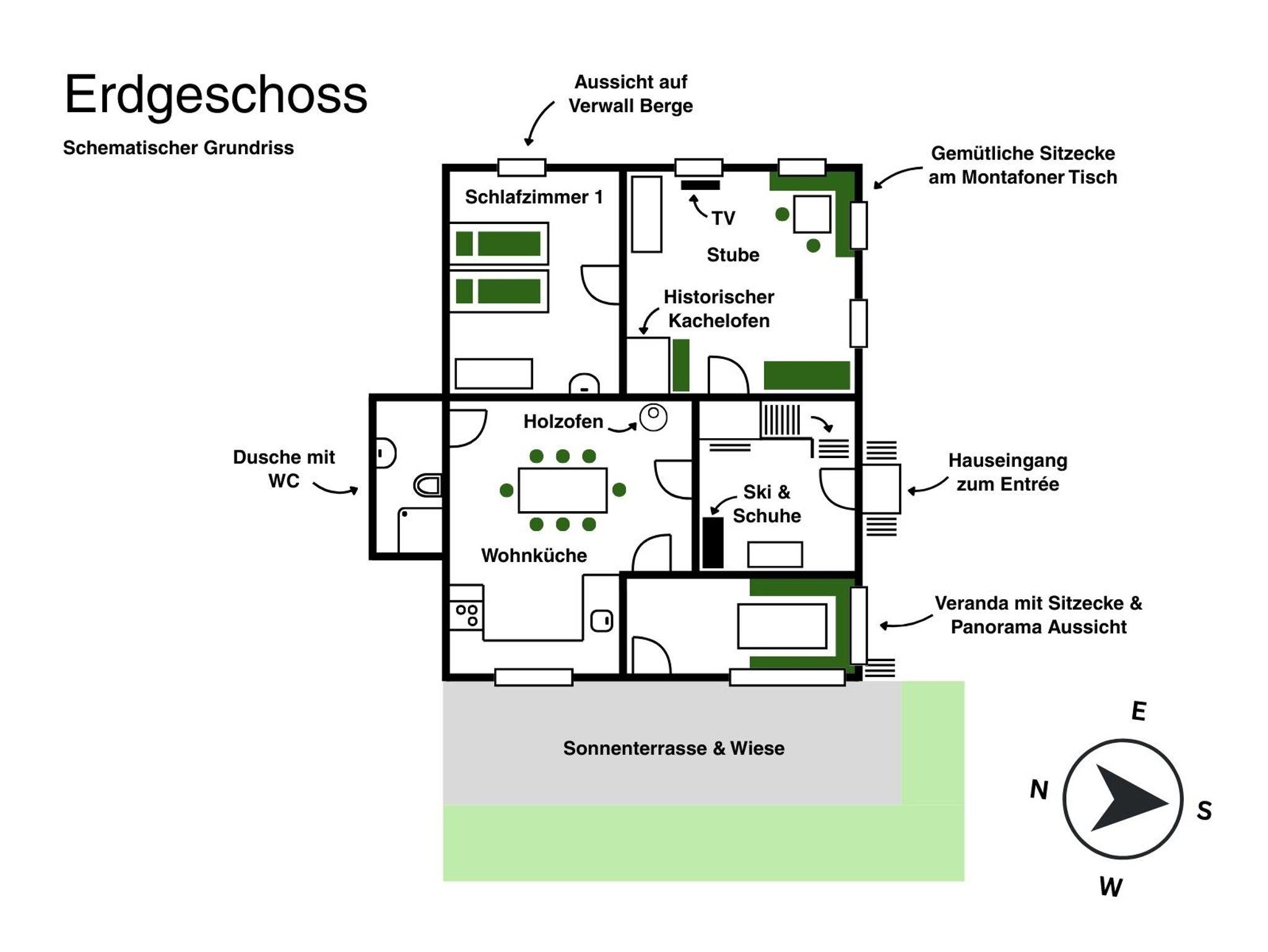 • Sonnenterrasse und Plätzchen in der Wiese rund ums Haus