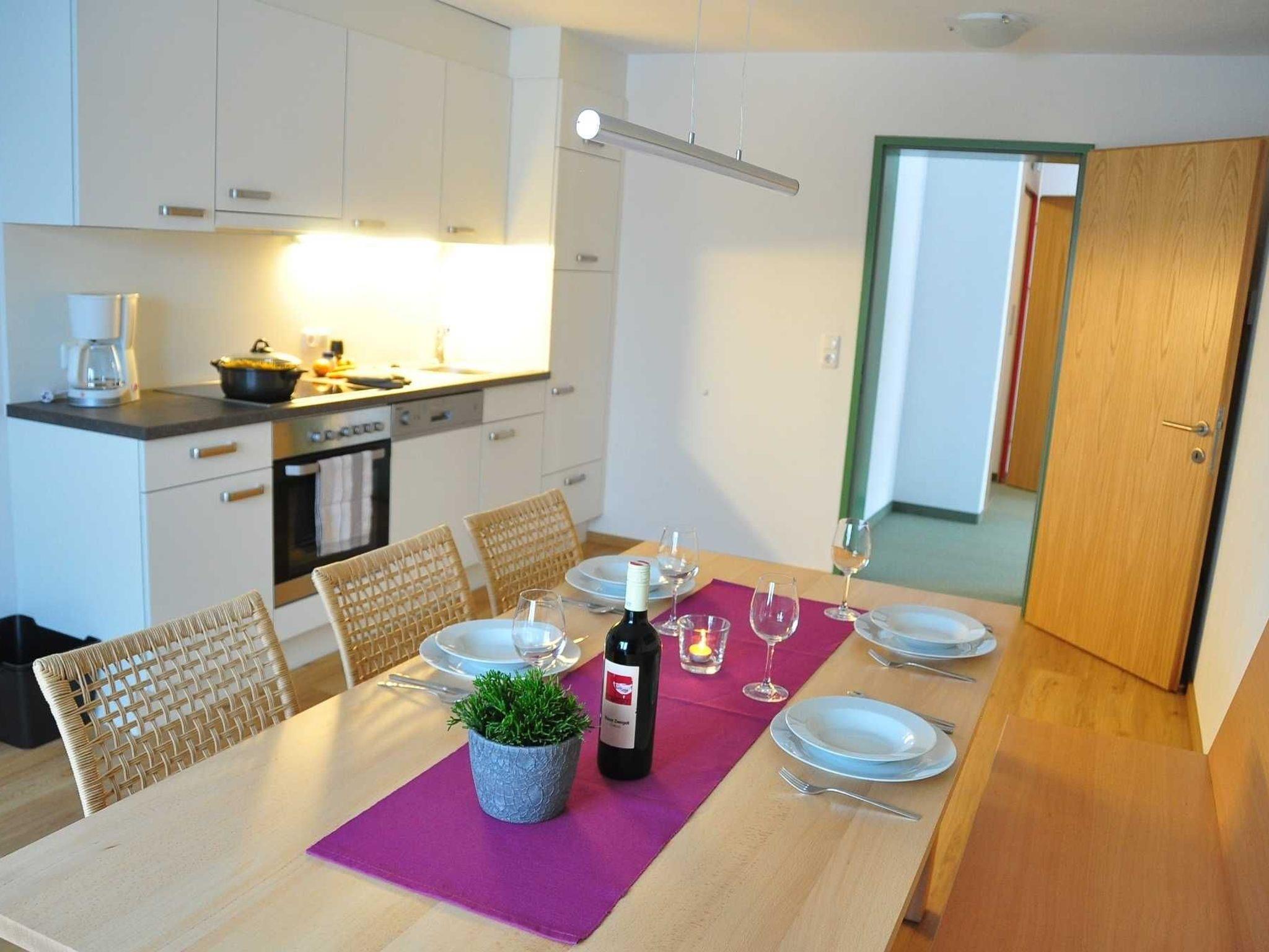 Ein Doppelzimmer mit Dusche, WC, Fön, TV, Safe und Balkon, ein Einzelzimmer mit Dusche, WC, Fön, TV und Safe. Moderne, voll ausgestattete Küche mit großem Esstisch, Cerankochfeld, Backofen, Mikrowellenherd, Spülmaschine, Couch, TV und Ost-Balkon.