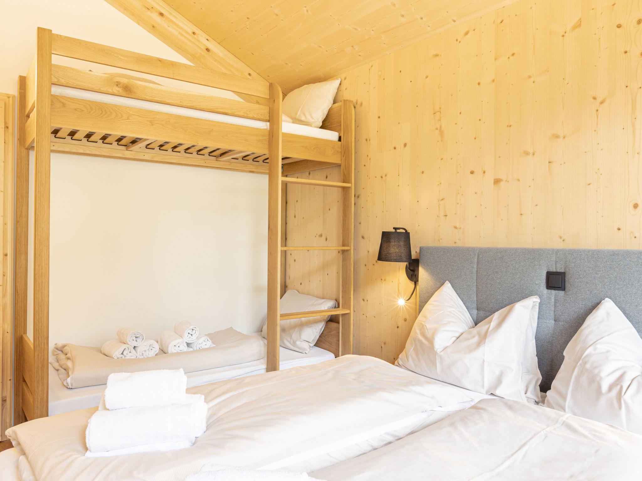 "Superior mit 4 Schlafzimmern & Wellness", 5-room chalet 130 m2. Bright, modern and tasteful furnishings: living/dining room with dining table and satellite TV. 2 double bedrooms. 1 double bedroom with 1 x 2 bunk beds. 1 double bedroom with shower/WC. Open kitchen (oven, dishwasher, 4 ceramic glass hob hotplates, freezer, electric coffee machine). 2 showers/WC, sep. WC. Terrace. Terrace furniture. Beautiful view of the countryside. Facilities: sauna. Please note: non-smoking house. The property is one of a type of property or apartment. The chalets have a small indoor sauna and an outdoor bathtub with bubble function.