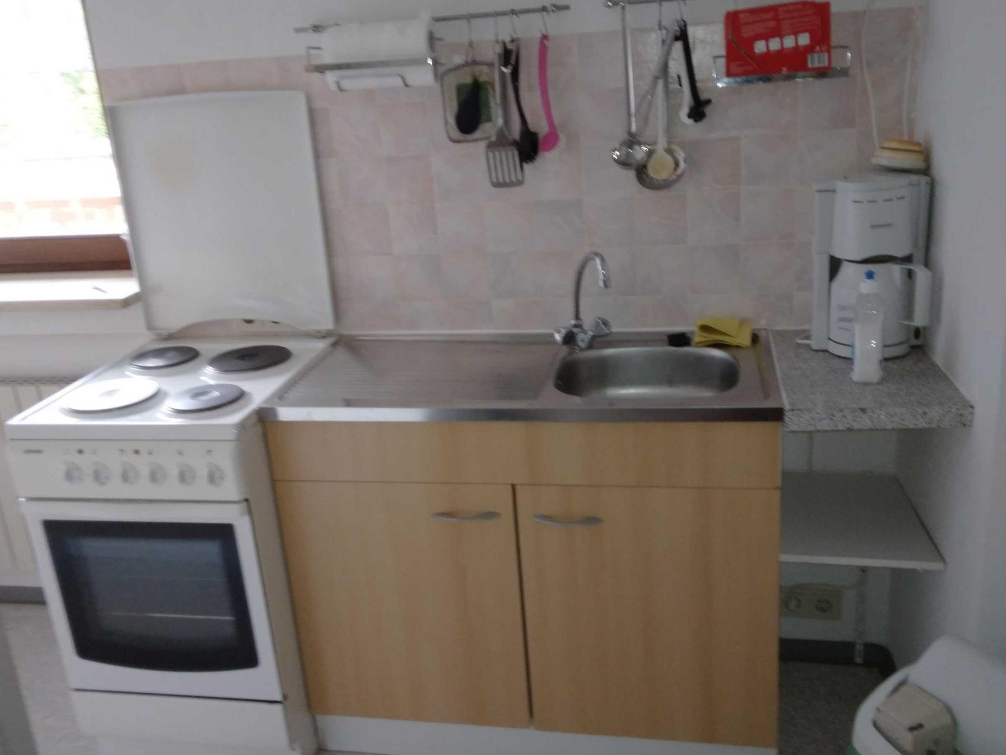 Ferienwohnung mit Dachschräge im 2. Stock. Balkon mit Ausblick auf die Berge. Die Küche ist ausgestattet mit Backrohr, großem Kühlschrank, 4 Herdplatten und Spülbecken.