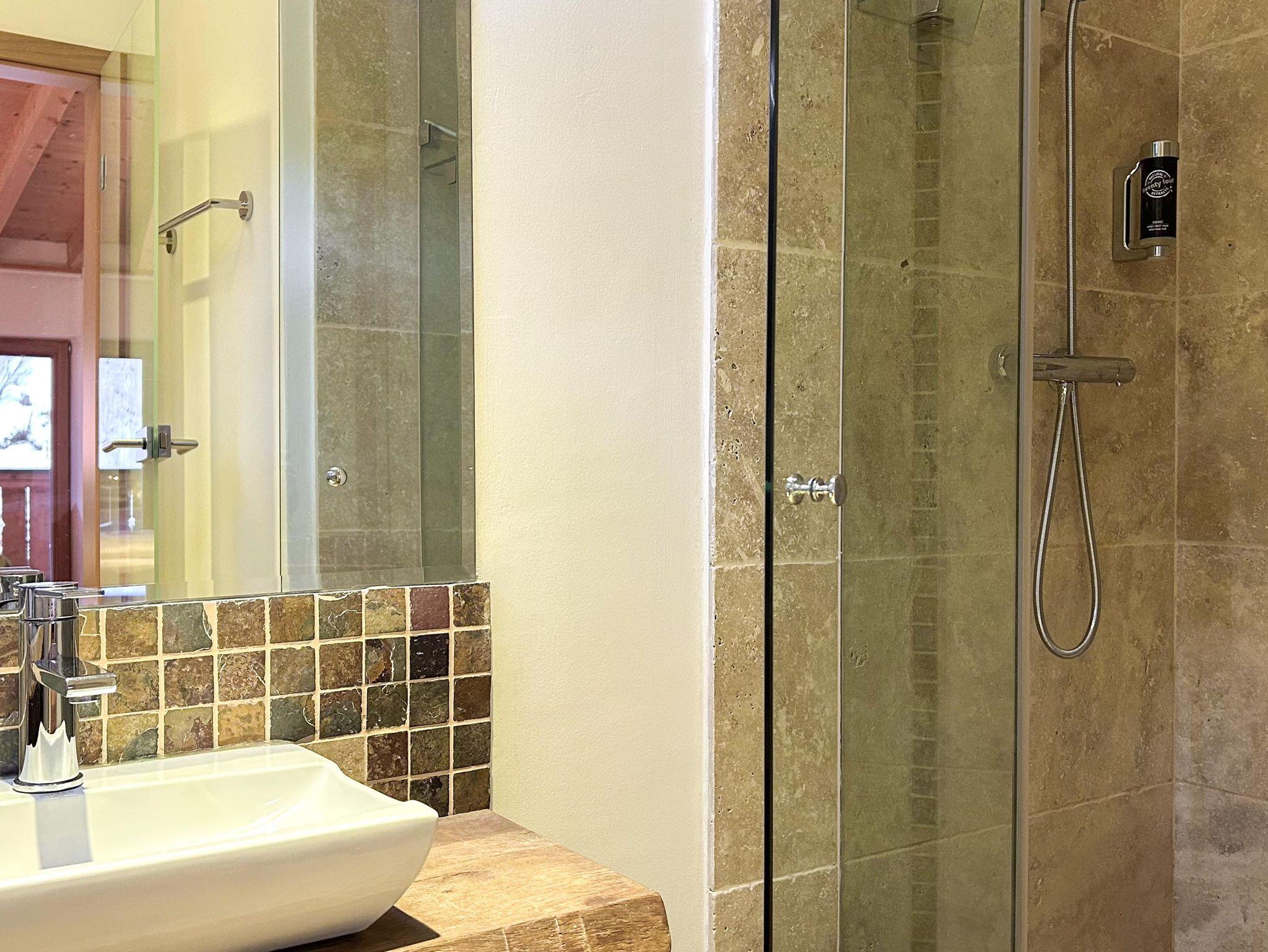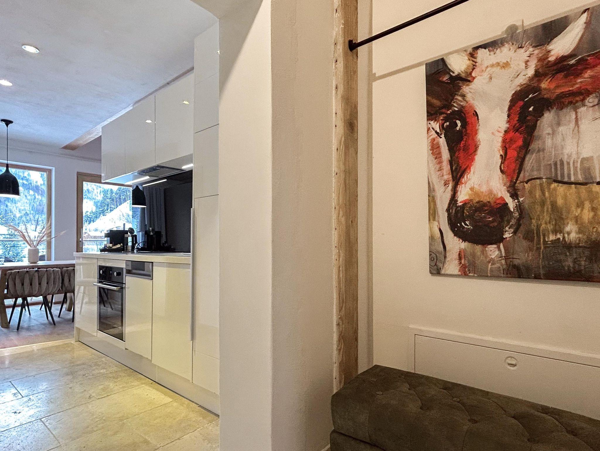 Familienfreundliches Apartment mit großem Schlafzimmer und eigenem Bad sowie zwei kleineren Schlafzimmern. Ein zusätzliches Bad mit WC und Dusche bietet extra Komfort. Der helle Wohn-Essbereich mit voll ausgestatteter Küche, Sofaecke und Esstisch öffnet sich zum Balkon mit herrlichem Bergpanorama. Perfekt für Familien, die Entspannung und alpine Erlebnisse kombinieren möchten.