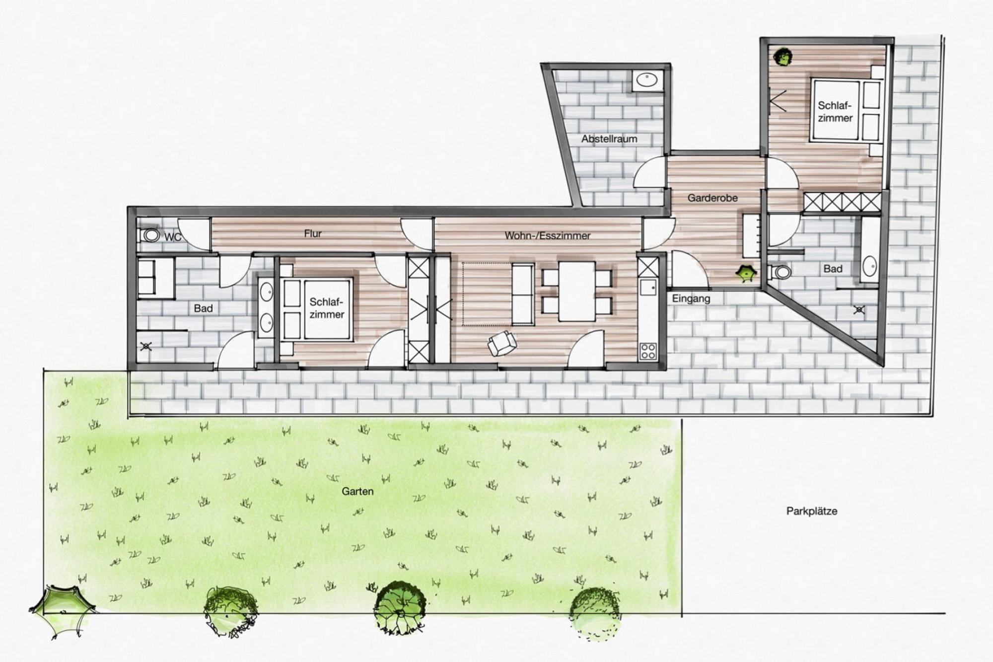 Ground floor: (open kitchen(hob(4 ring stoves, ceramic), electric kettle, toaster, coffee machine, oven, grill, combination microwave, dishwasher, fridge-freezer), Living/diningroom(double sofa bed, TV, seating area), bedroom(double bed, TV(satellite, german television channels)), Bedroom with bathroom(double bed, TV(satellite, german television channels), shower, toilet), bathroom(shower, private infrared cabin), toilet, grill, infrared sauna, washing machine, garden, bicycle storage, garden furniture)