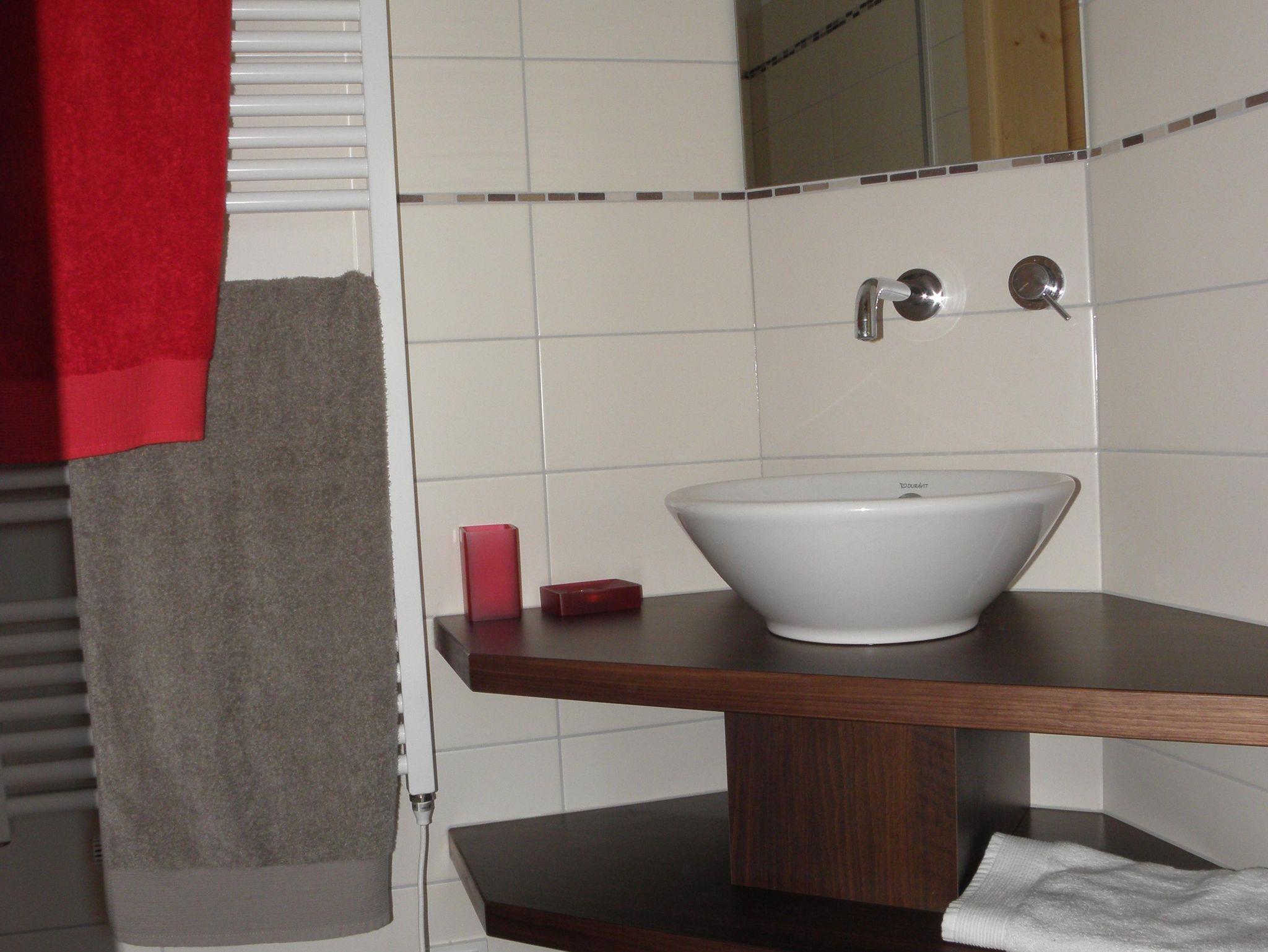 Badezimmer mit Bad, Dusche, Waschtisch, Toilette und Badetuchtrockner