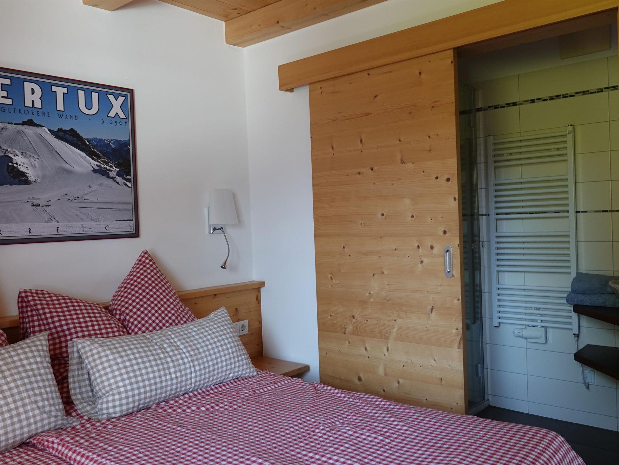 Schlafzimmer mit Doppelbett und ensuite Dusche mit Waschtisch