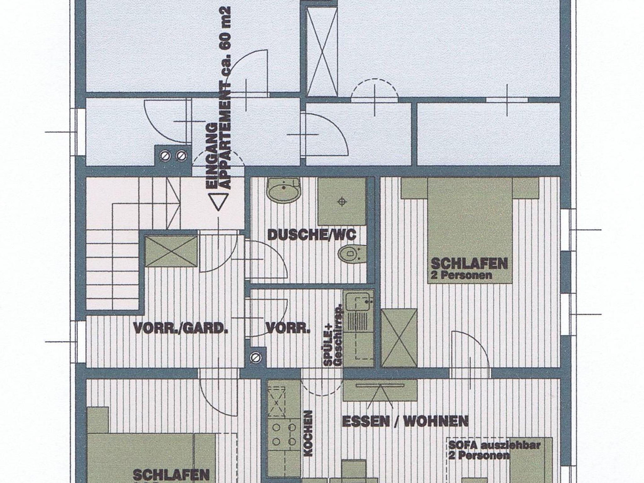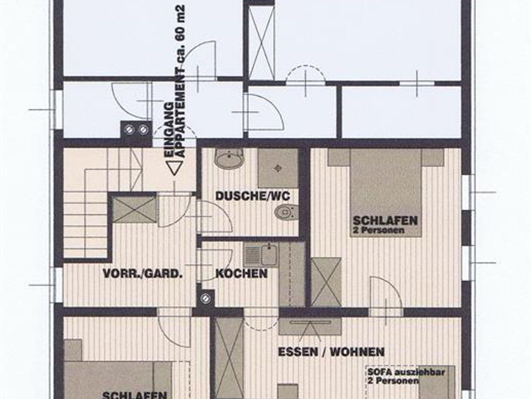 Unser neu renoviertes Appartement (ca. 60 m²) für 2-6 Personen besteht aus einem großem Wohnraum mit Kochnische mit Geschirrspüler und ausziehbarer Schlafcouch für 2 Personen, 2 Doppelzimmer, DU/WC, TV, Vorraum, Balkon,...