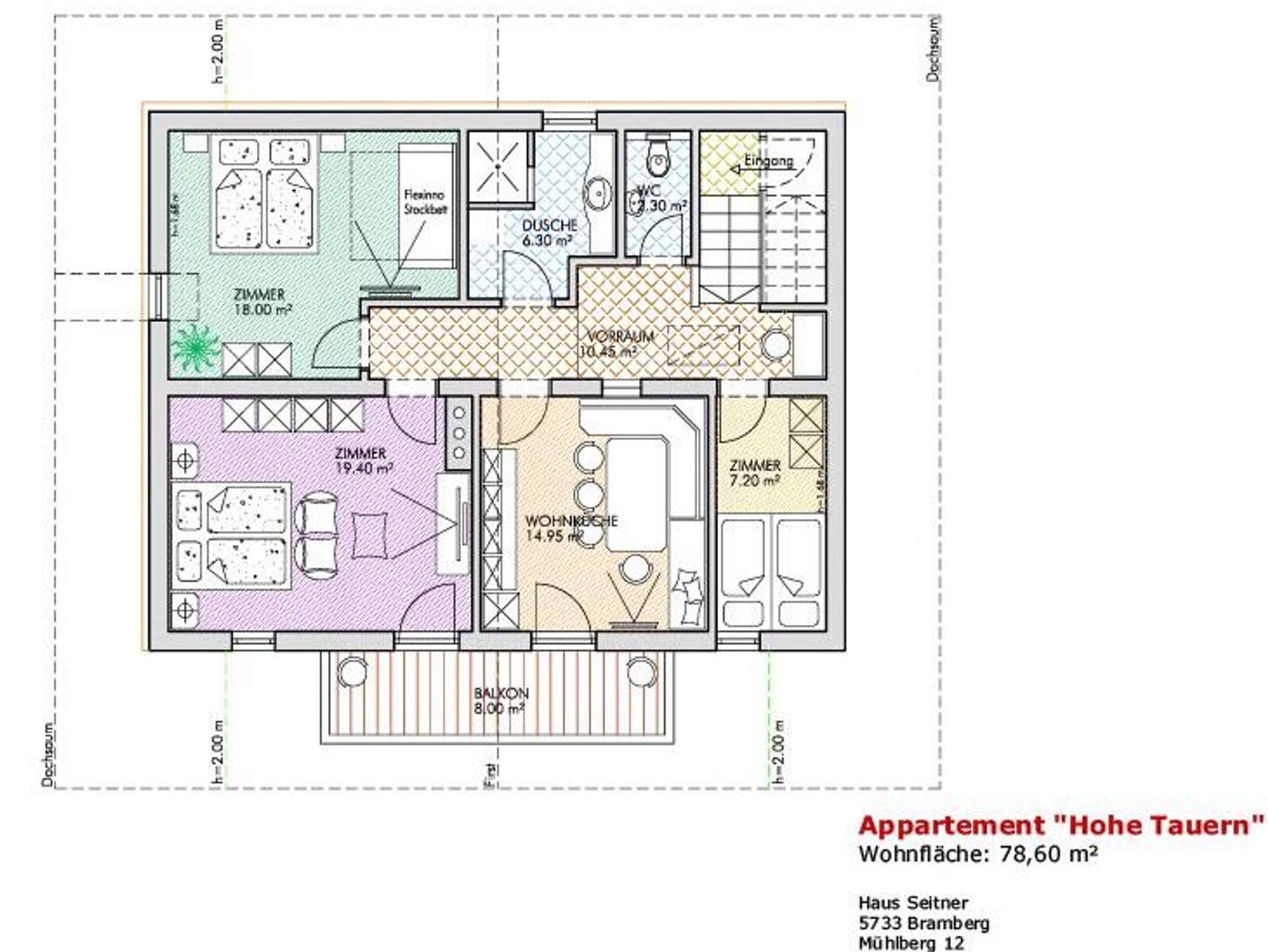 Die Ferienwohnung Hohe Tauern hat eine Größe von 78,60 m² und besteht aus einer gemütlichen Wohnküche mit Geschirrspüler, 2 Doppelzimmer, 1 Kinderzimmer, Dusche, extra WC, Waschmaschine und einem Balkon mit Panoramablick.