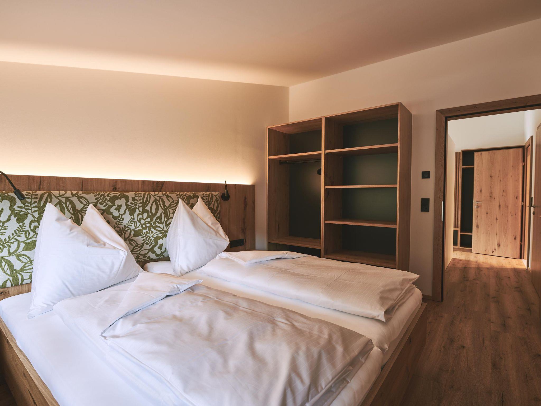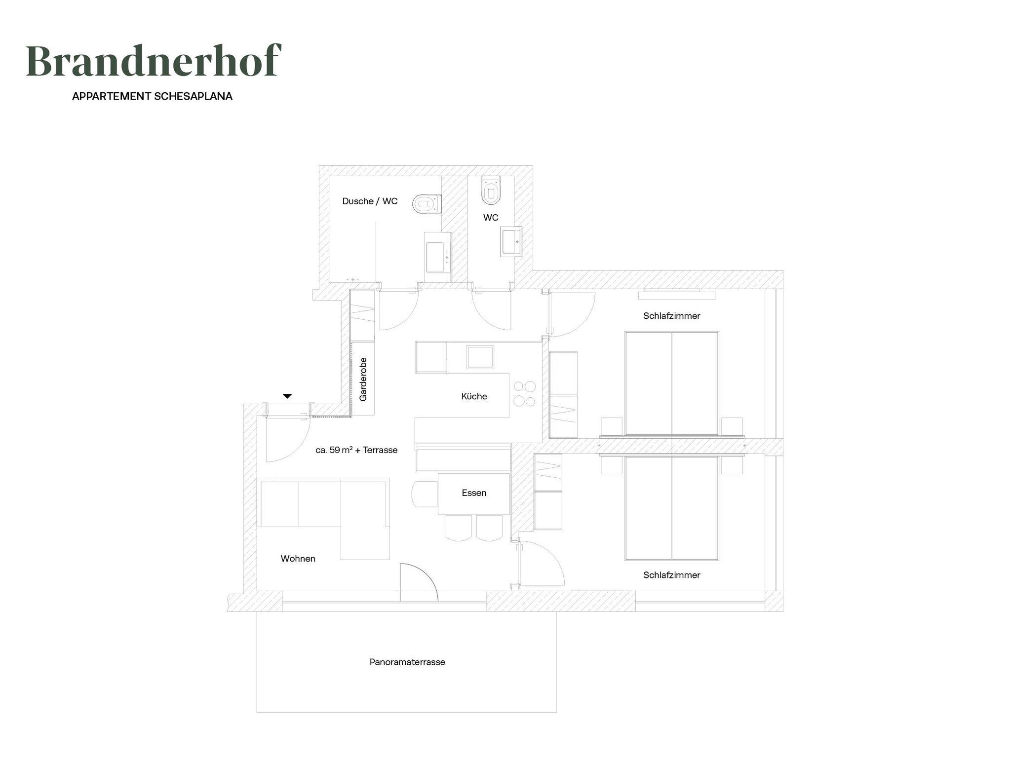 NATÜRLICHES WOHLBEFINDEN ERFAHREN Direkt an das Restaurant angrenzend befindet sich das 59 Quadratmeter große Appartement Schesaplana im OG2/EG und bietet Platz für zwei bis vier Personen. Ausgestattet mit einem kleinen Wohn-Essbereich, einer umso größeren südseitigen Panoramaterrasse mit Bergblick auf die Schesaplana die Königin des Rätikonmassivs, 2 Doppelzimmern, Badezimmer mit Dusche und WC sowie einem separaten WC. In der vollausgestatteten Küche befinden sich Geschirrspüler, Induktionskochfeld, Backofen und Kapsel-sowie Filterkaffeemaschine. Heimeliges Wohngefühl und viel Holz gibt es von uns gerne obendrauf!